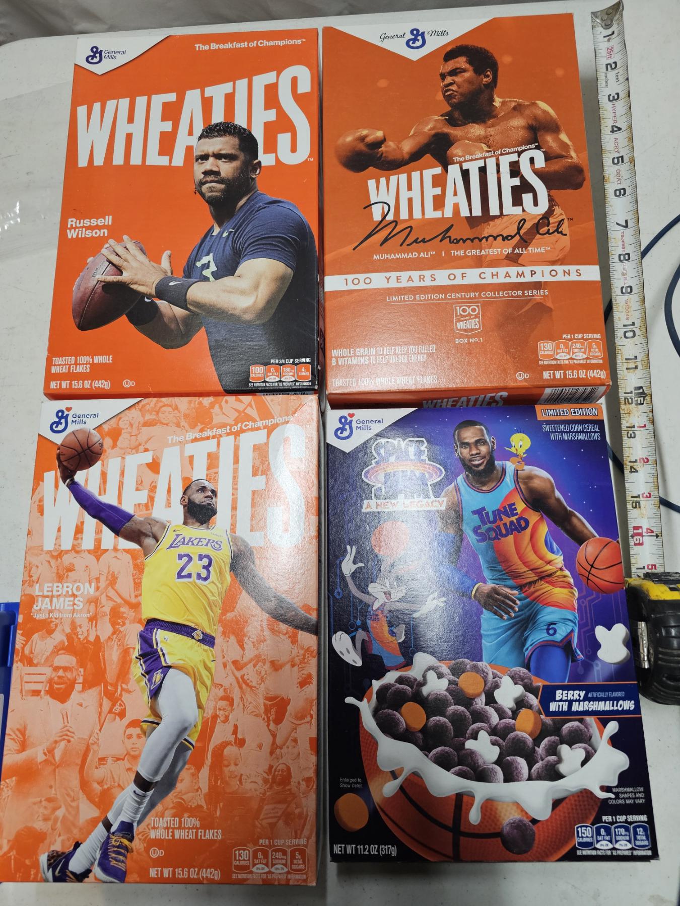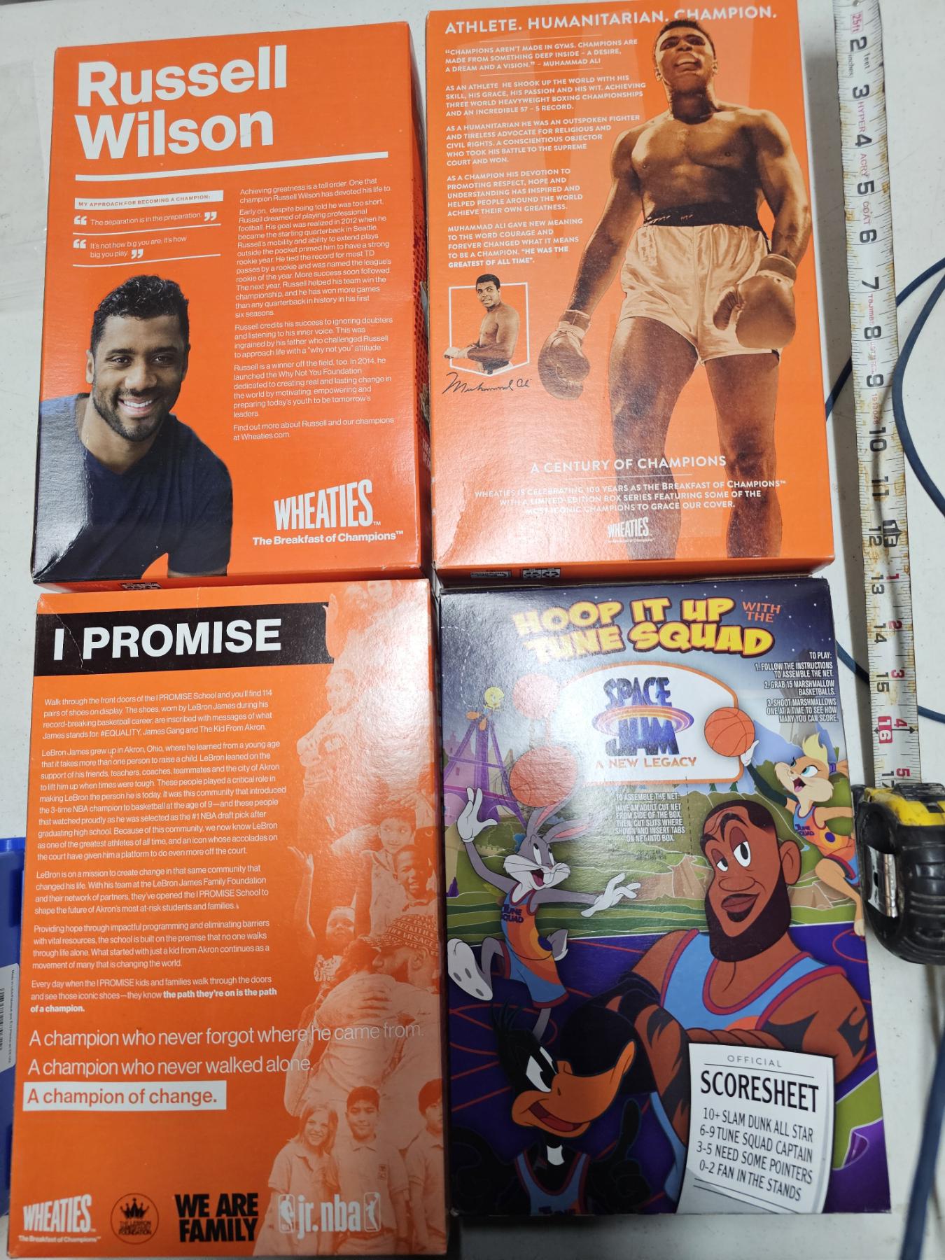 Sports Themed Cereal Boxes (for collection purposes) - Lot of (4) Boxes (Wheaties, Space Jam) Lebron James, Muhammed Ali, Russel Wilson. A GREAT COLLECTABLE SET FOR ANY SPORTS FAN!!!!