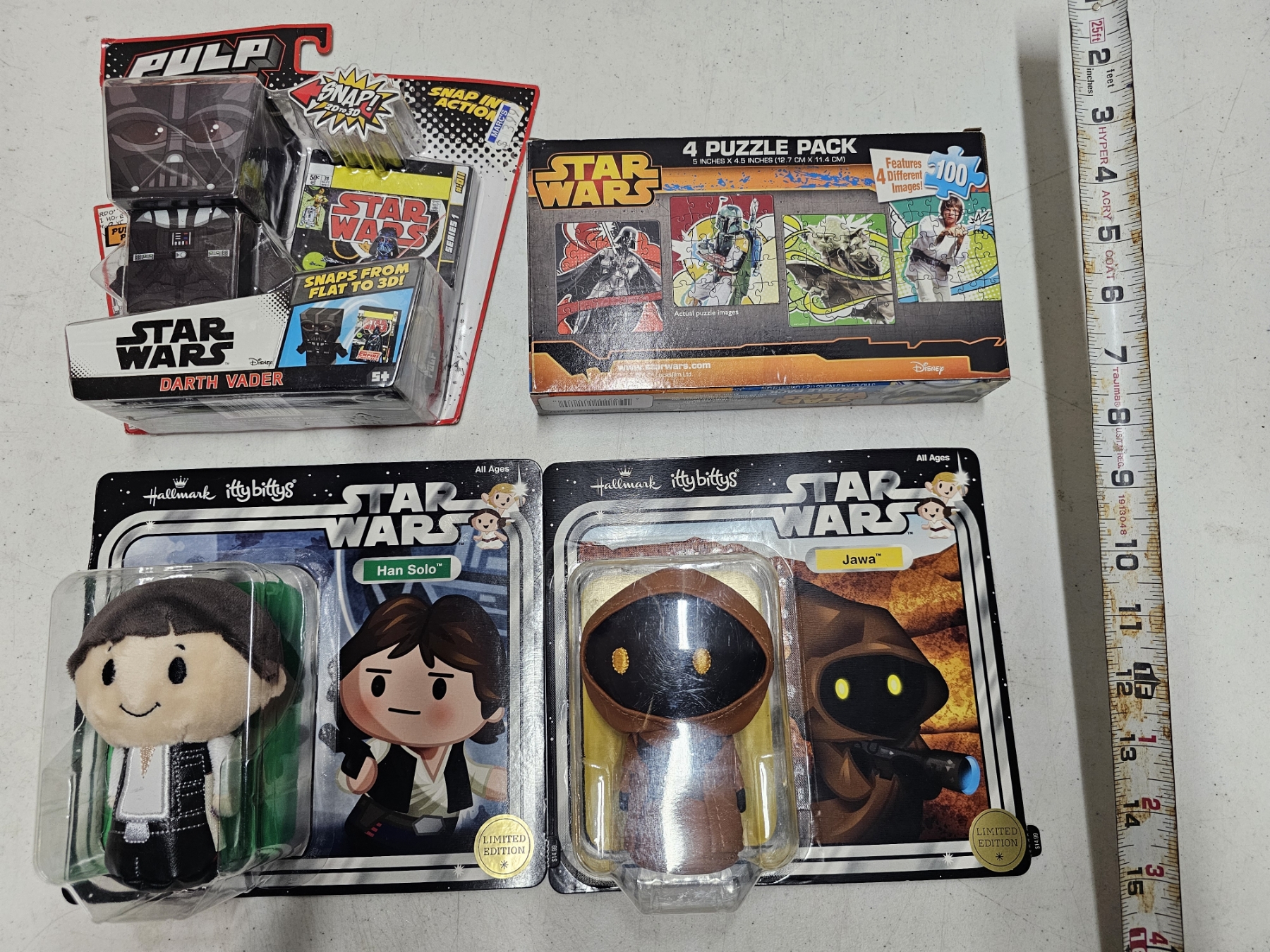 Star Wars Limited Edition Collectables and More!!! (Lot of 4) - Includes Limited Edition Jawa (Hallmark itty bittys Edition), Han Solo (Hallmark itty bittys Edition), Star Wars 4 Puzzle Pack, and Darth Vader (Pulp Heroes Snap Bot), ALL NIB!!! GREAT CONDITION!!!!