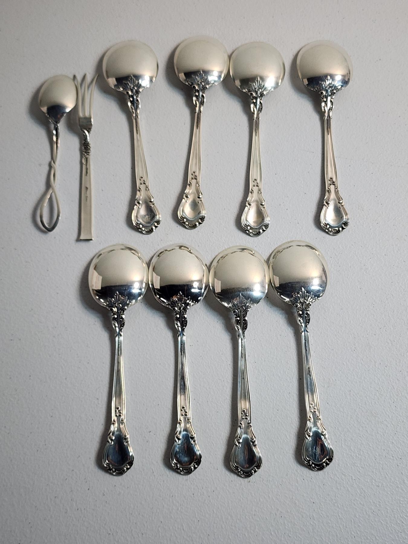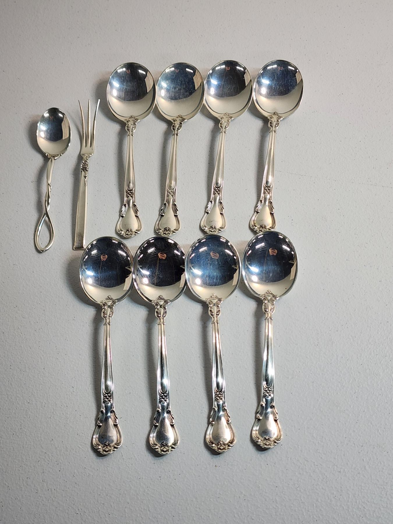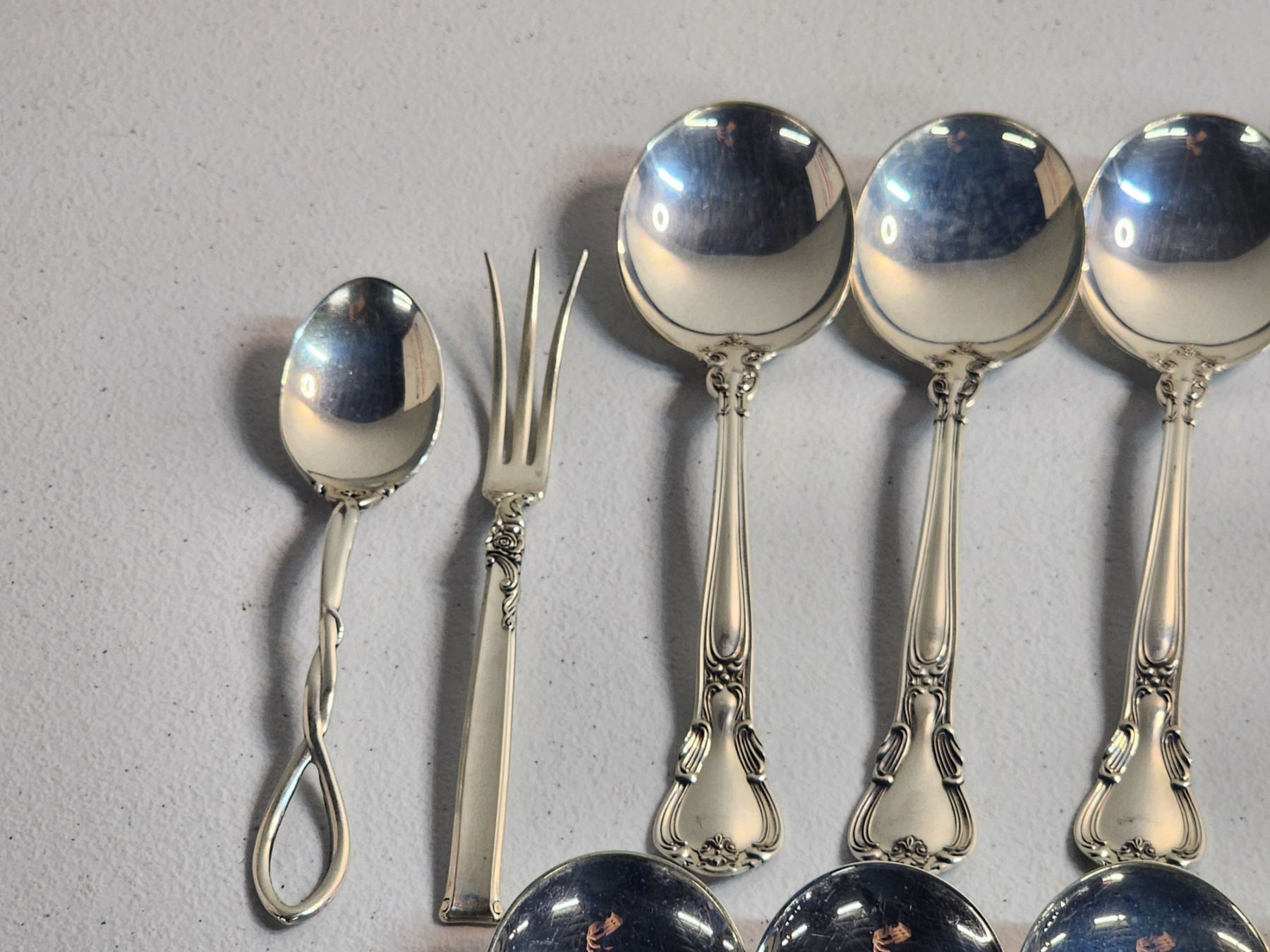 Assorted Sterling Silver Silverware: x8 Gorham Chantilly Soup Spoons, Heirloom Sterling "Silver Rose" Fork and Frank Whiting Rope Spoon