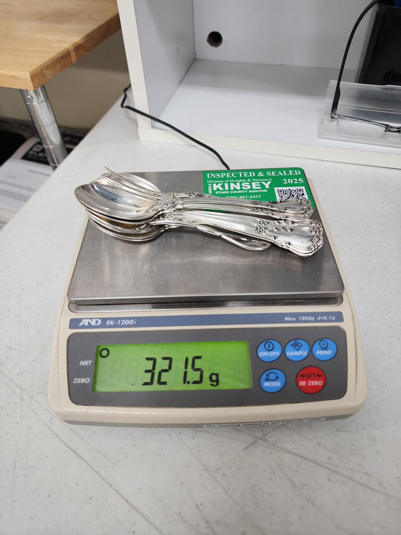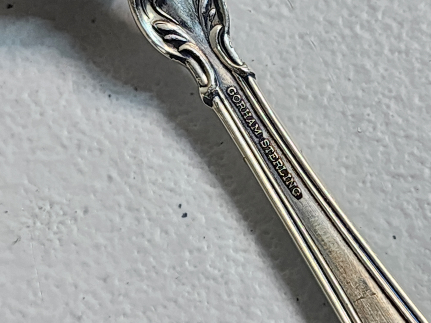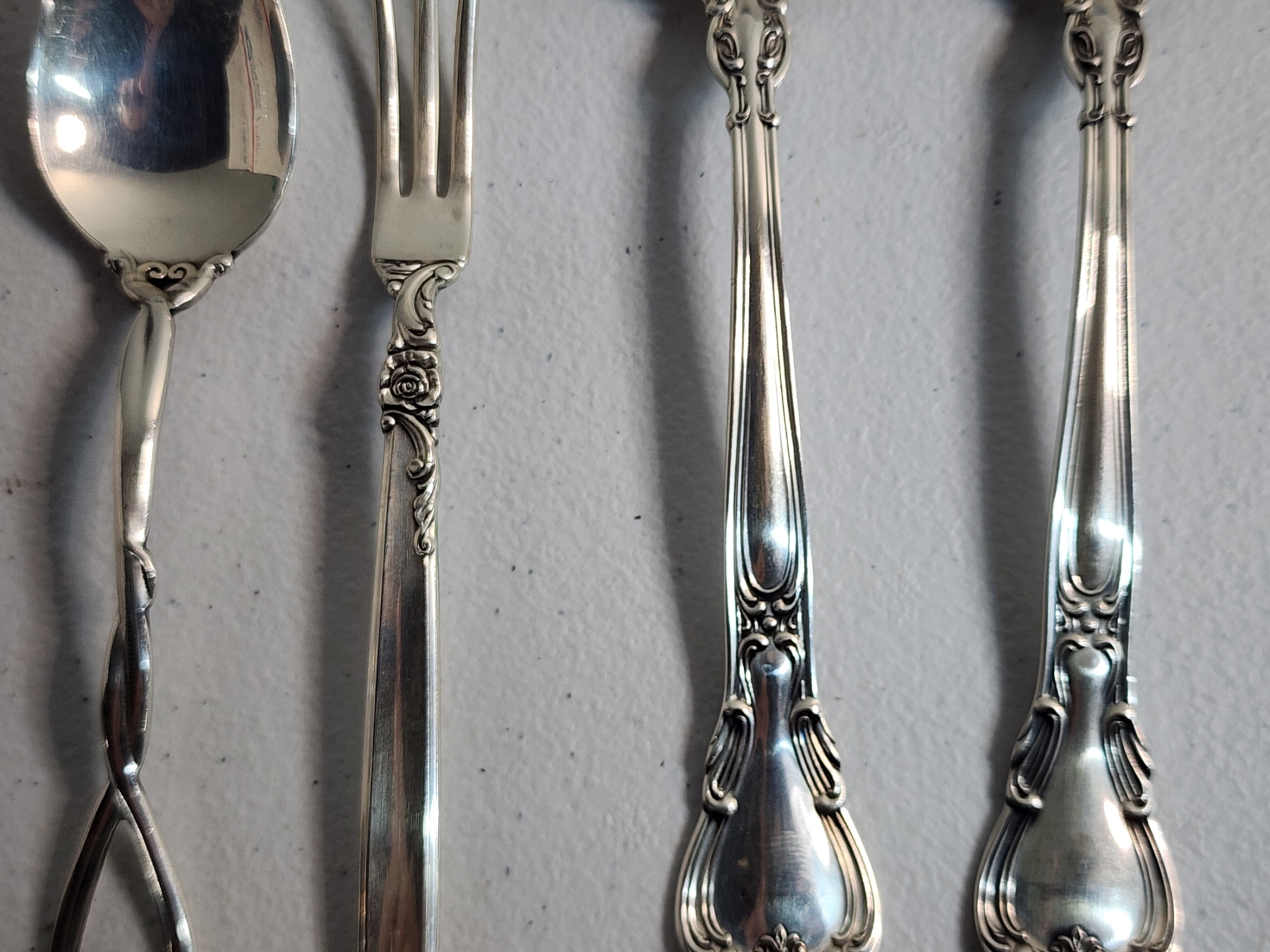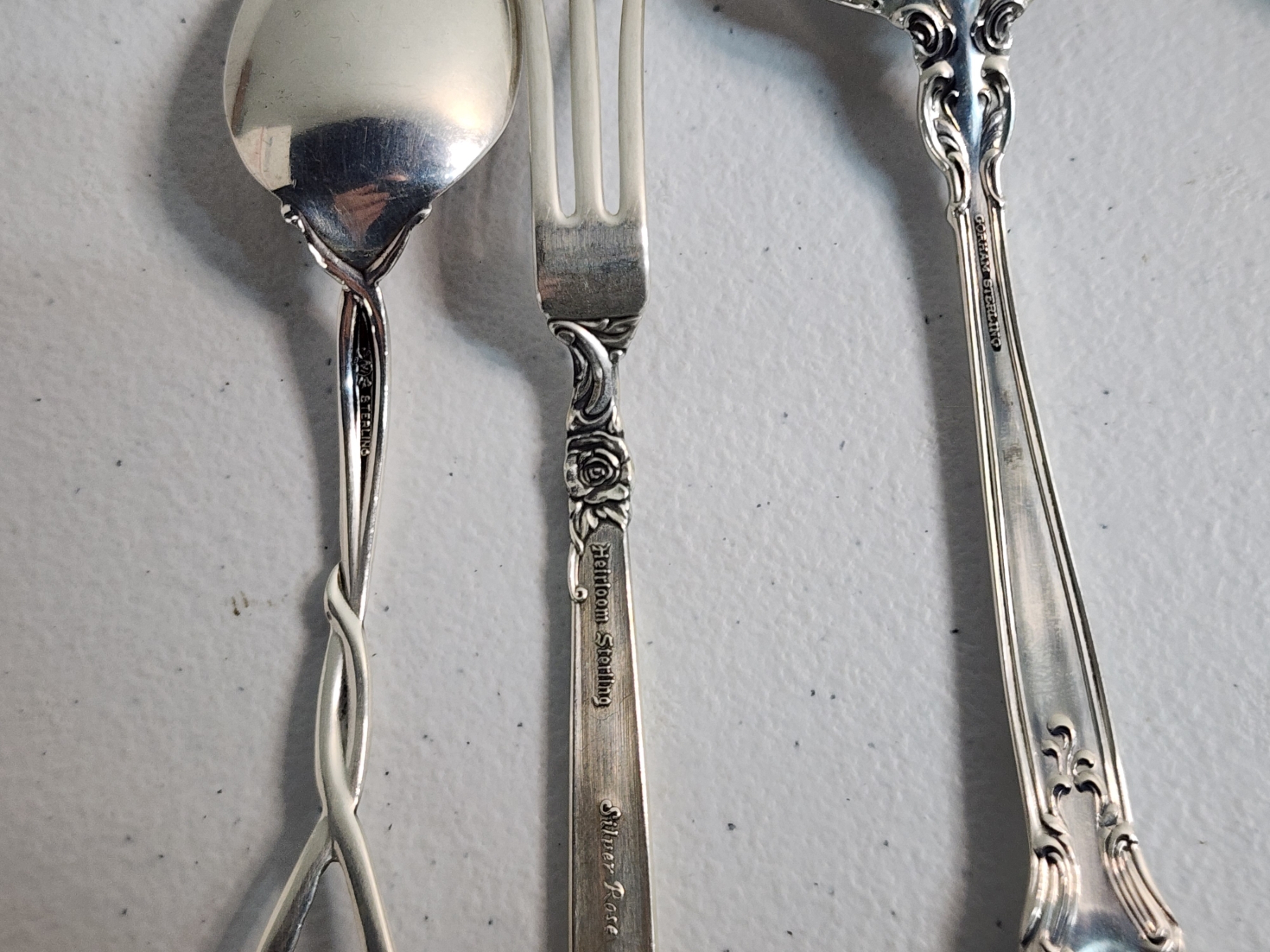 Assorted Sterling Silver Silverware: x8 Gorham Chantilly Soup Spoons, Heirloom Sterling "Silver Rose" Fork and Frank Whiting Rope Spoon