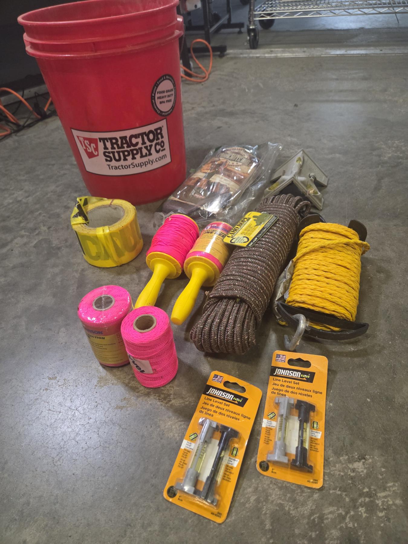 TSC 5 Gallon Bucket, Bucket Bag, Line Reels And String, Caution Tape, Corner Level, 75ft Poly Rope,