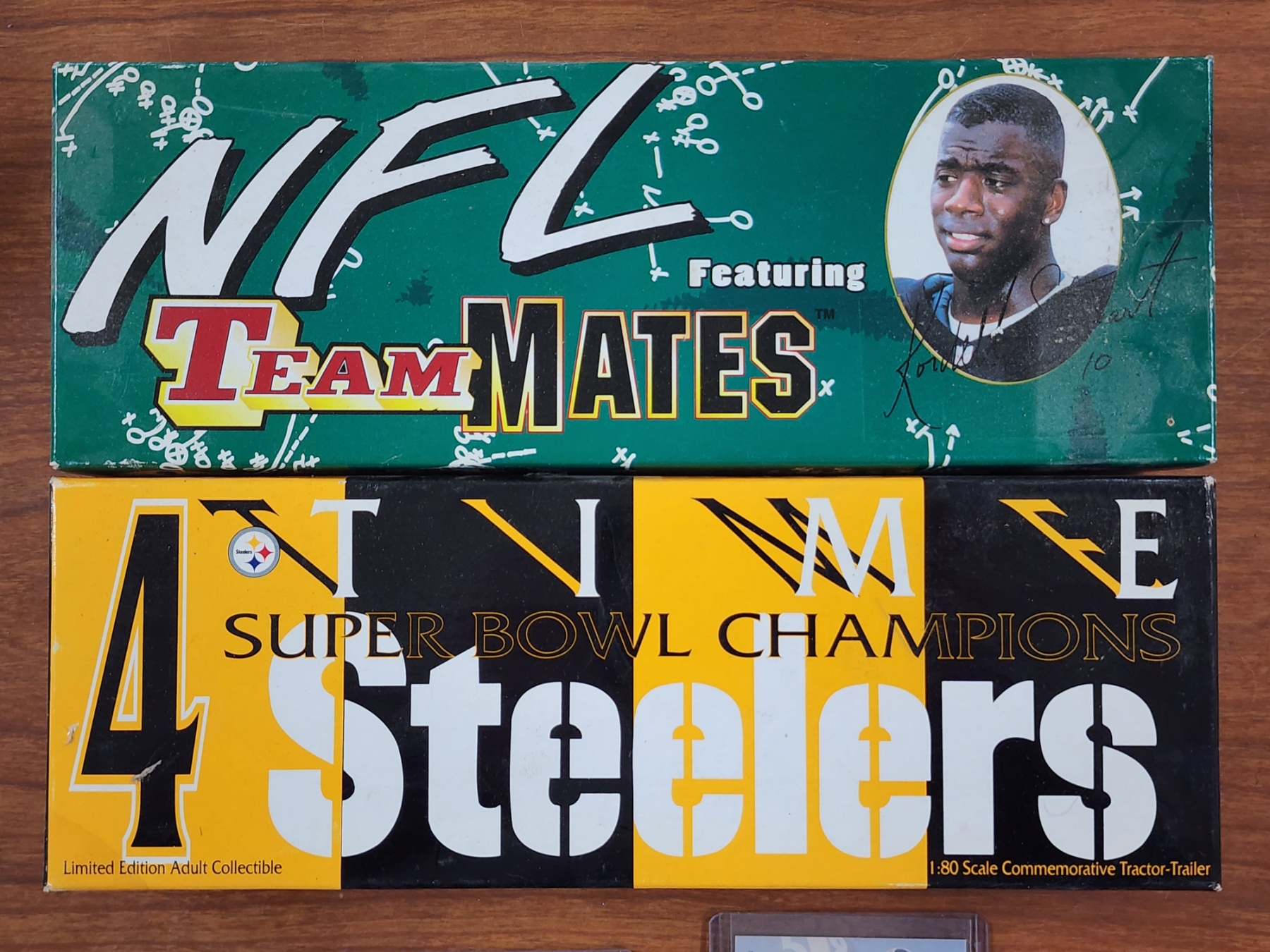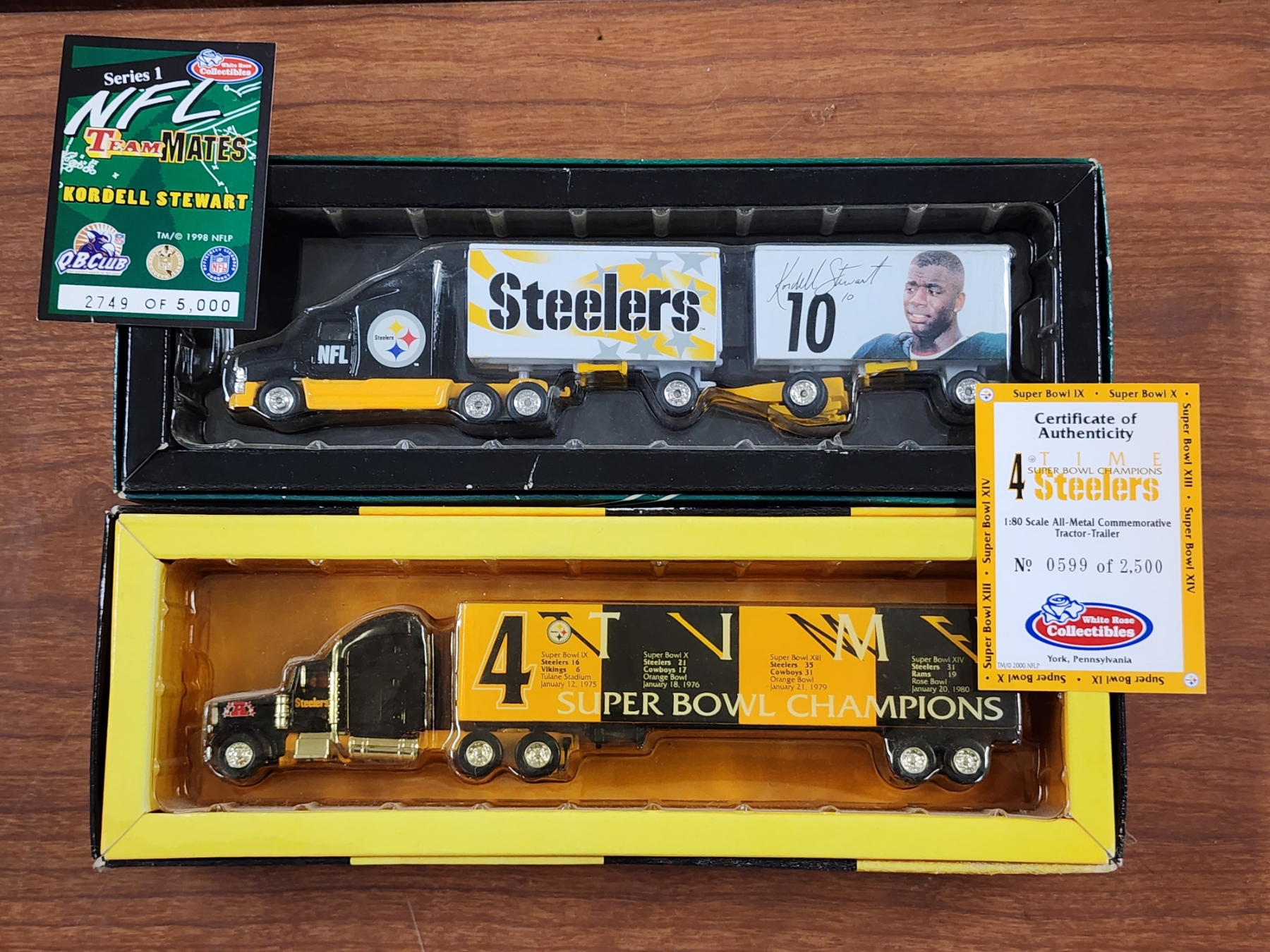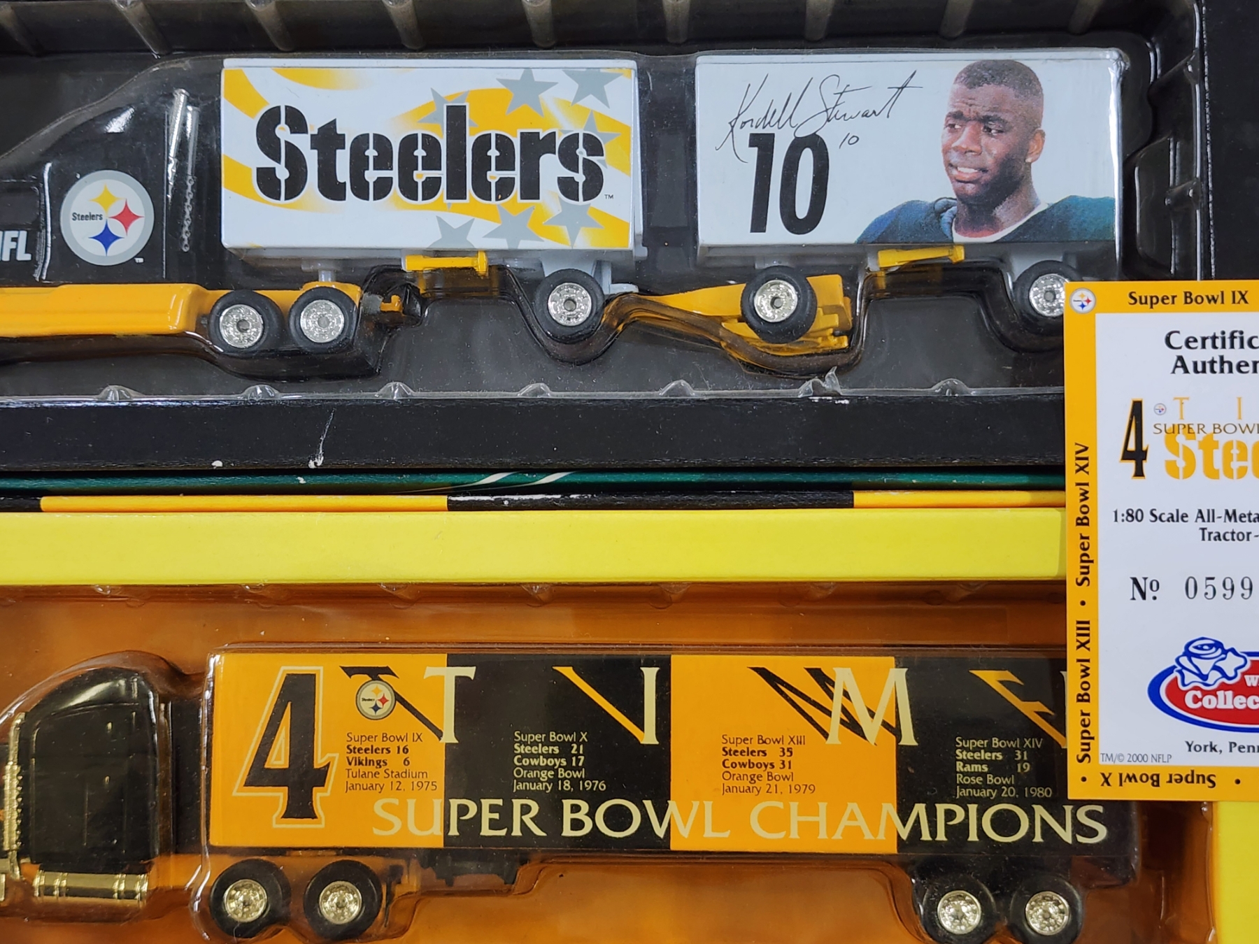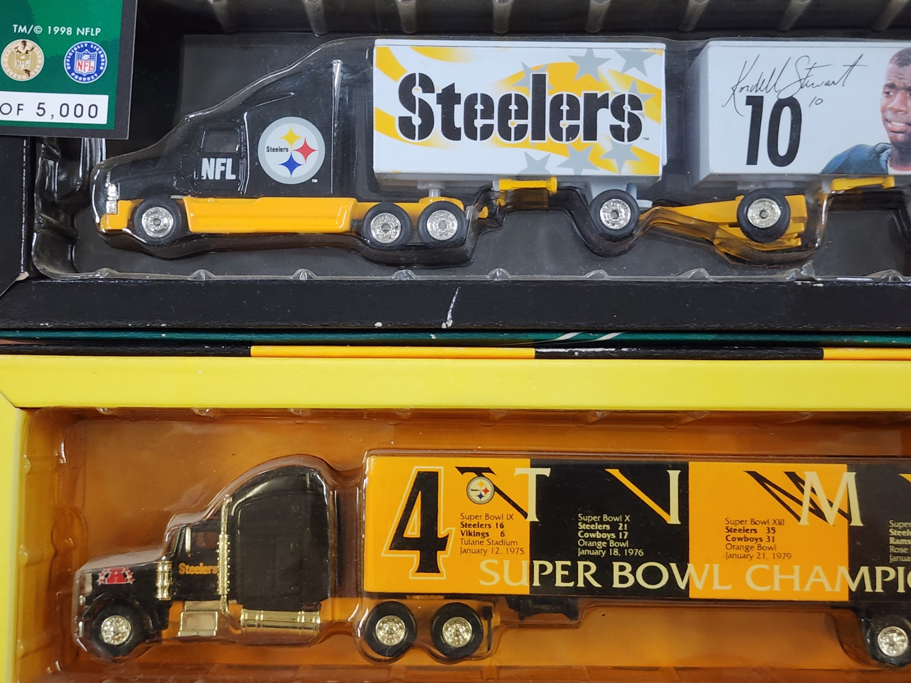 TWO NEW IN BOX Officially Licensed NFL Pittsburgh Steelers Limited Edition Truck & Trailer Toys With Two Trading Cards
