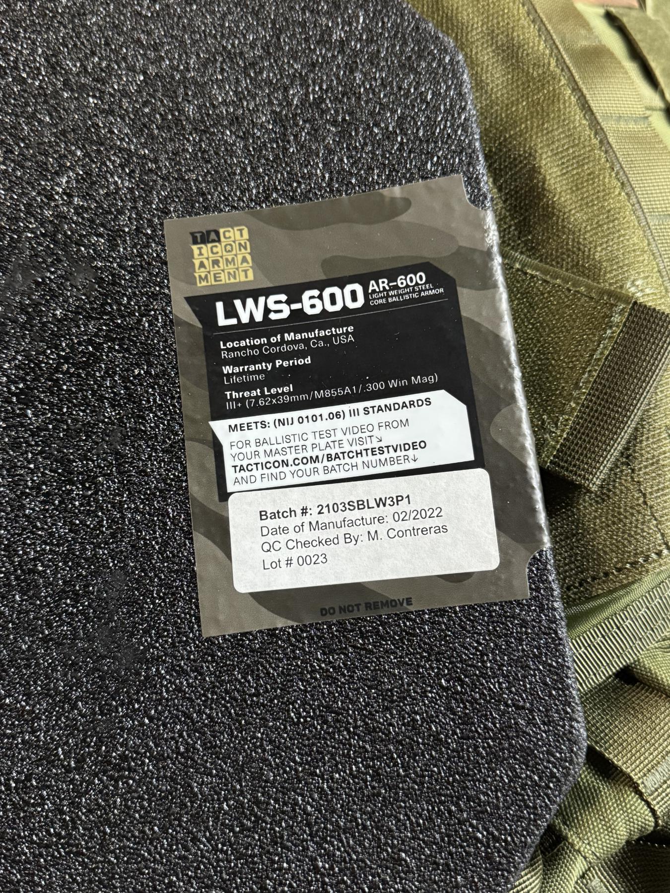 Tacticon Armament BattleVest Plate Carrier Vest LWS-600 AR-600 Lightweight Steel Plates