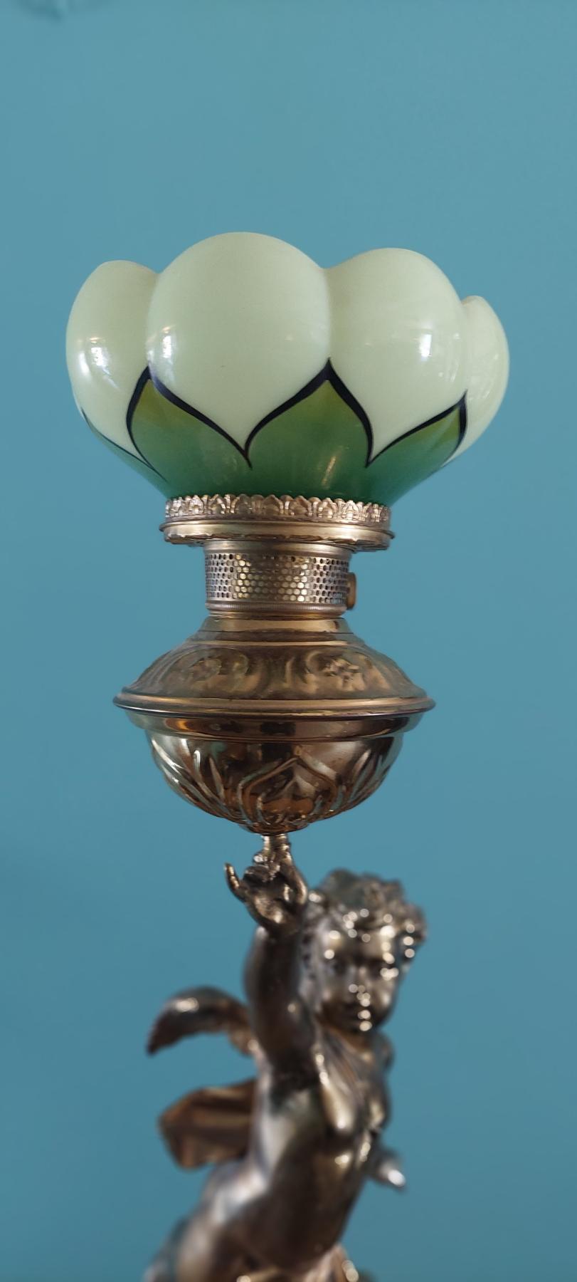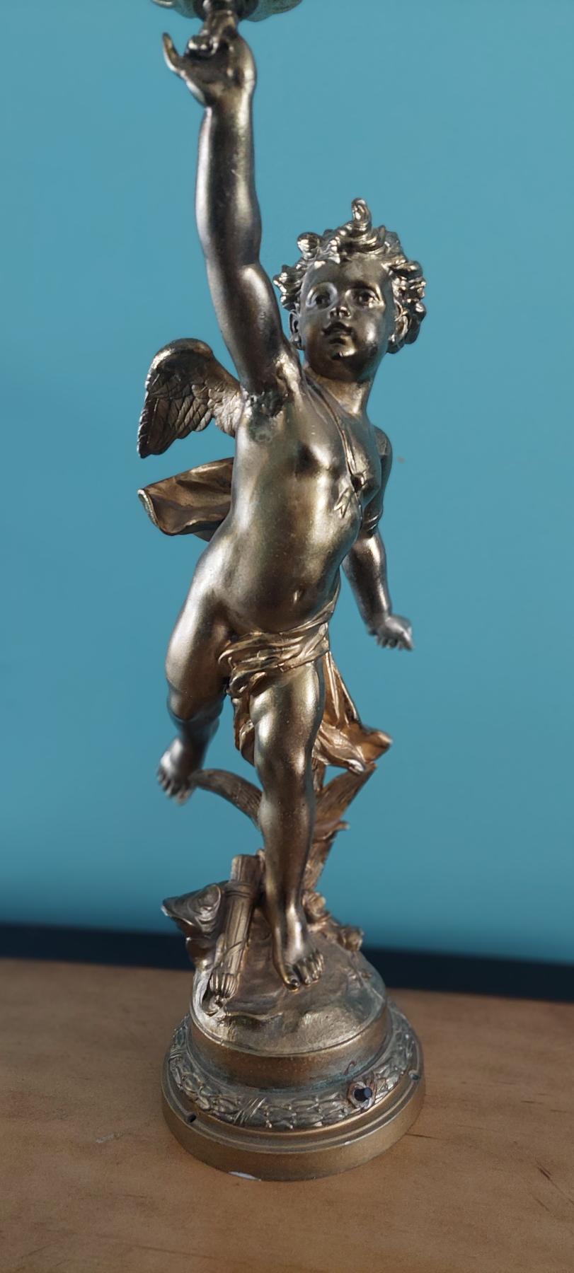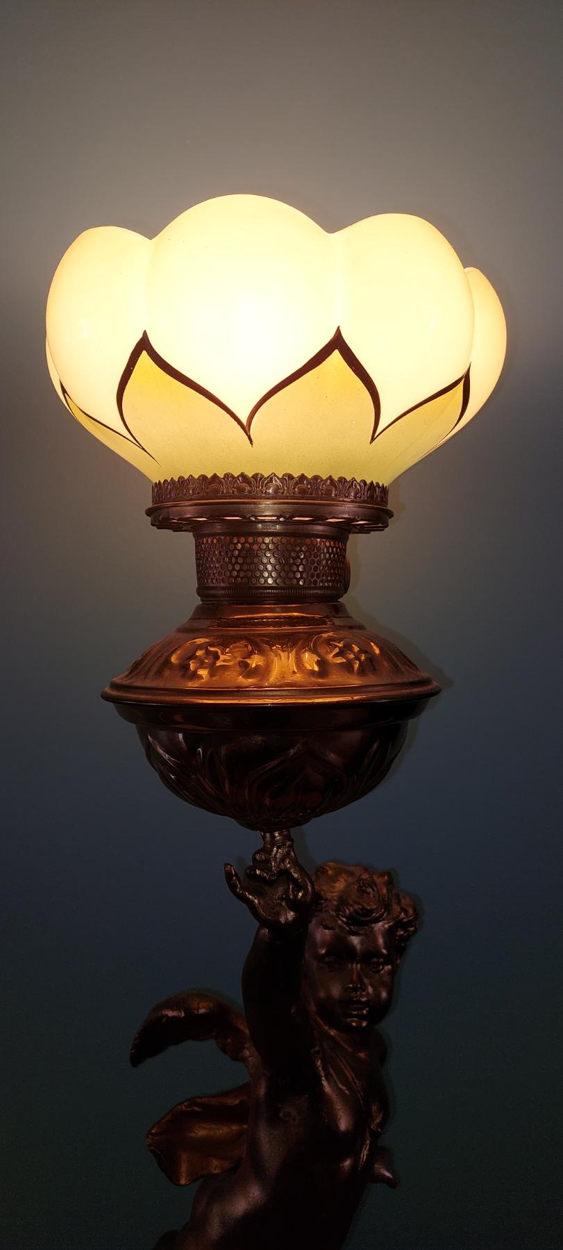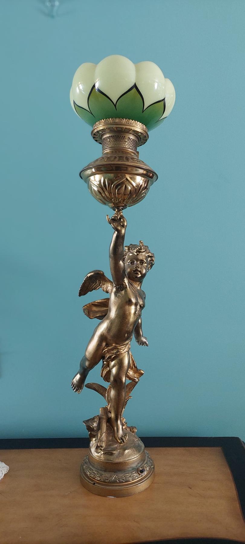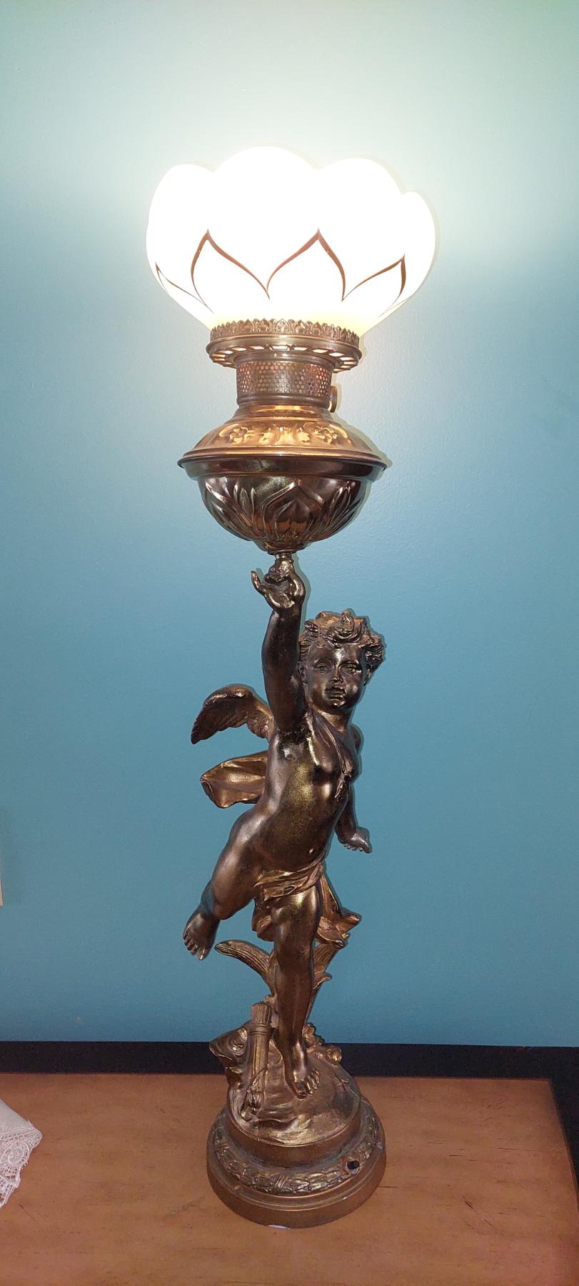 Tall 32" Bronze Cupid Figural Converted Parlor Lamp As Shown With Globe