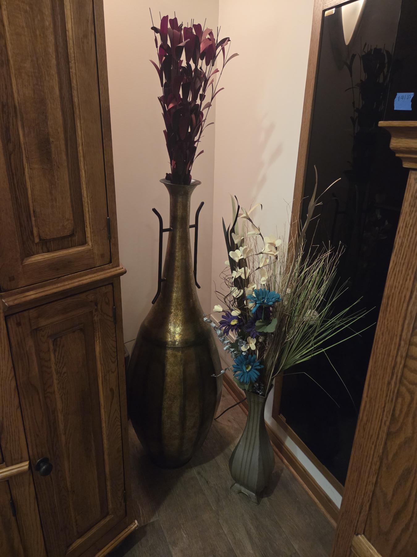 Tall Metal Vase And Smaller Green Vase With Faux Flowers