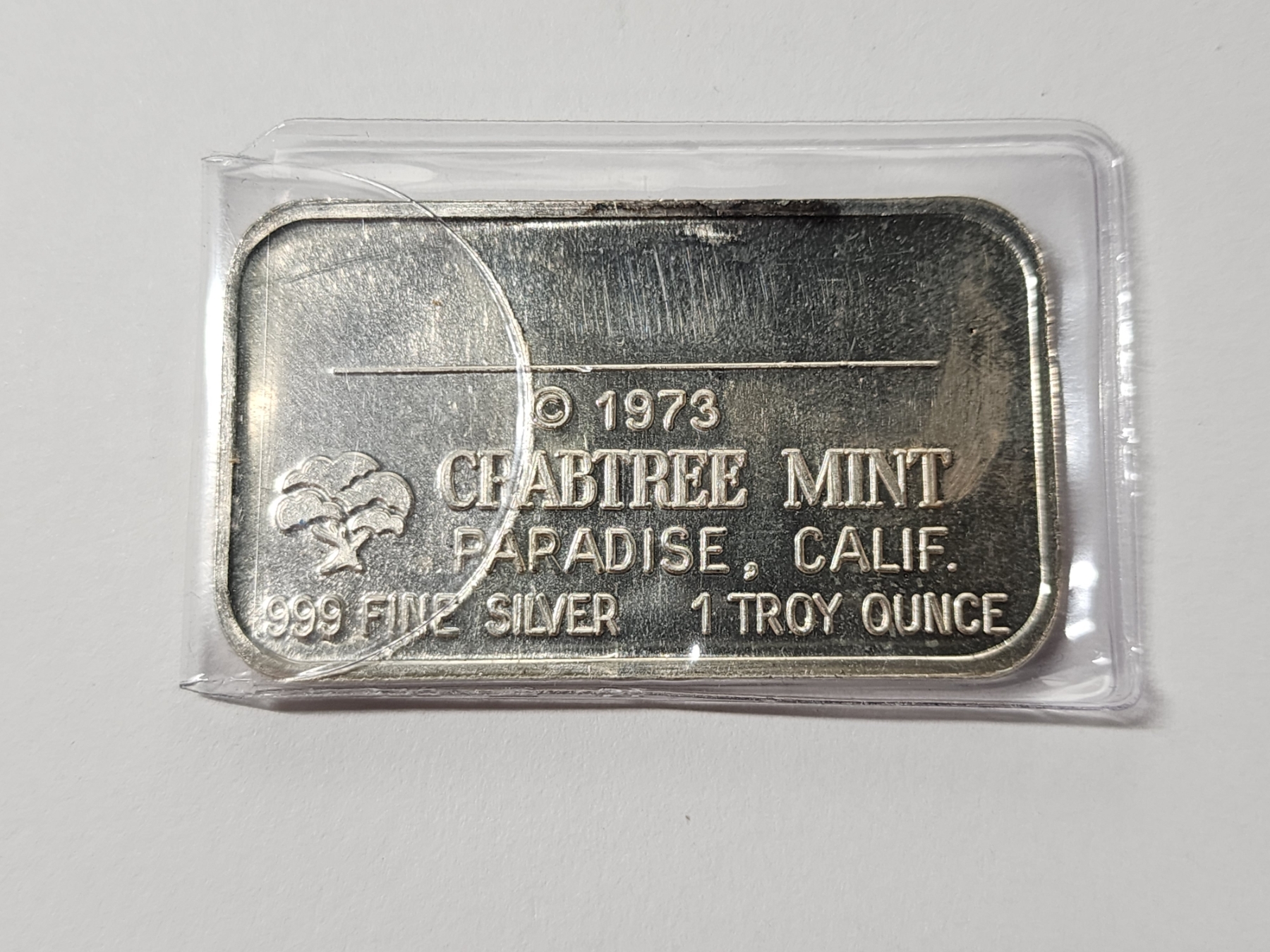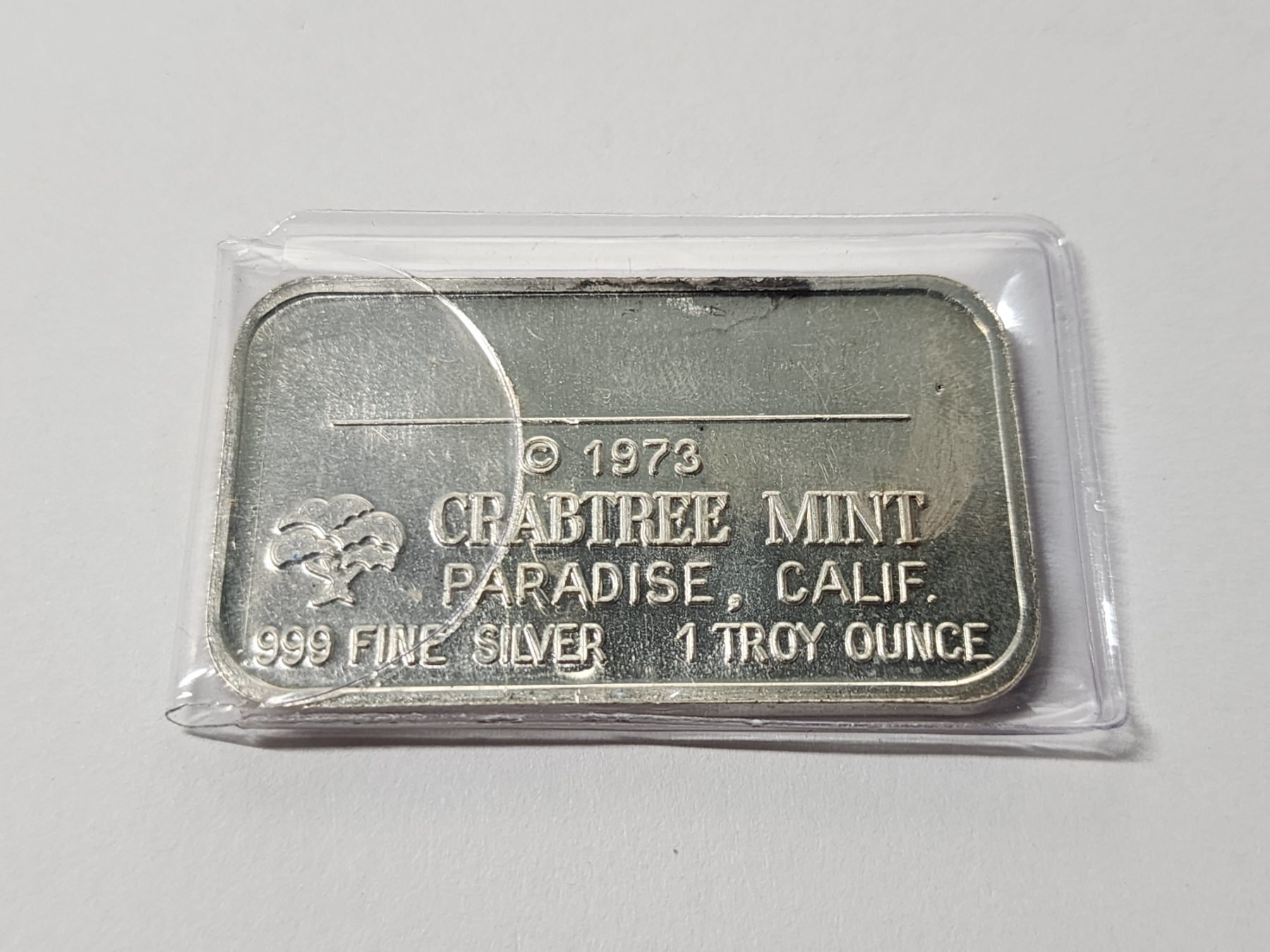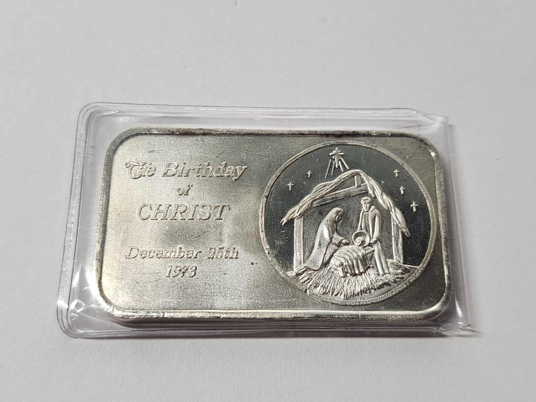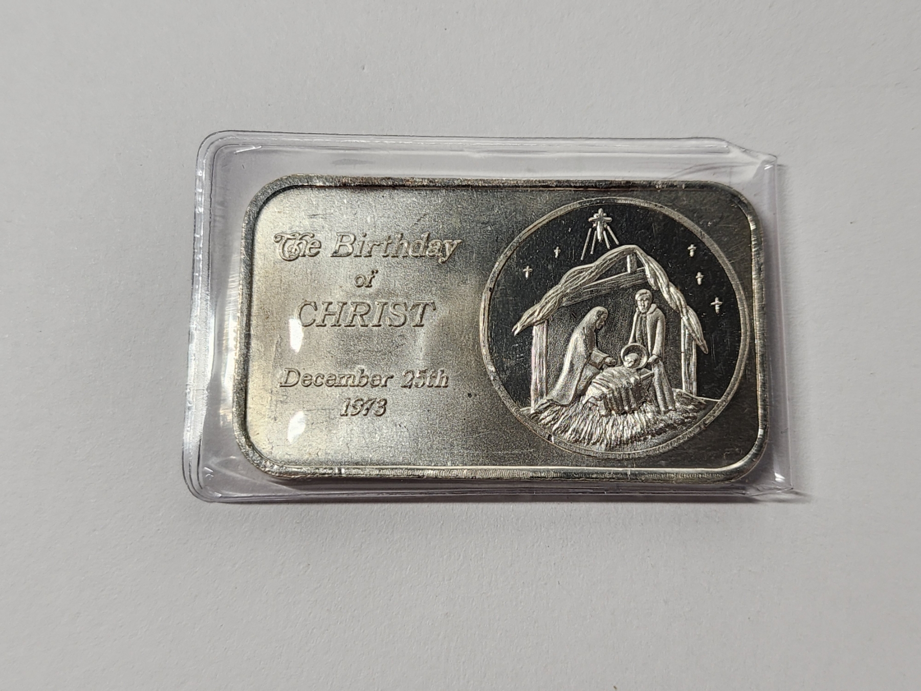 "The Birthday of Christ" 1973 Crabtree Mint One Ounce .999 Fine Silver Bar