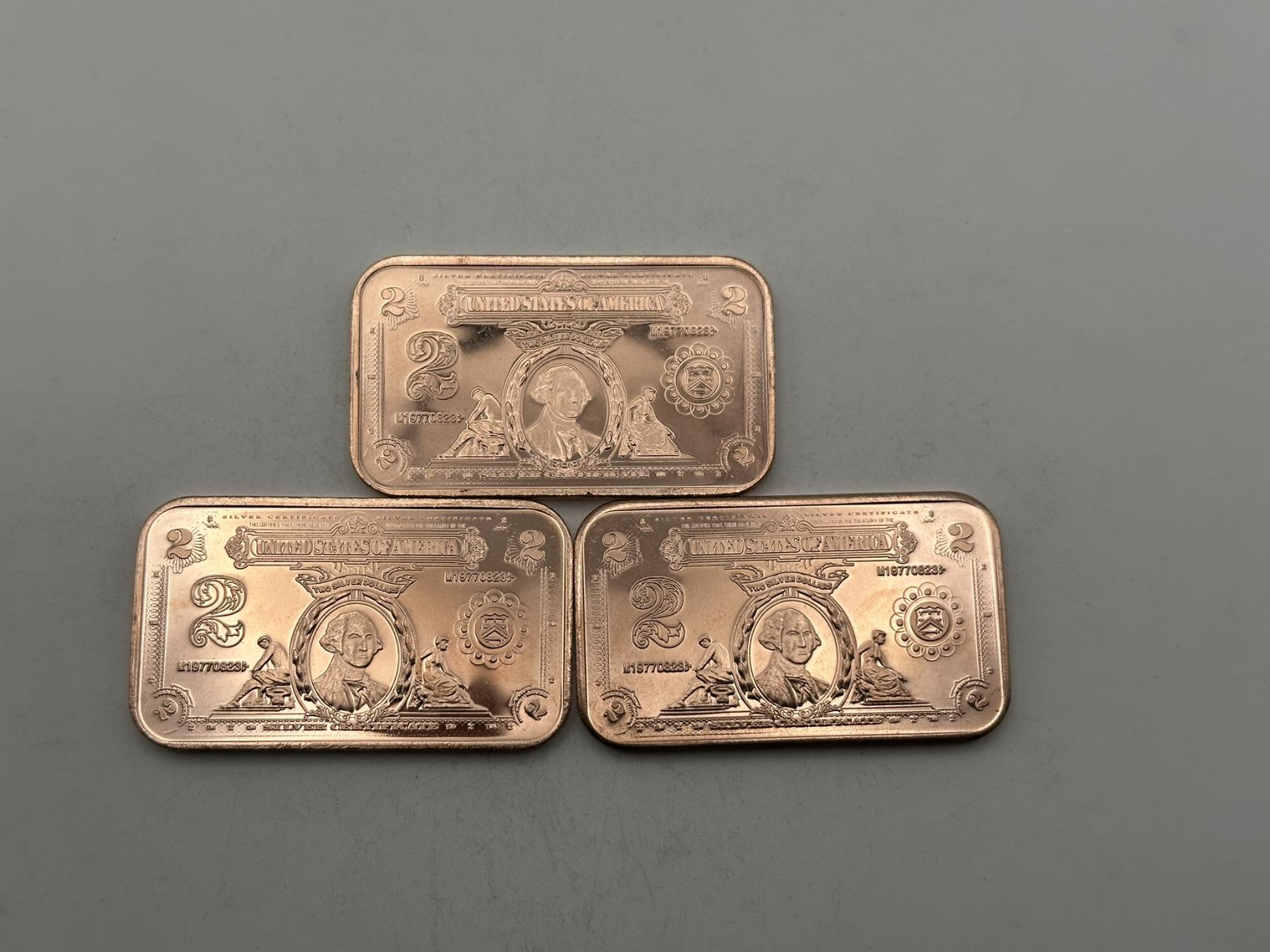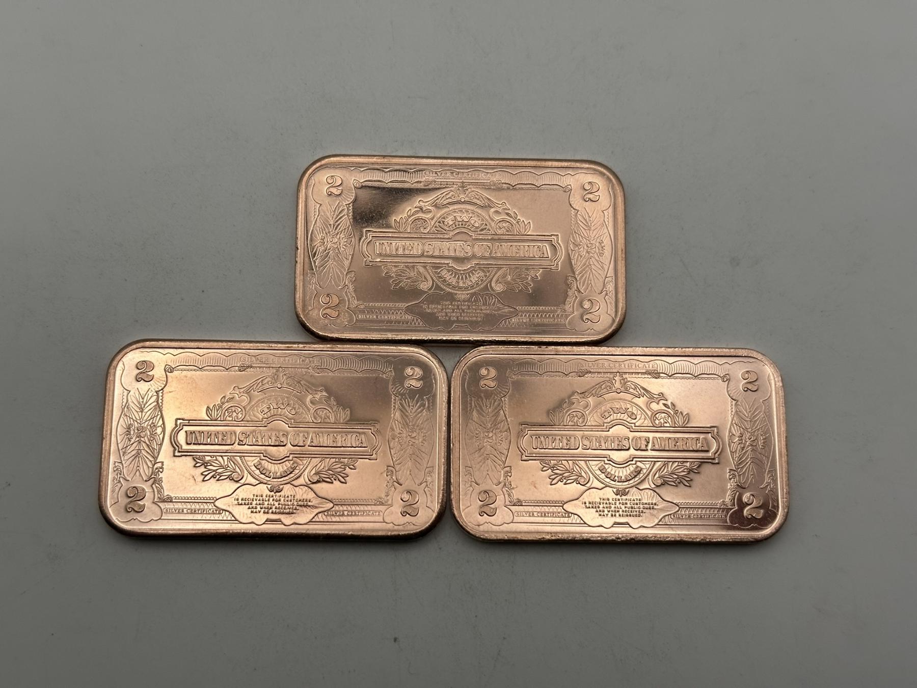 Three $2 George Washington 'Silver Certificate' 1oz .999 Copper Bars