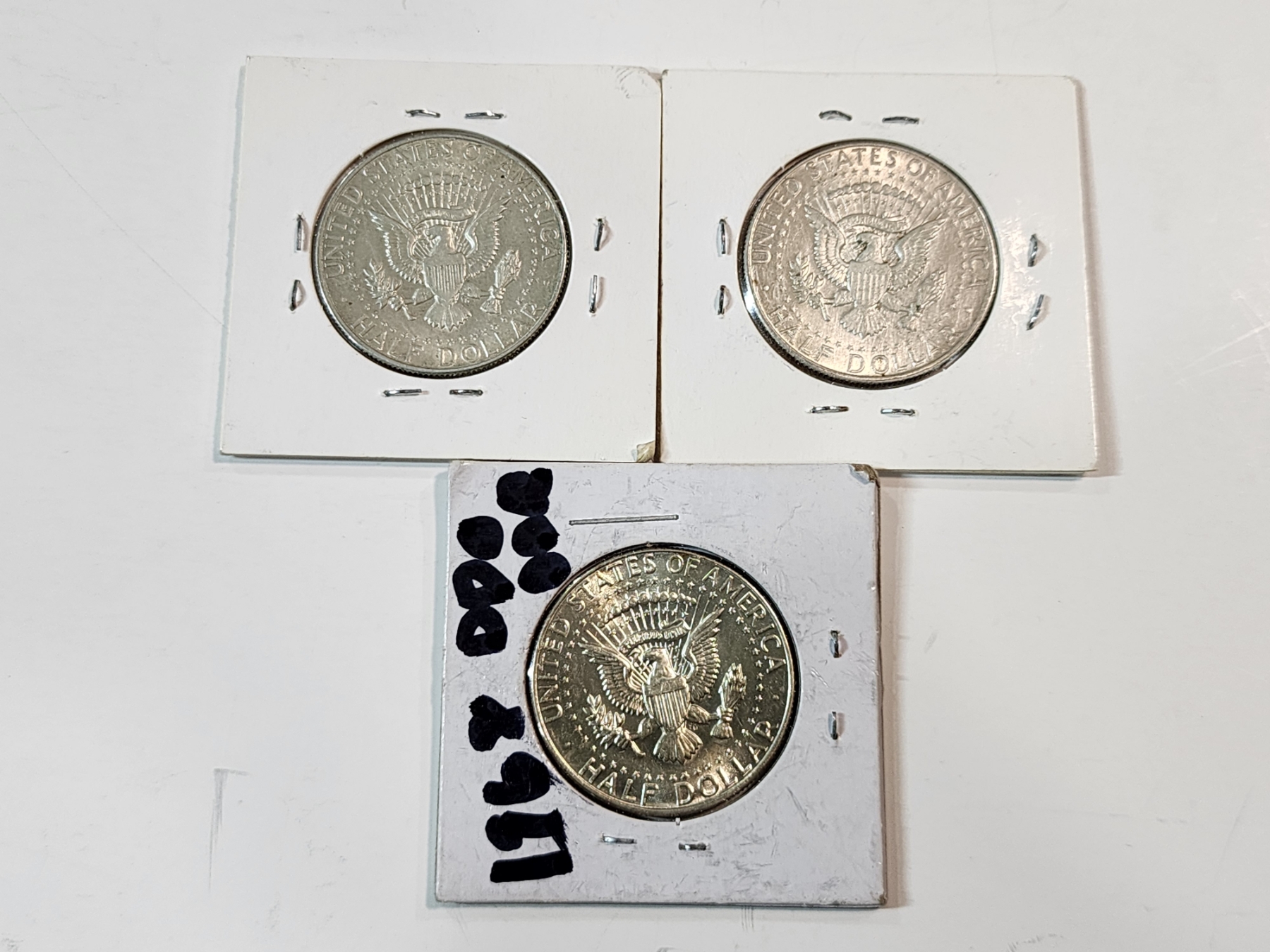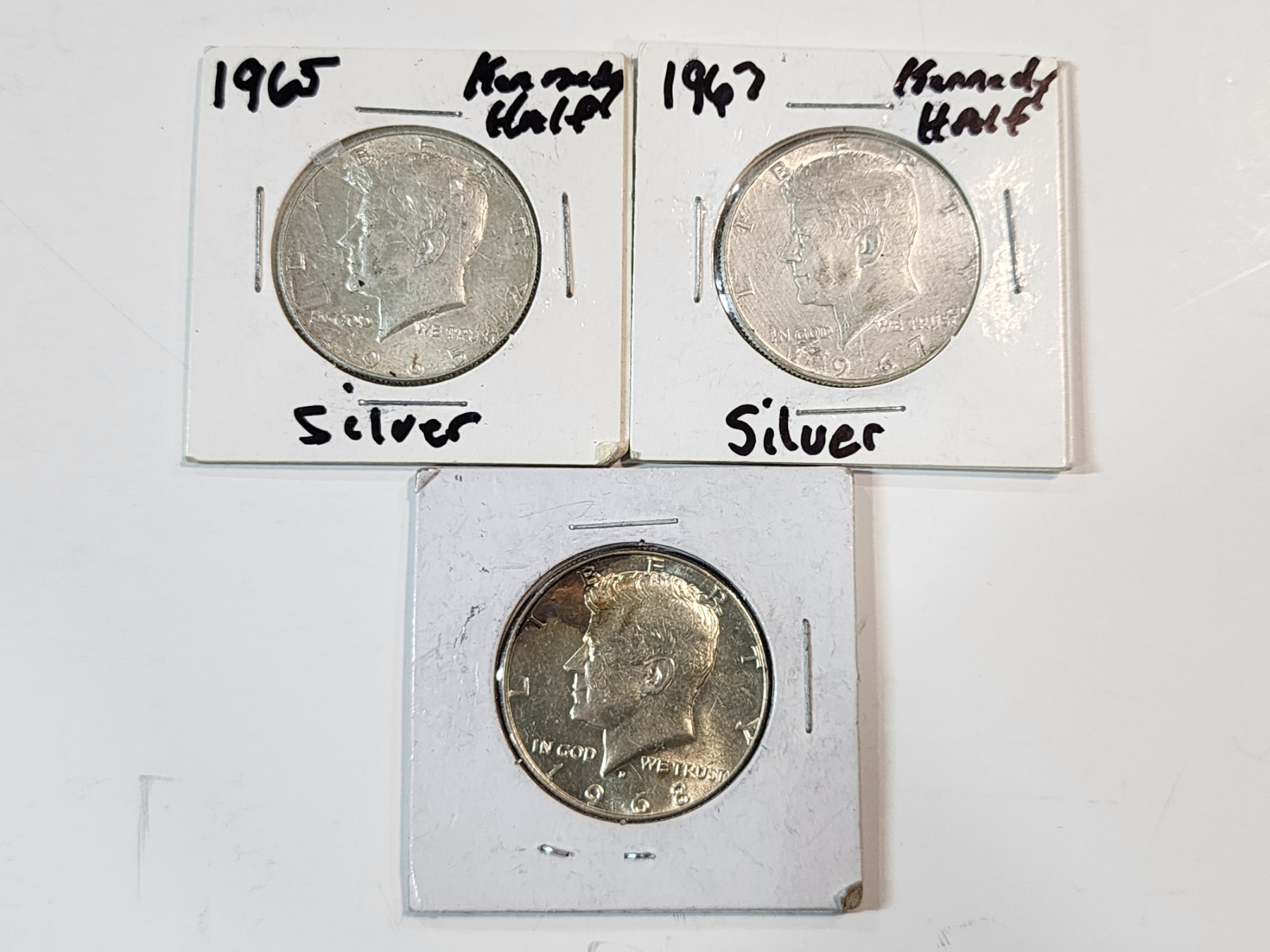 Three 40% Silver Kennedy Half Dollars: 1965, 1967, 1968 FV: $1.50