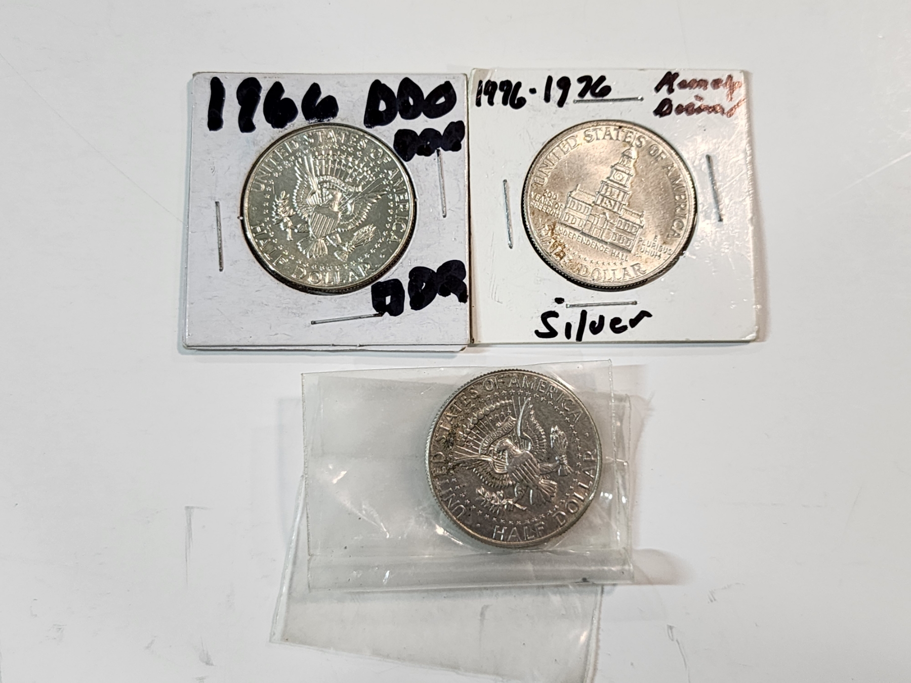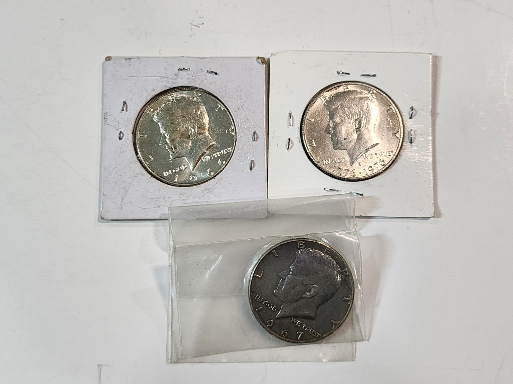 Three 40% Silver Kennedy Half Dollars: 1966, 1976-S Bicentennial, 1967 FV $1.50