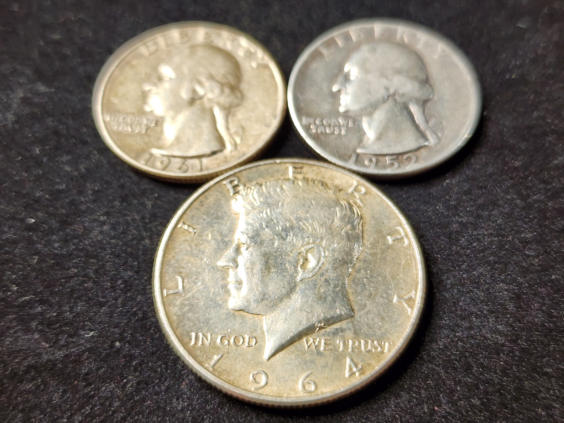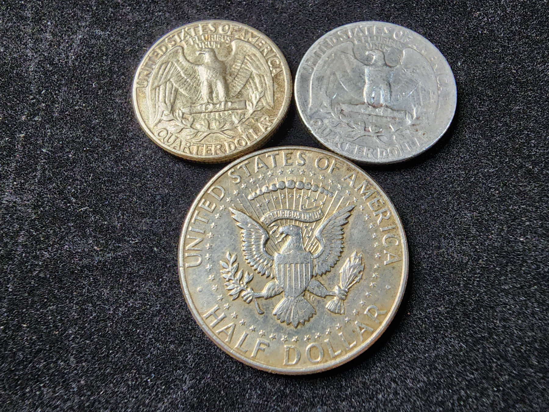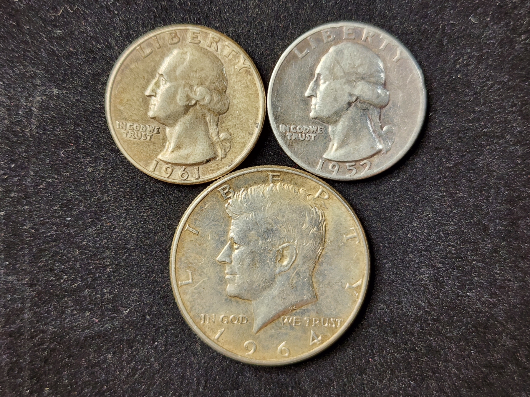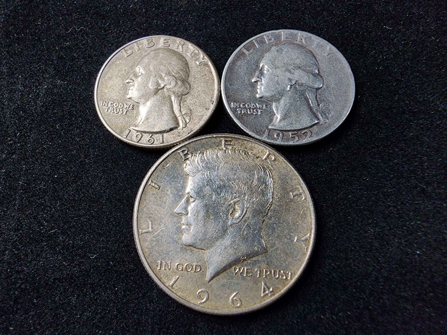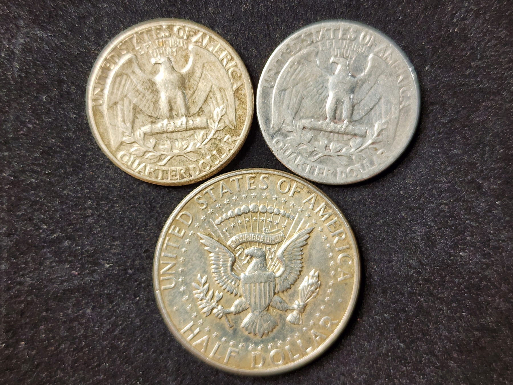 Three Assorted 90% Silver United States Coins Ft. Two Quarters & A Kennedy Half Dollar - $1.00 Face Value