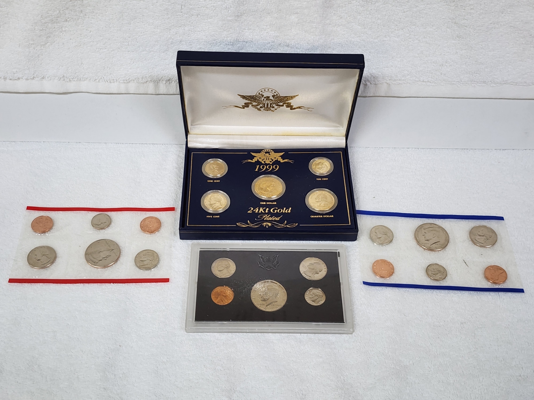Three Assorted United States Coin Sets Feat. 1999 Gold Plated Set, 1993 Uncirculated Set & 1972 Proof Set