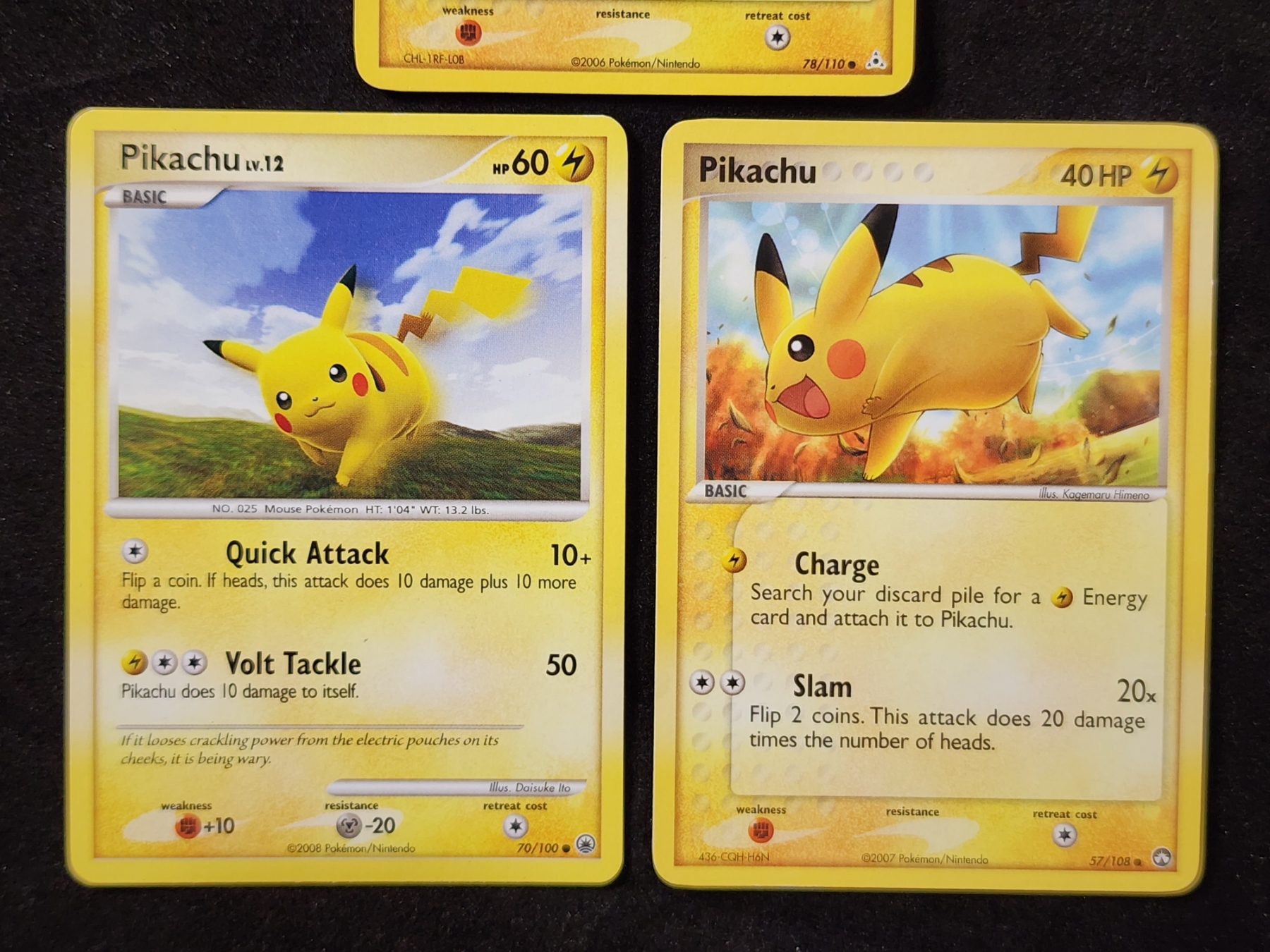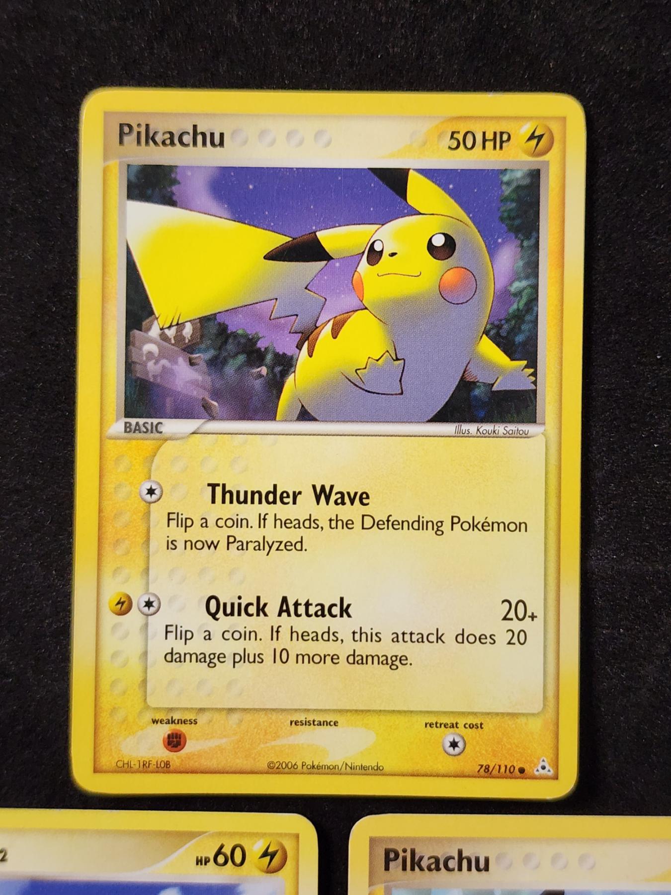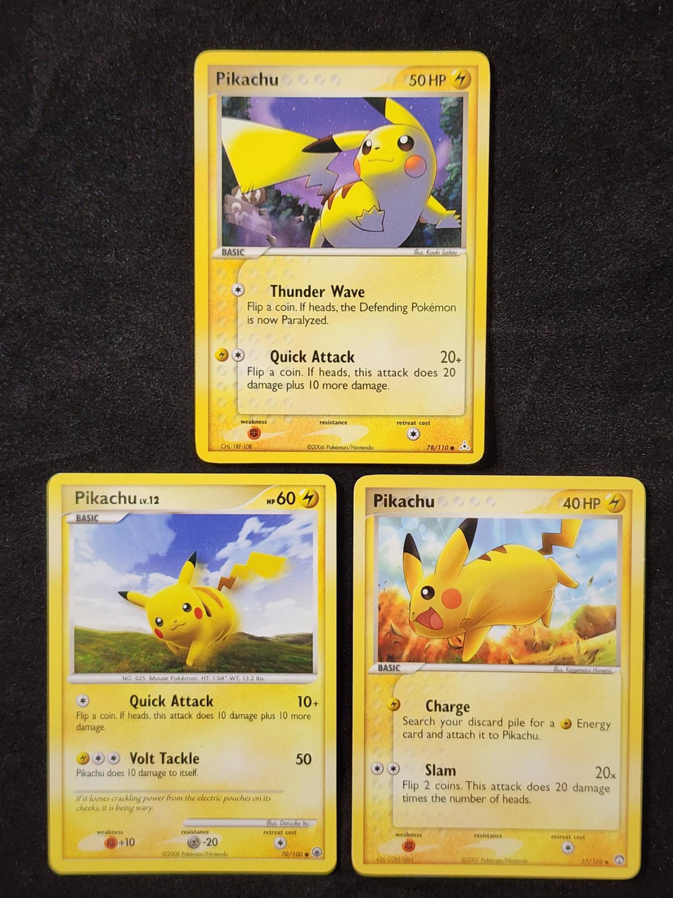 Three Assorted Vintage PIKACHU Pokemon Trading Cards Dating Back to 2006