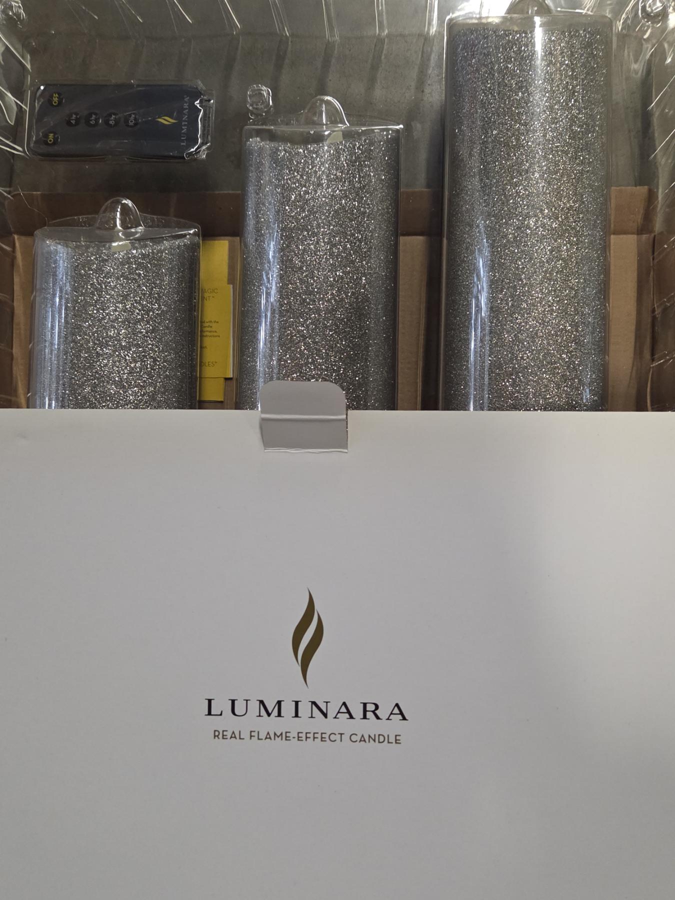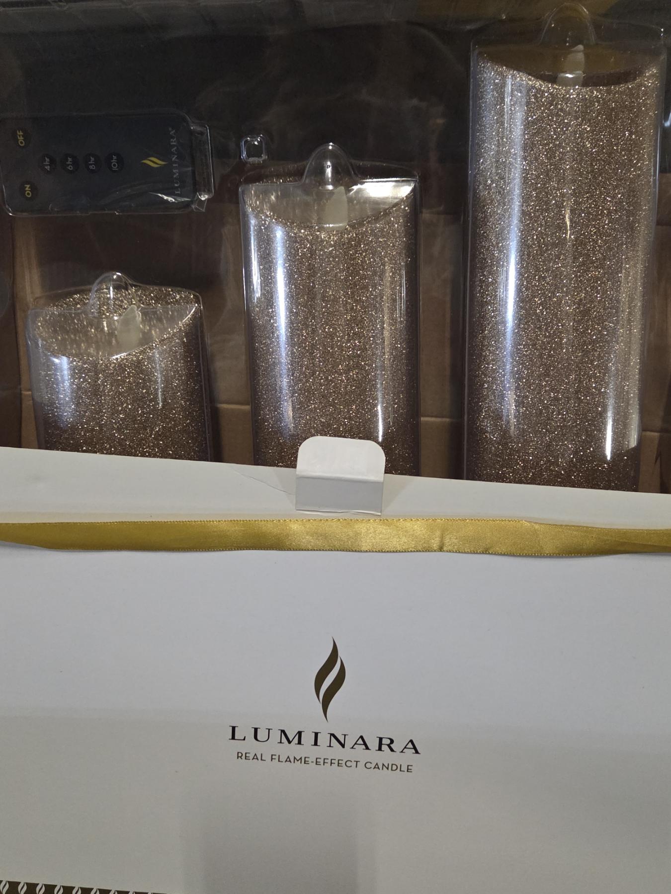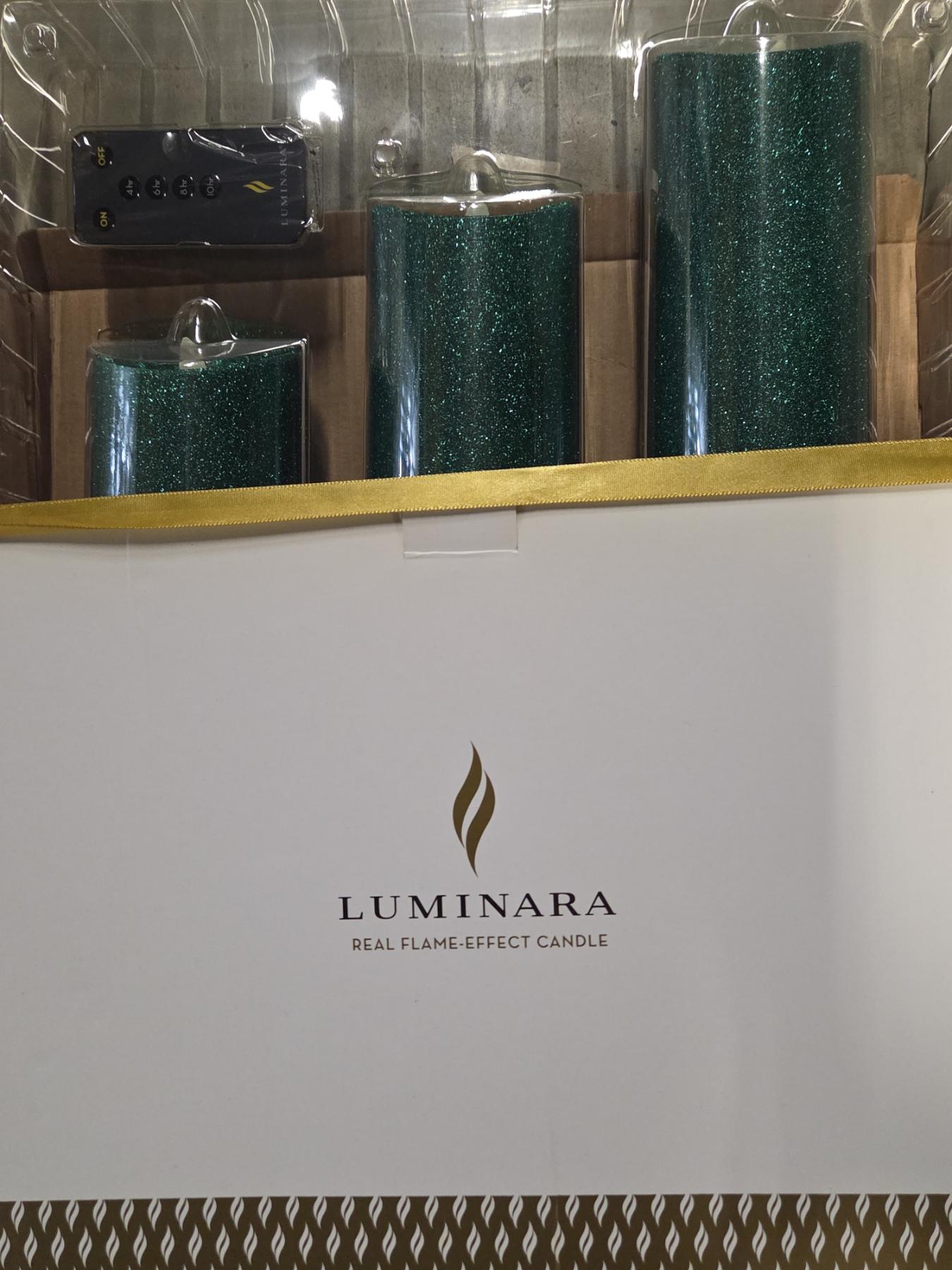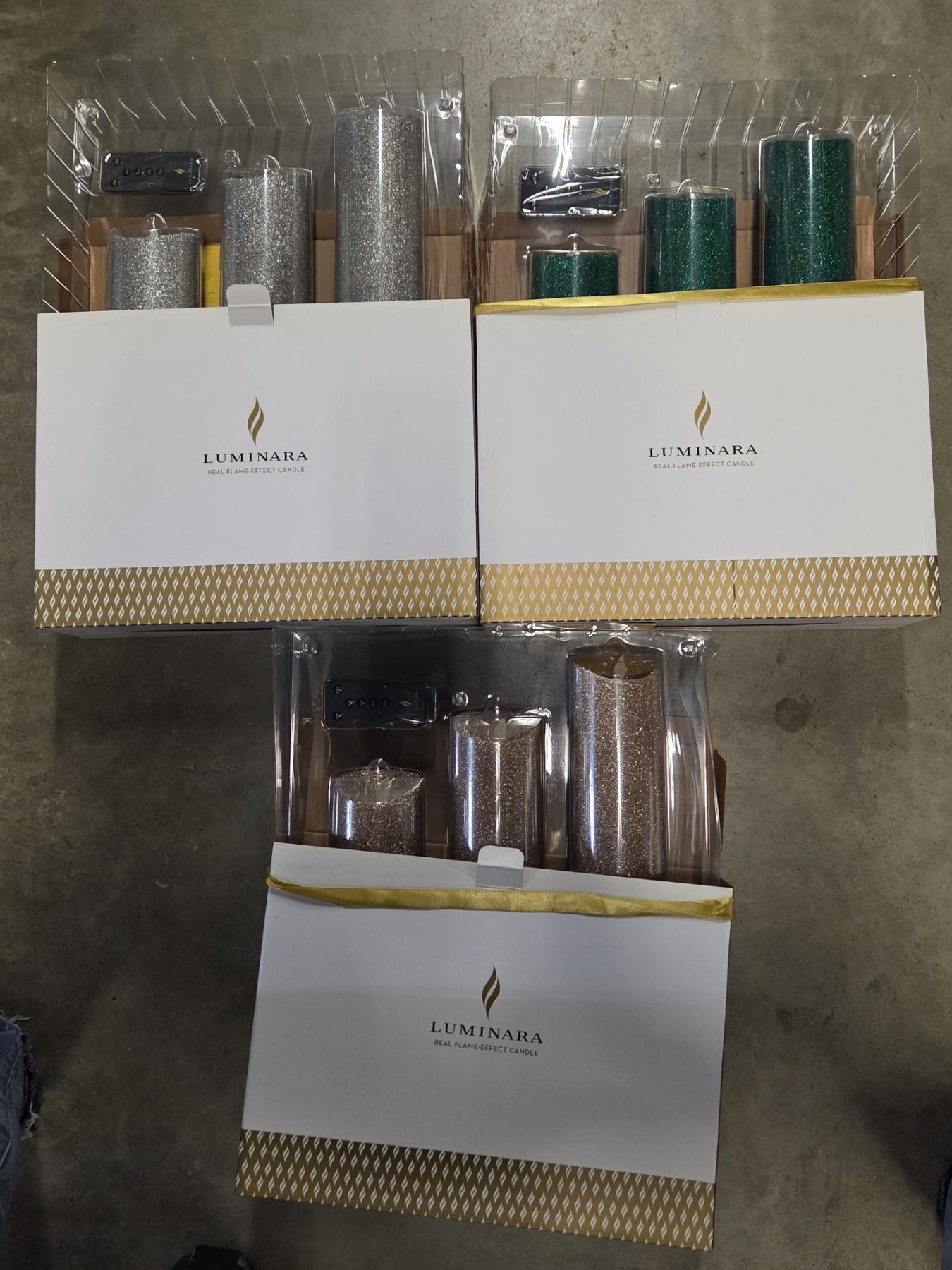 Three Brand New Luminara 3 Remote Control Candle Sets In Green, Silver & Gold