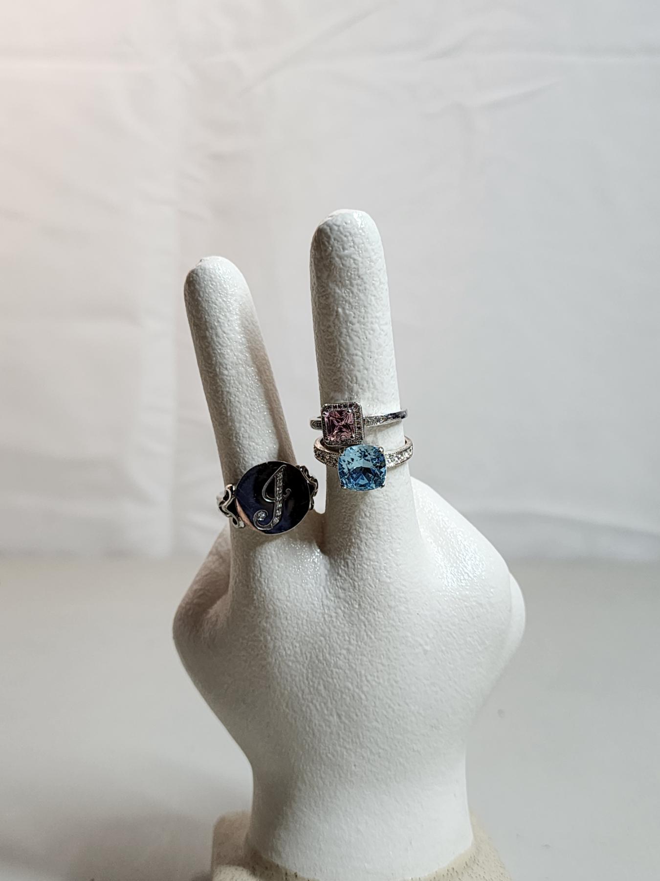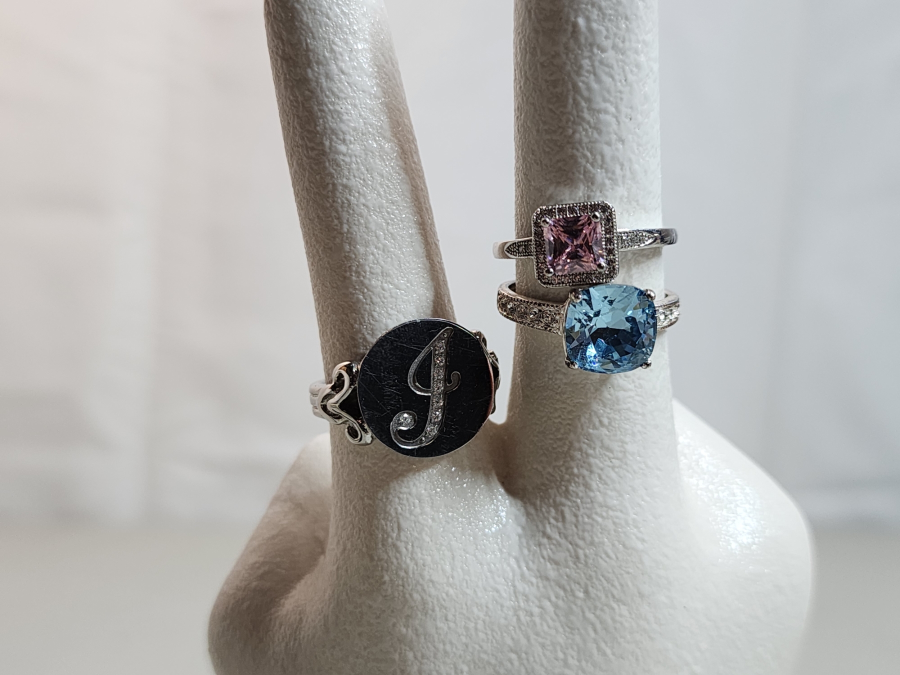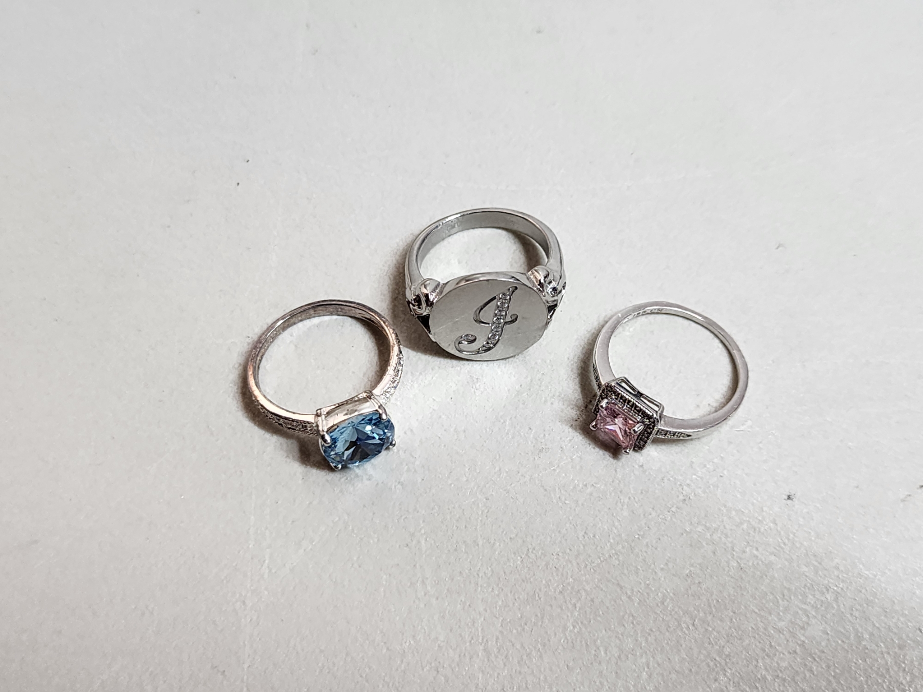 Three Costume Rings - Pink/Blue Stones, "J" Initial - Size 8