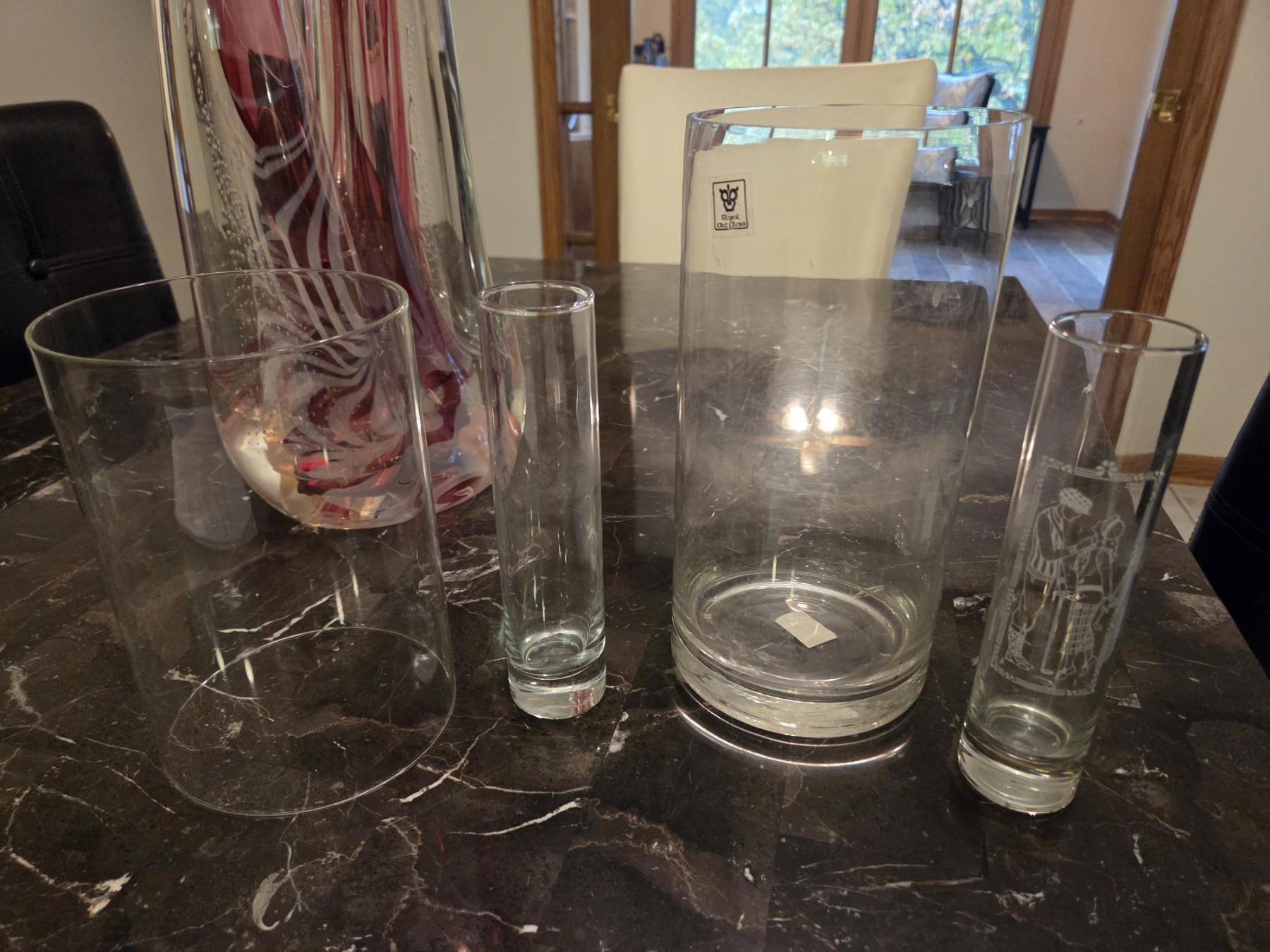 Three Glass Vases, Hurricane Glass, And Handmade Glass Frame