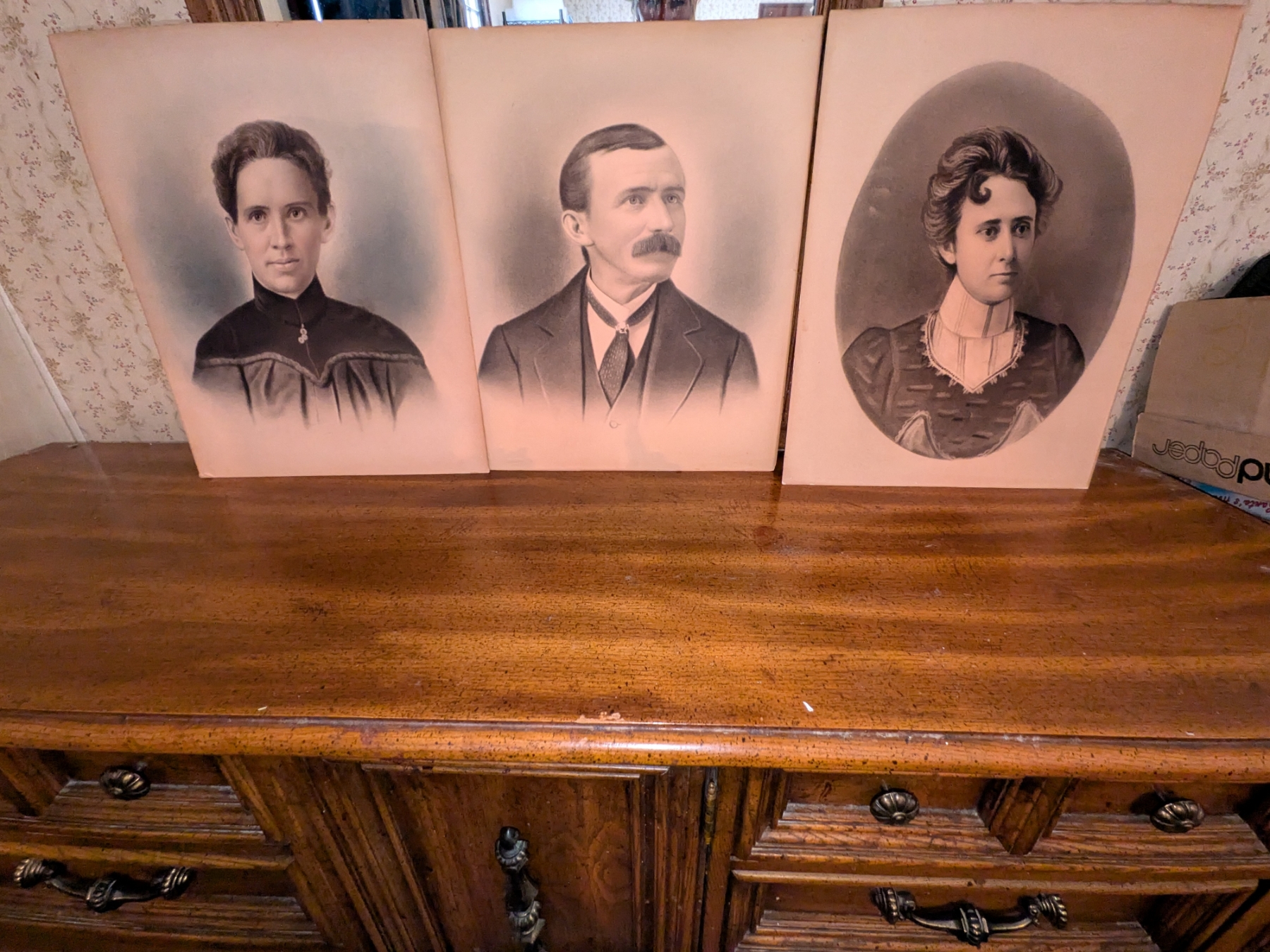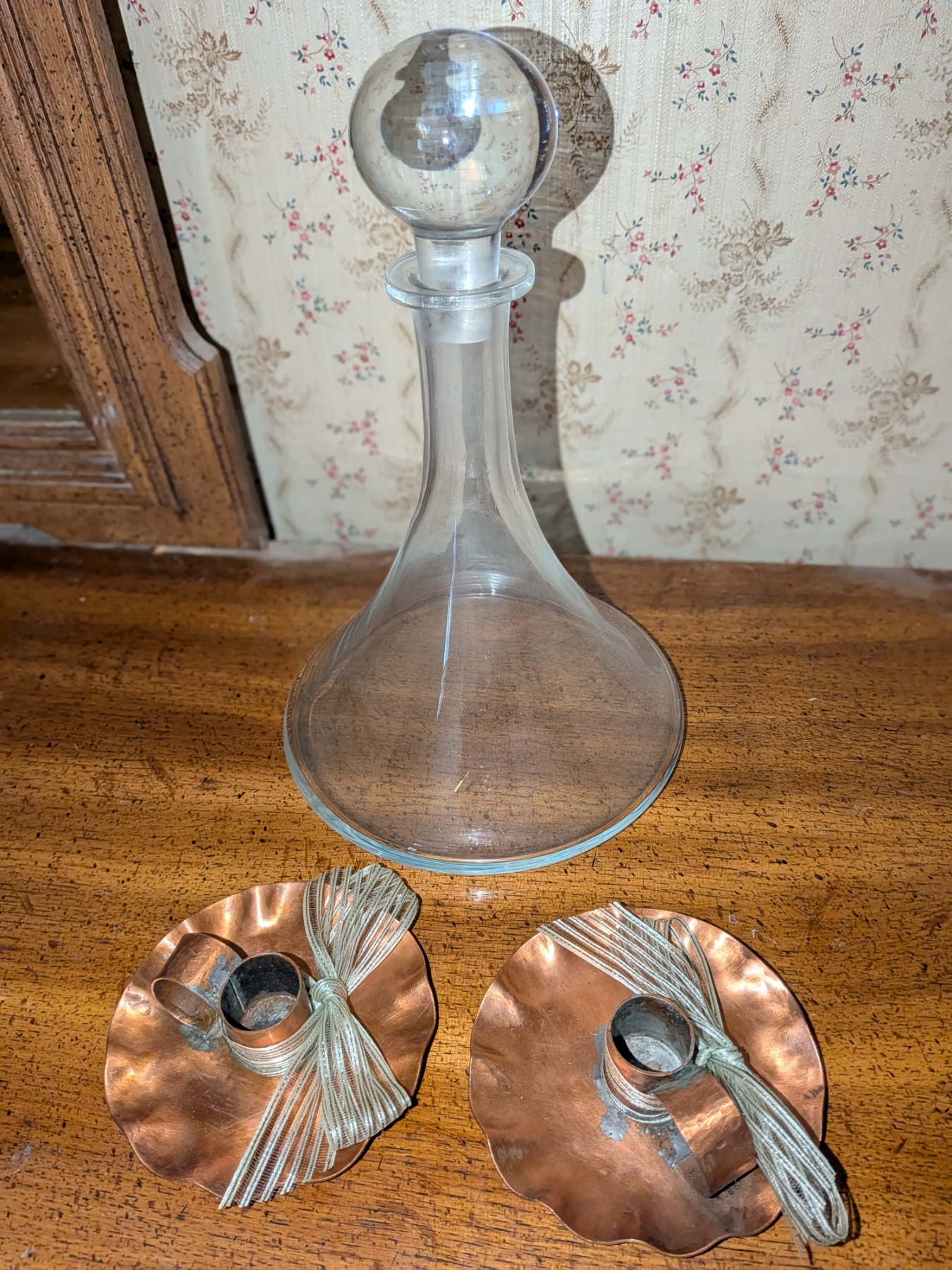Three Interesting 20"x17" Photographs, Copper Candle Stick Holders And Heavy Glass Decanter