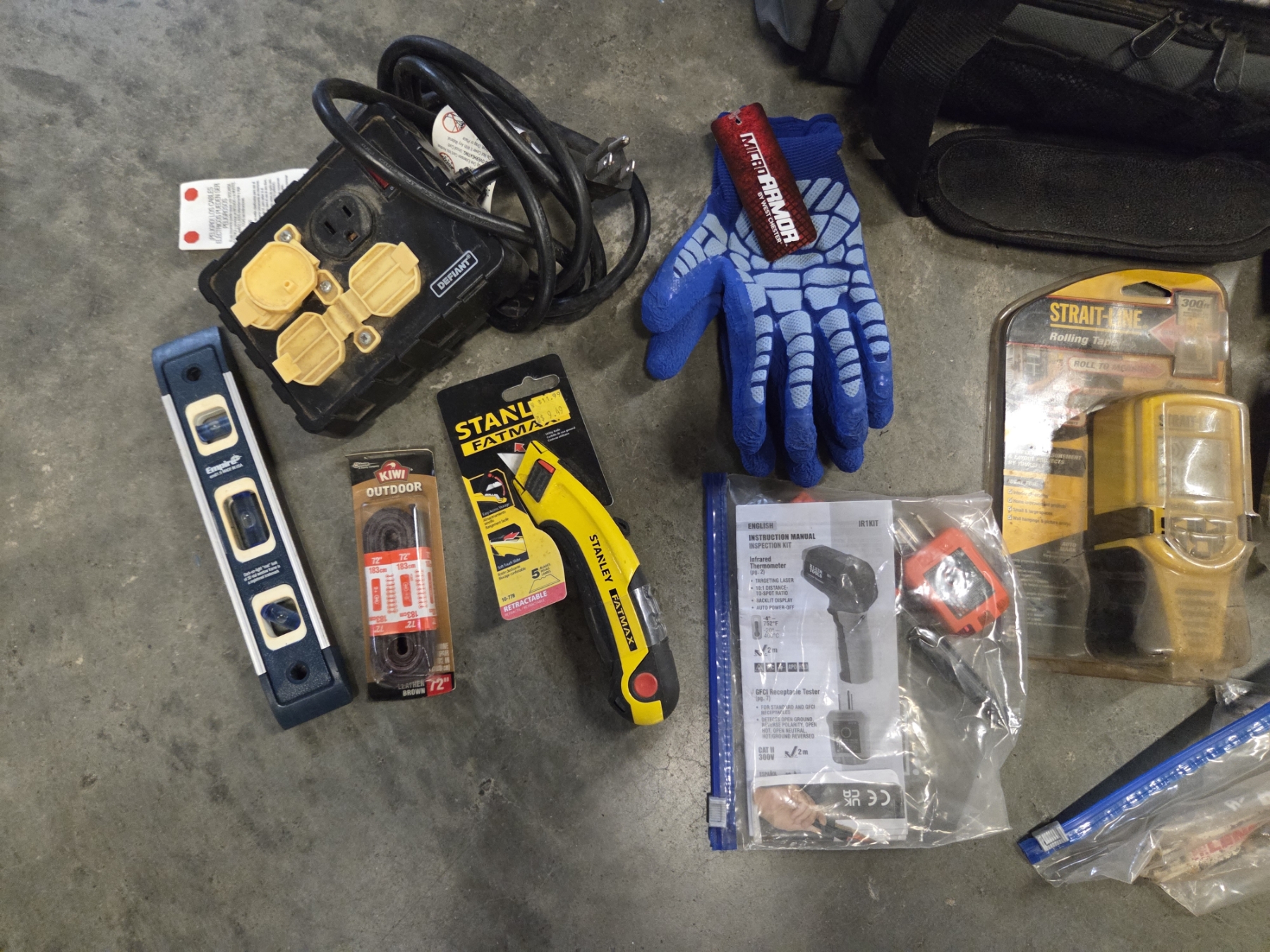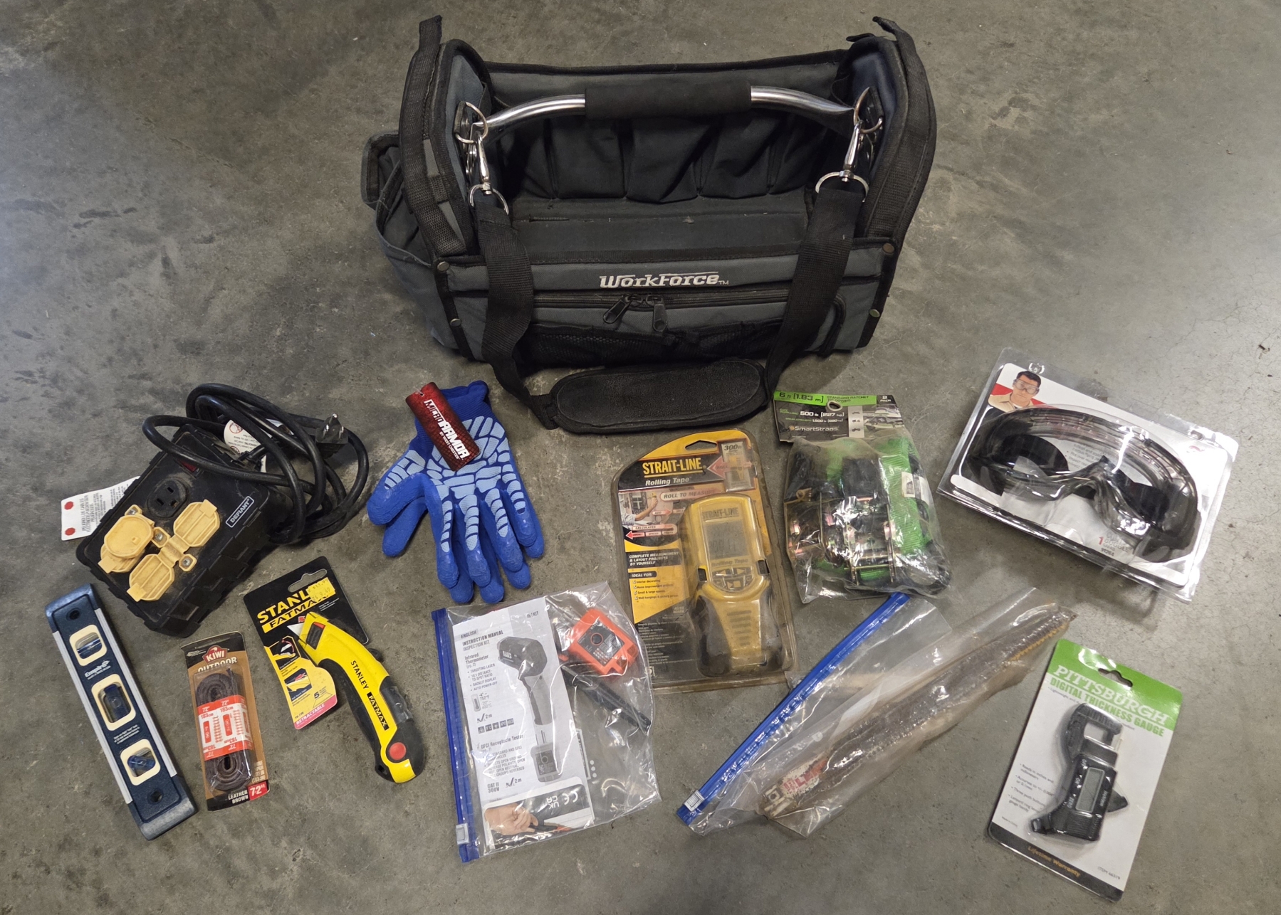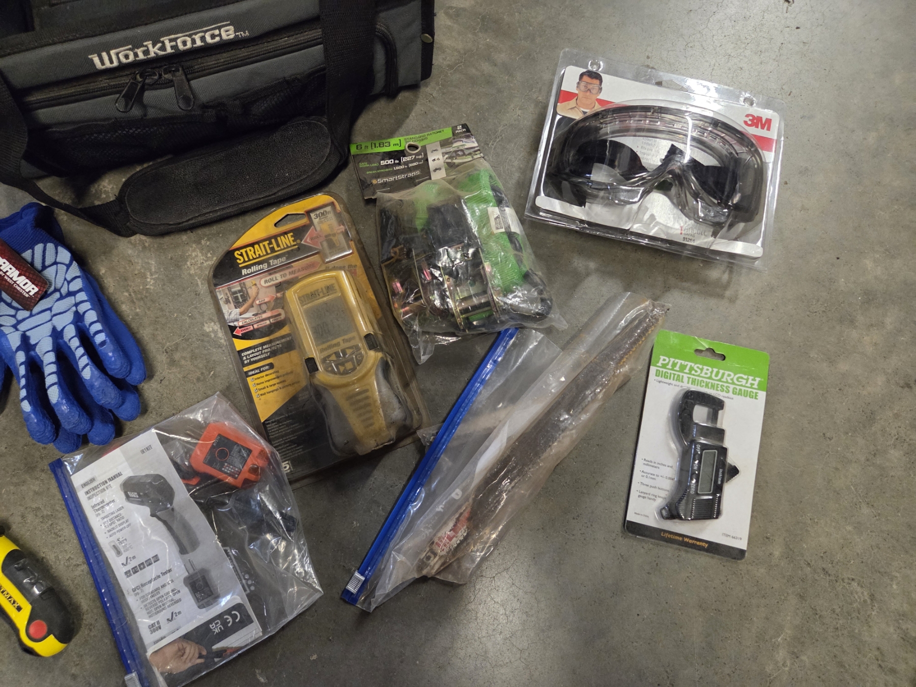 Tool Tote With New Digital Thickness Gauge, Level, Gloves, Ratchet Straps, Fat Max Knife And More!