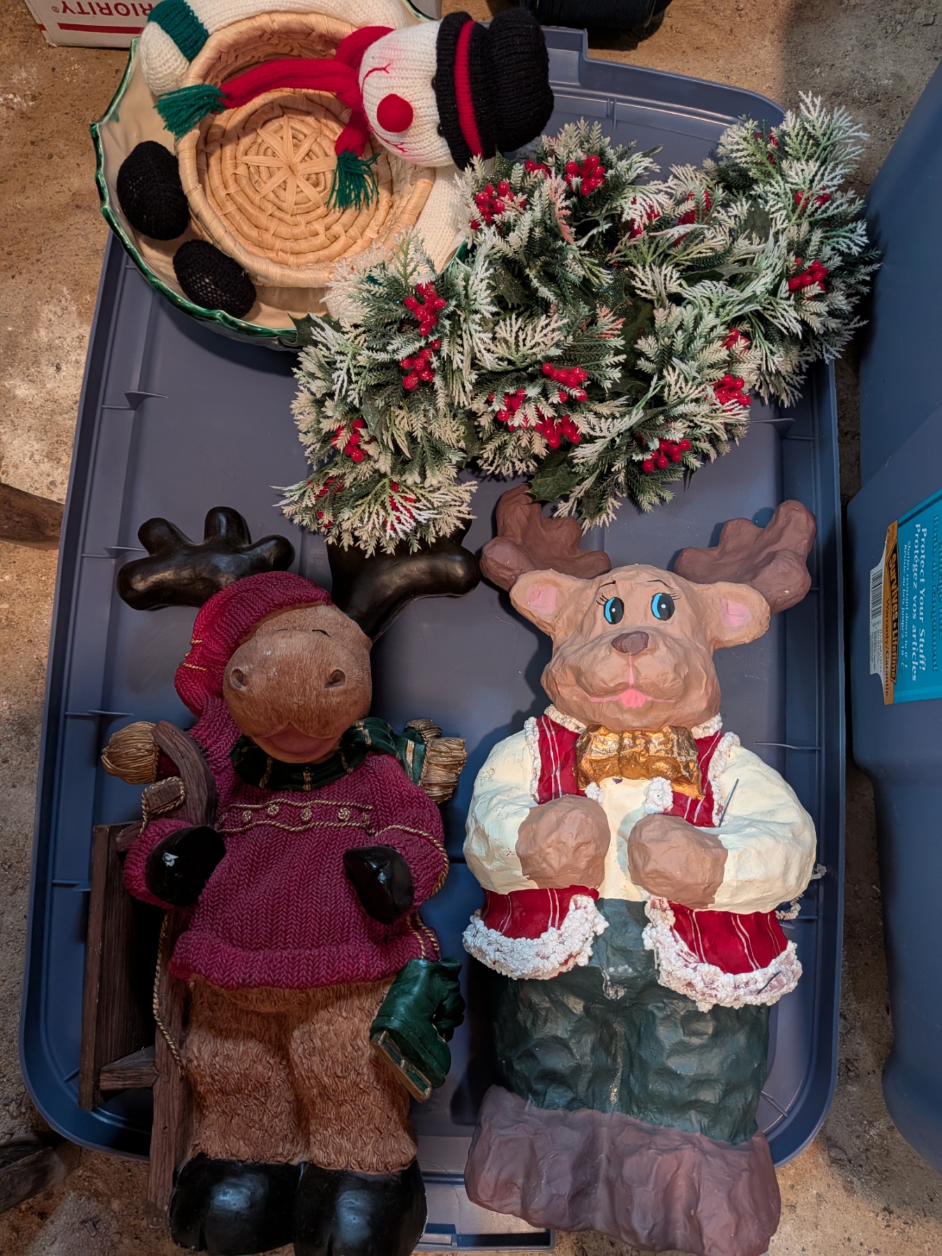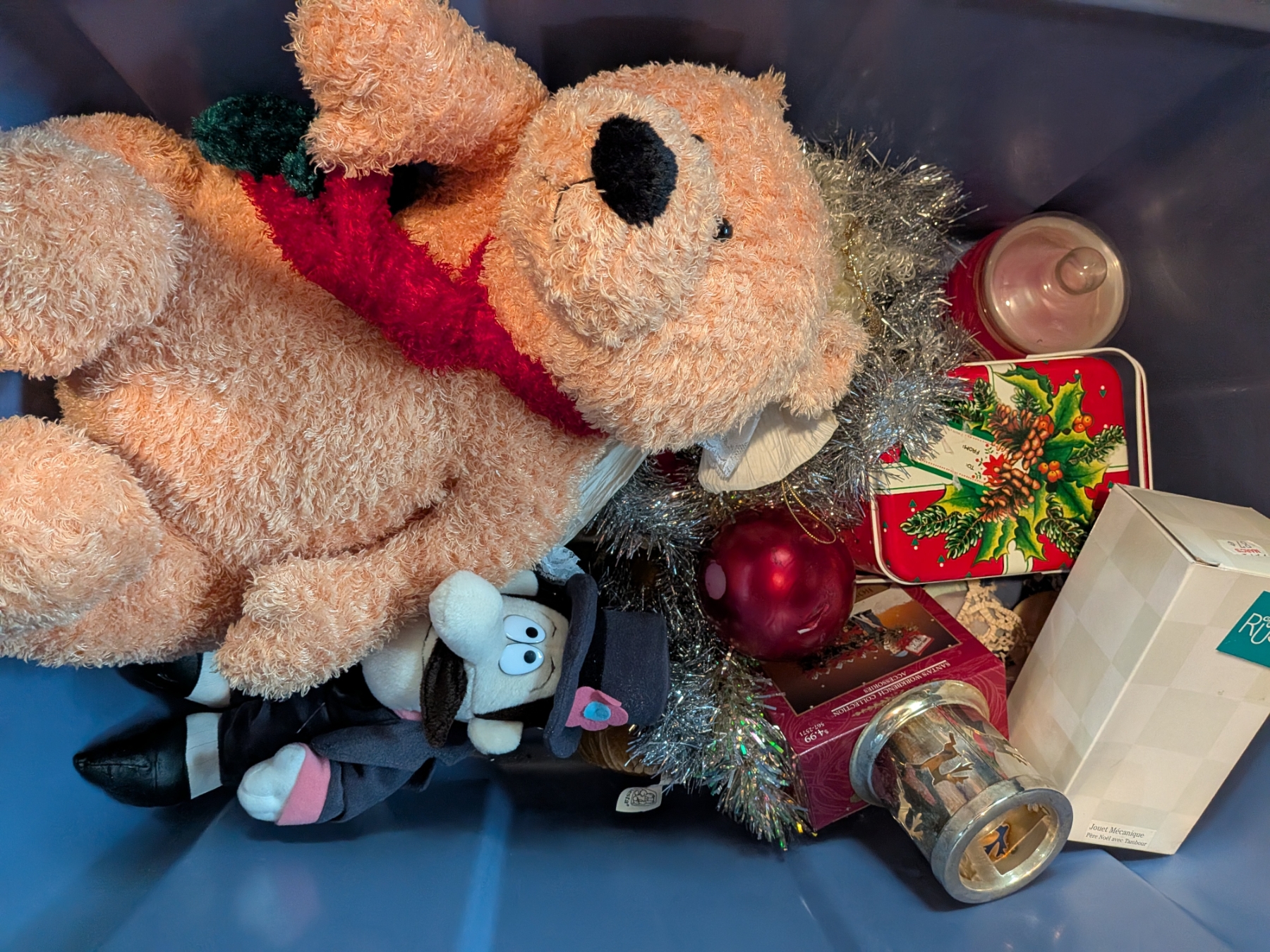 Tote Of Mostly New Holiday Items, Including Stuffed Bear, Candles, Reindeer, & More!