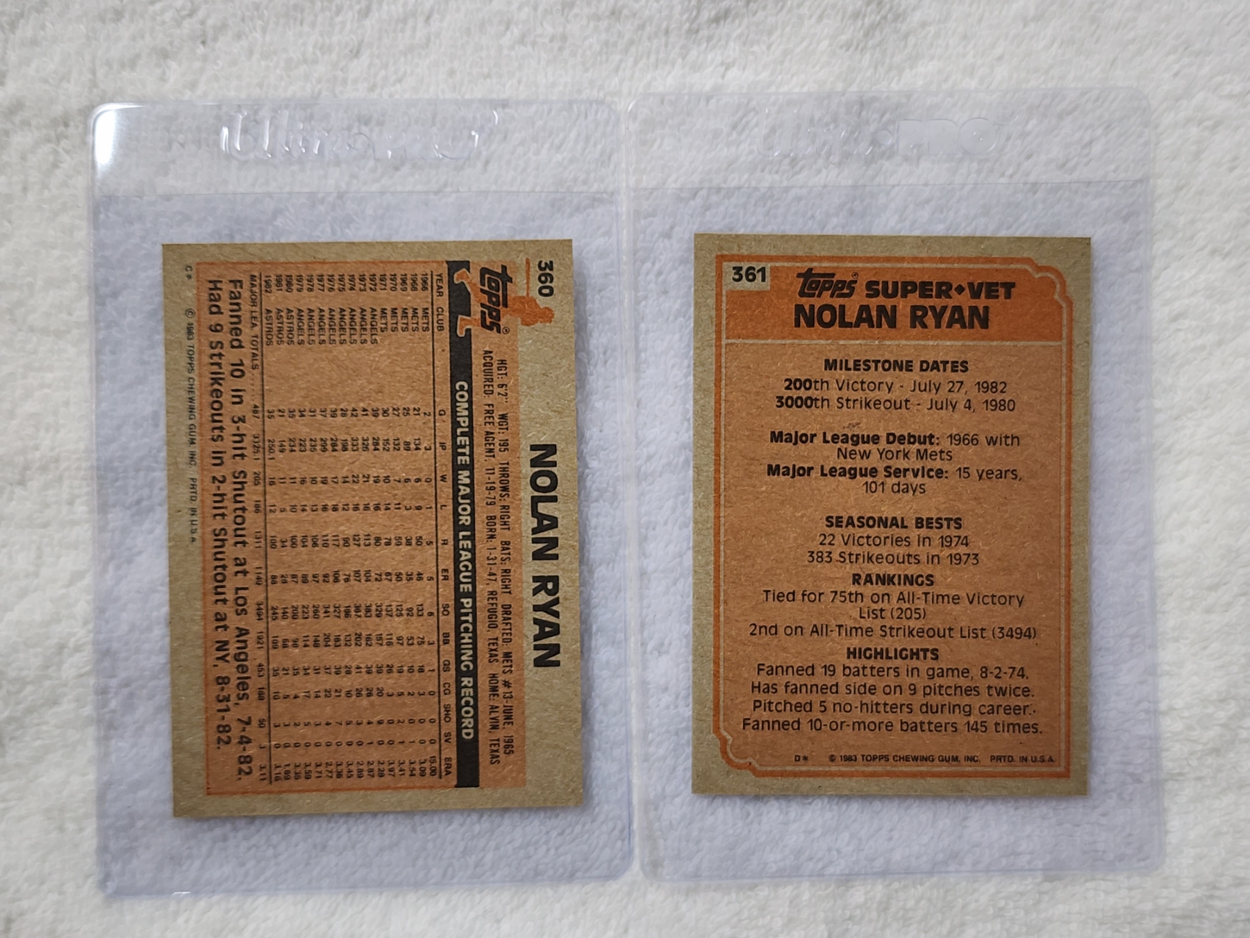 Two 1983 Topps Nolan Ryan Baseball Trading Cards ~ Both in Good Condition!