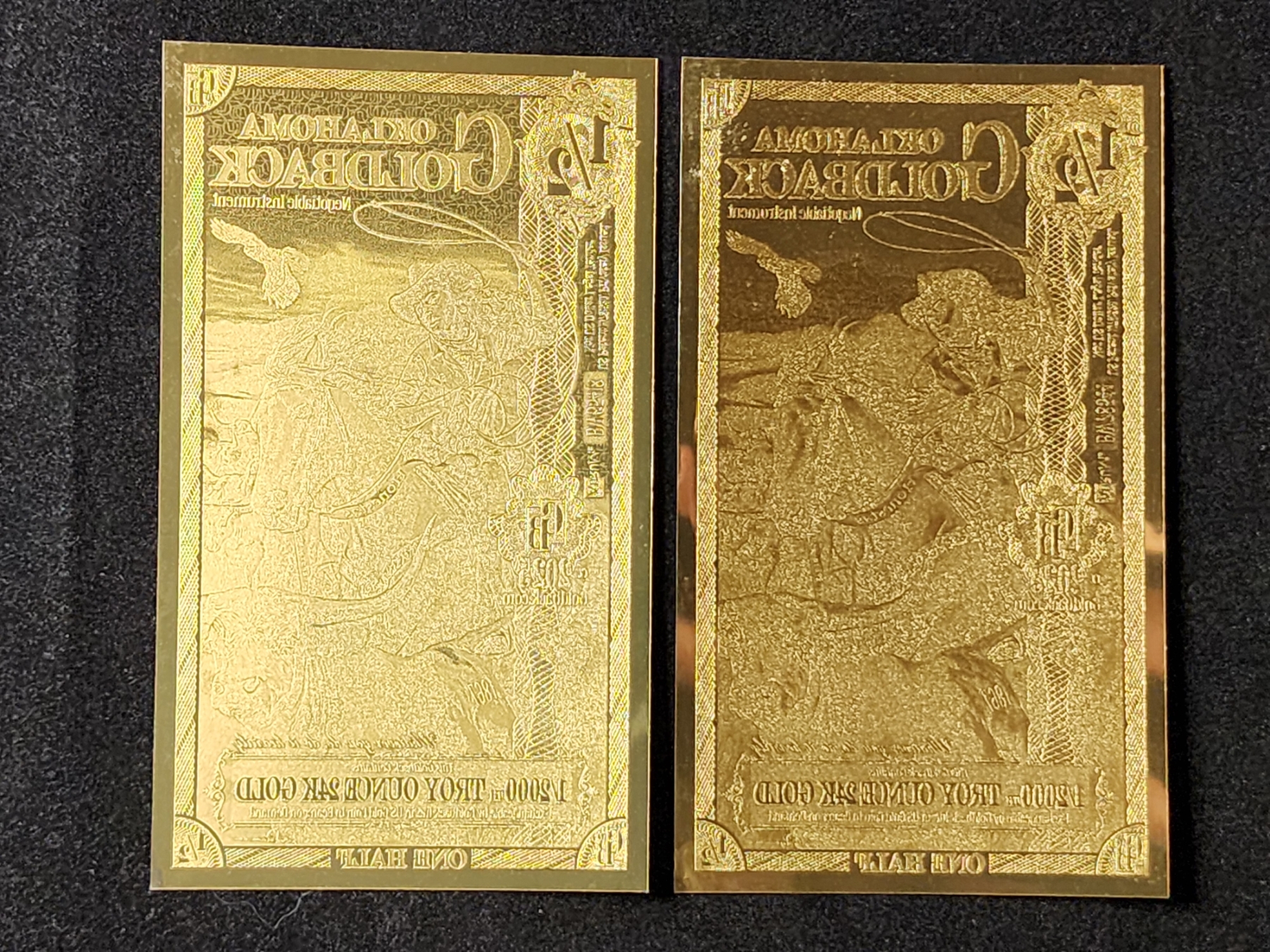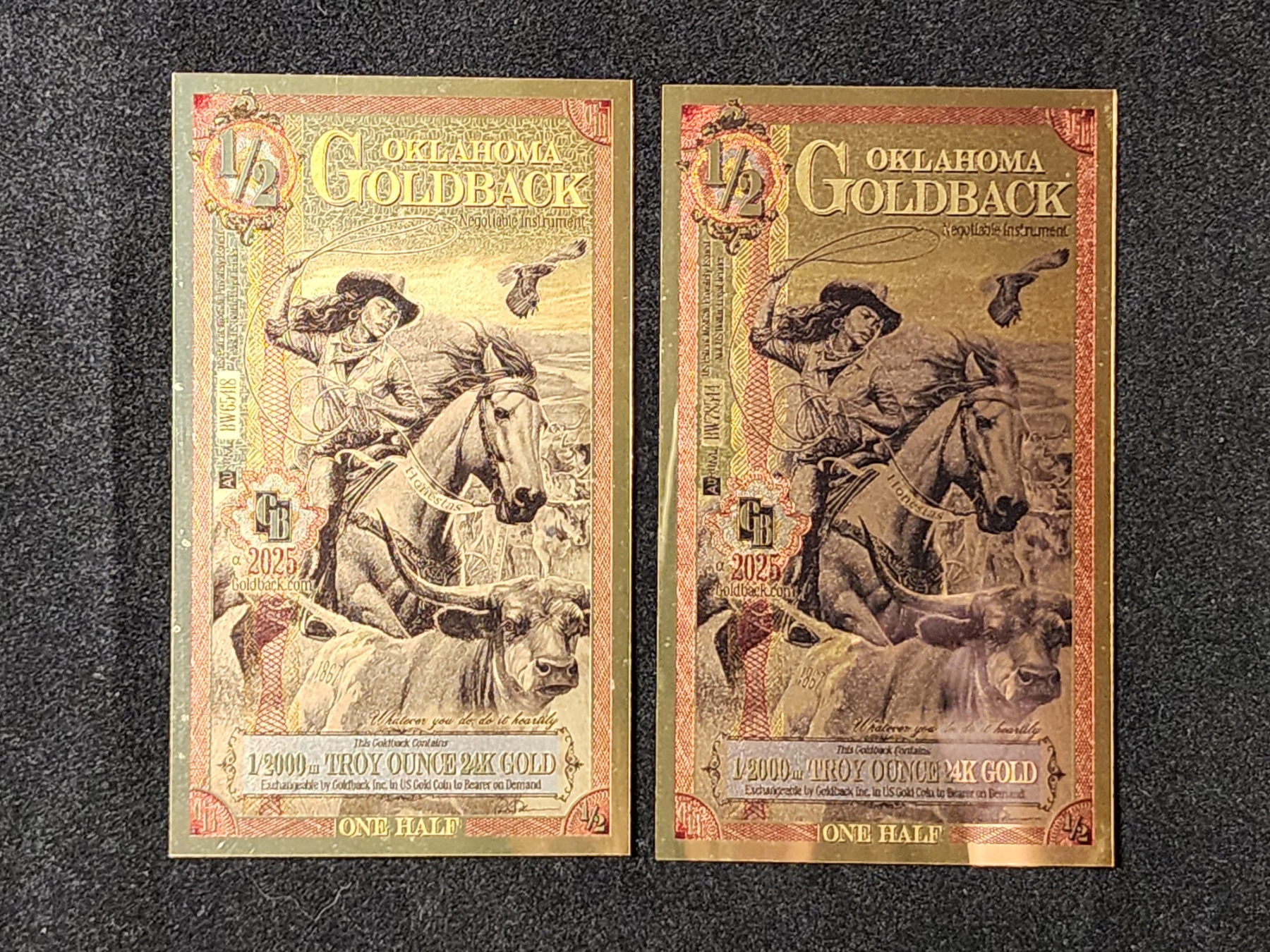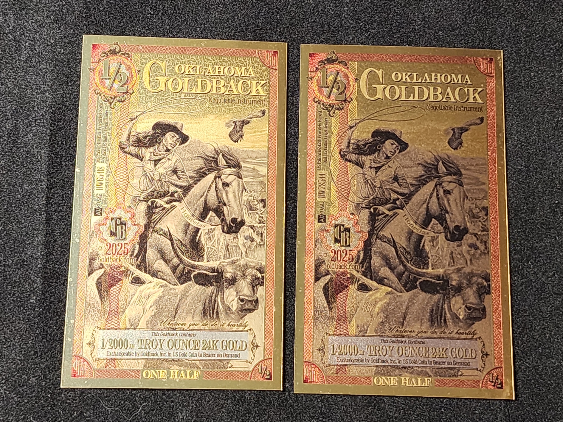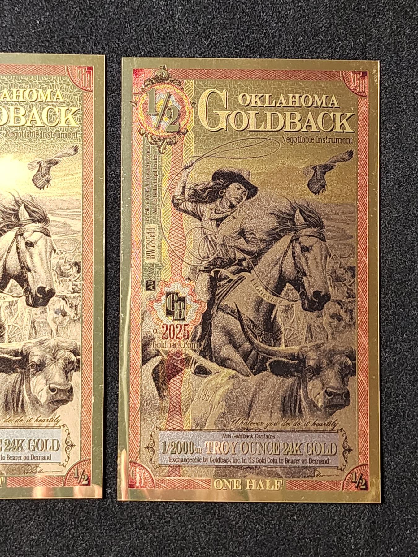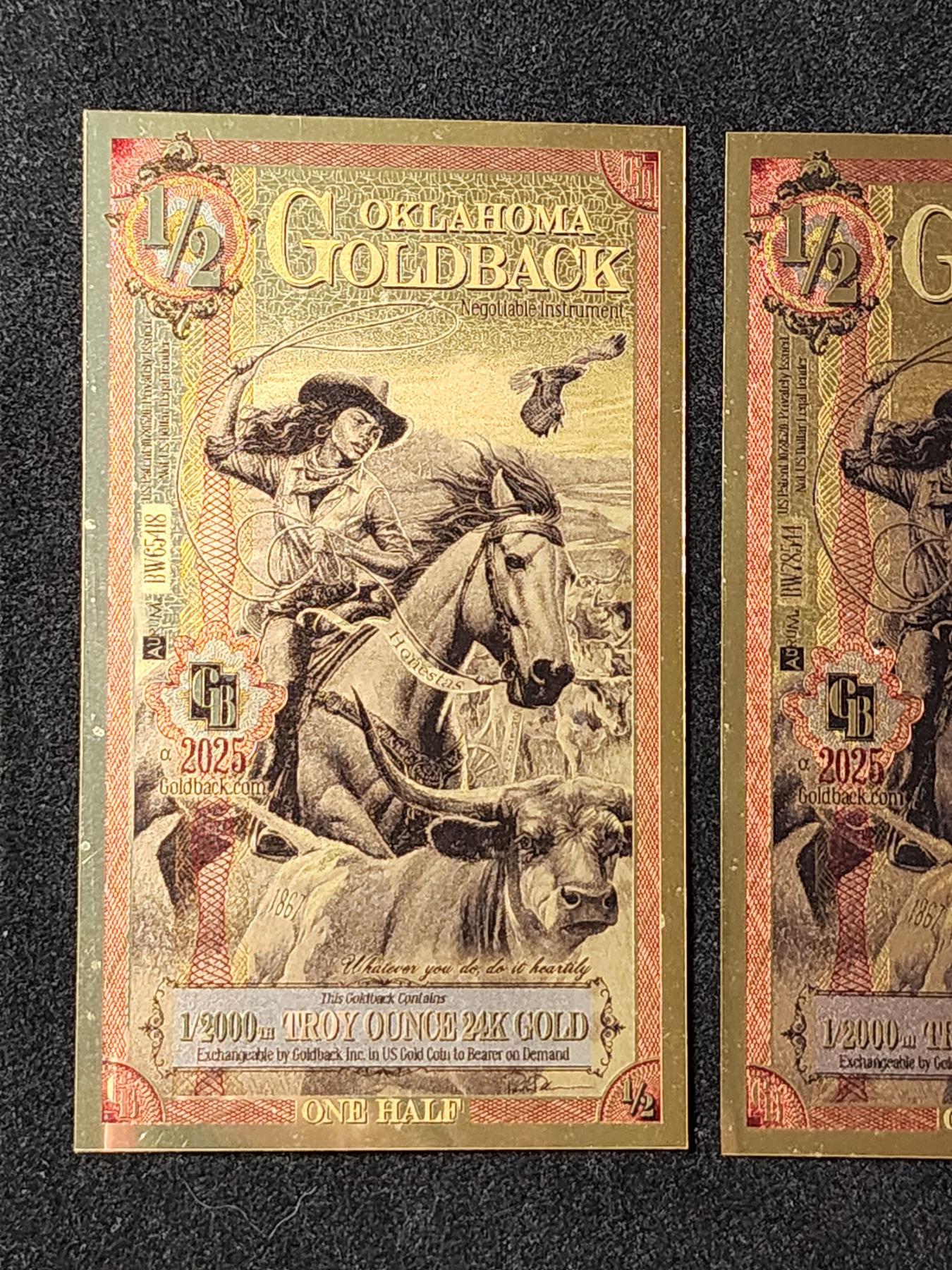 Two 2025 1/2 Oklahoma Goldback Notes - EACH WITH 1/2000TH Troy Ounce 24K Gold