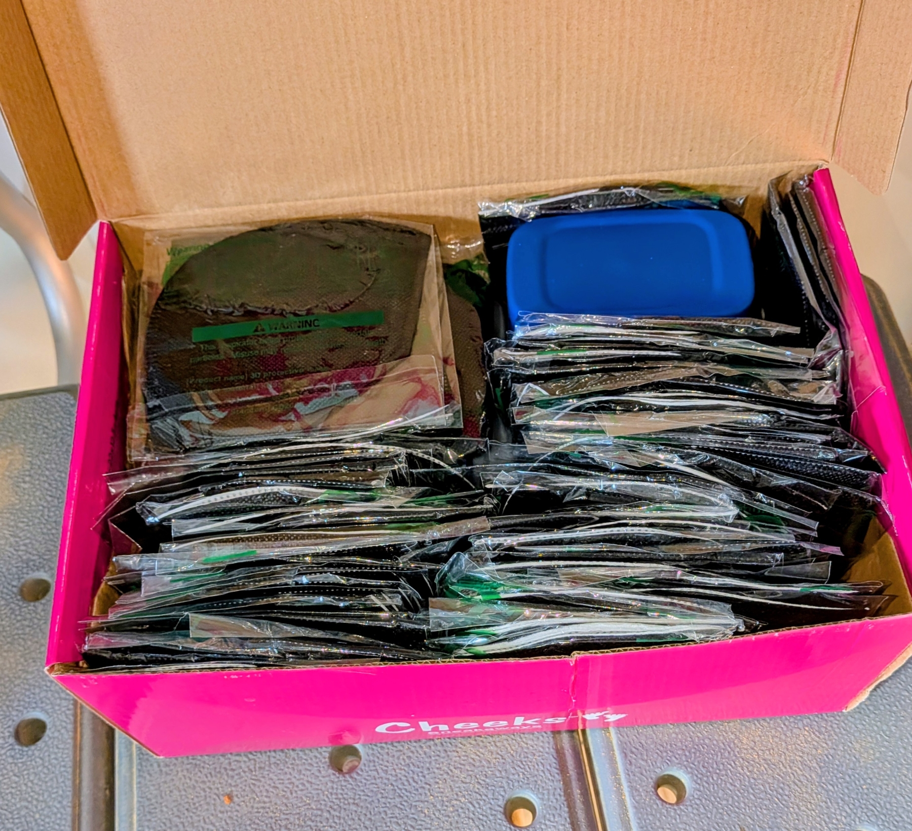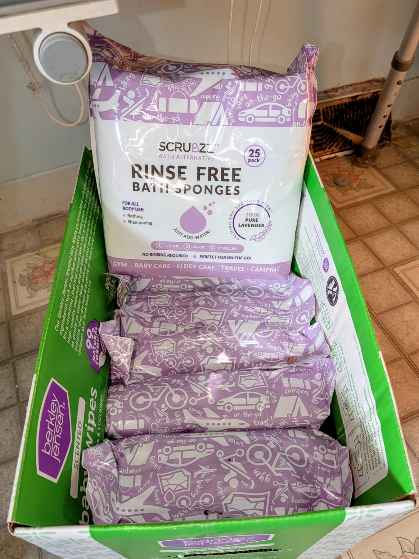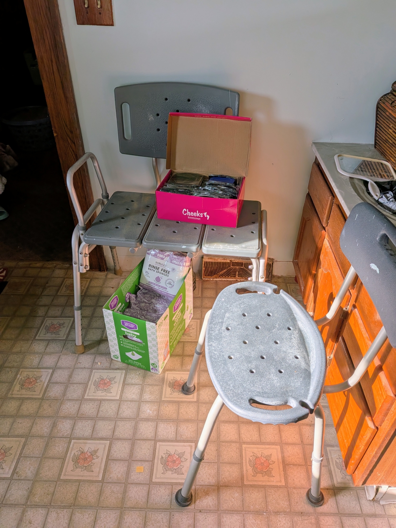 Two Bath/Shower Chairs, Face Masks, & Bath Sponges