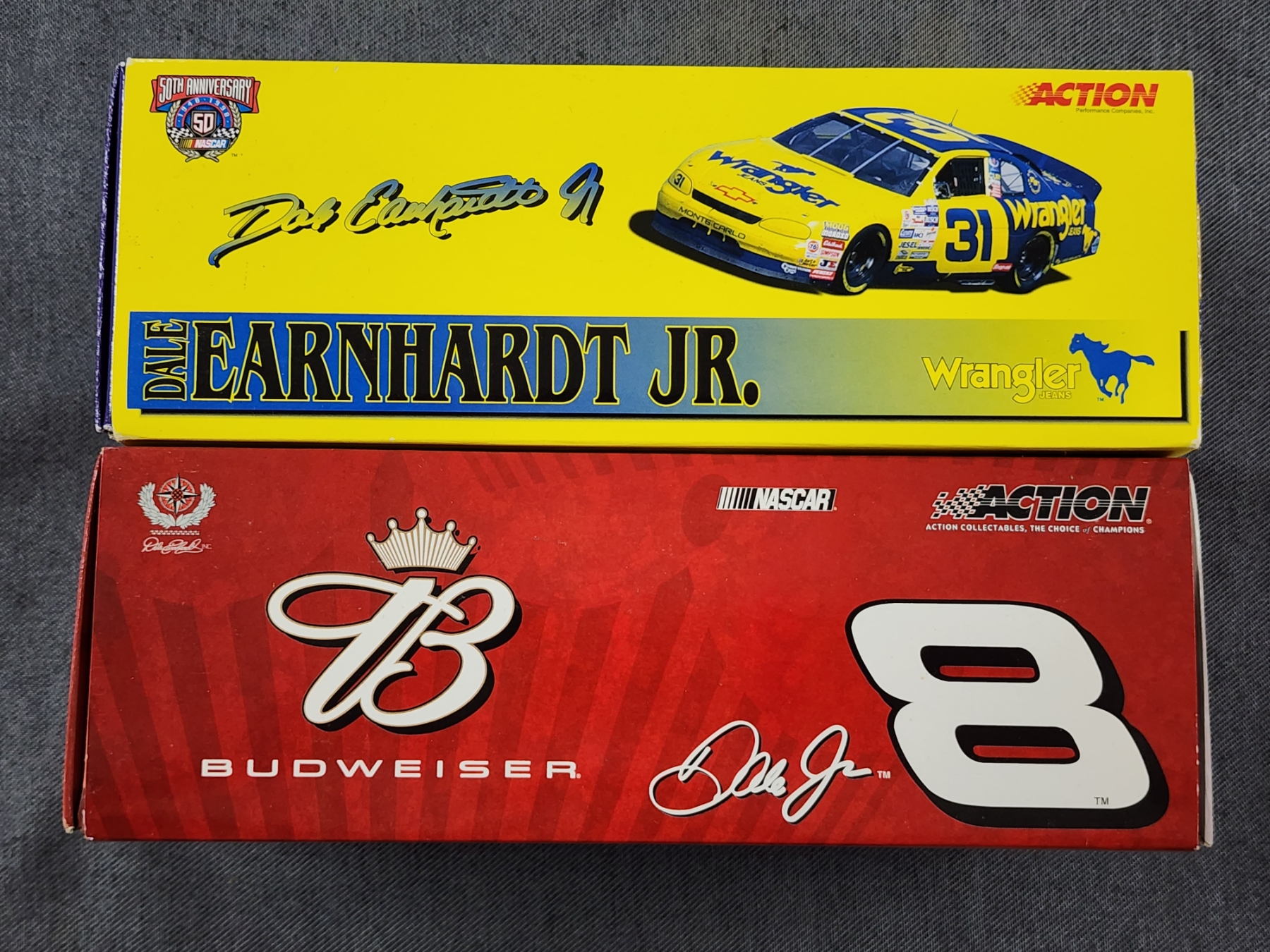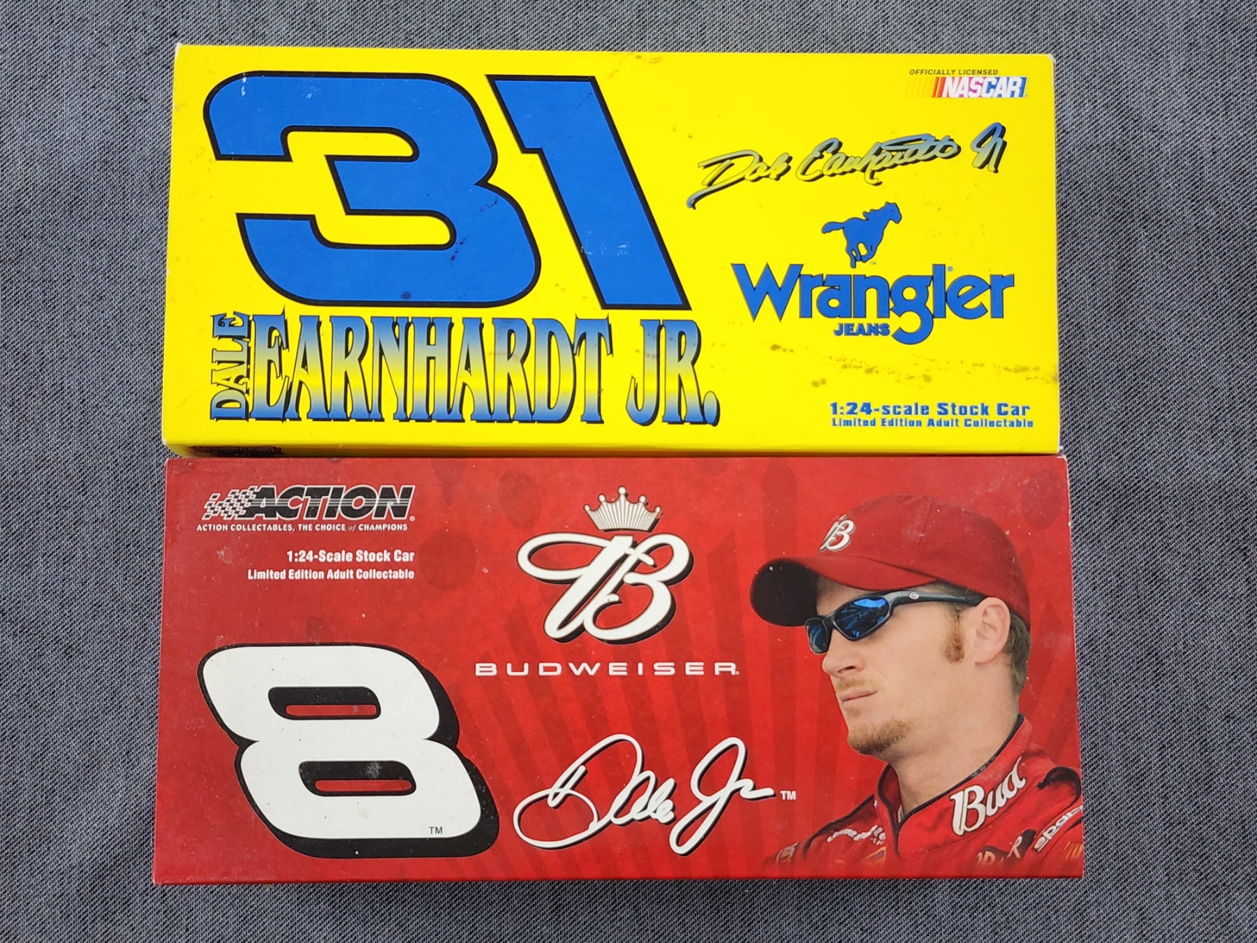 Two Officially Licensed NIB Limited Edition NASCAR Dale Earnhardt JR. ~ 1:24 Scale Stock Cars ~Wrangler & Budweiser!
