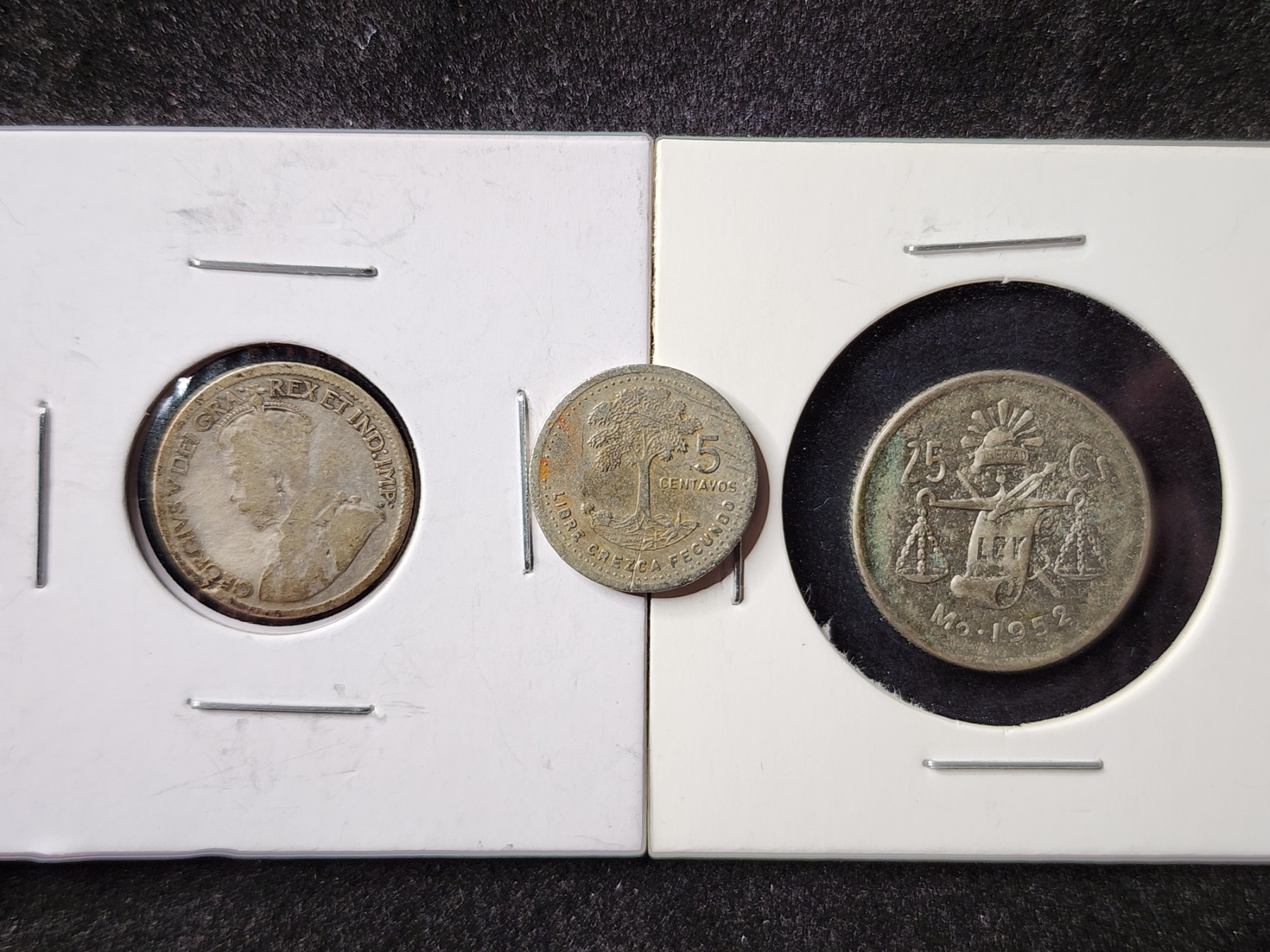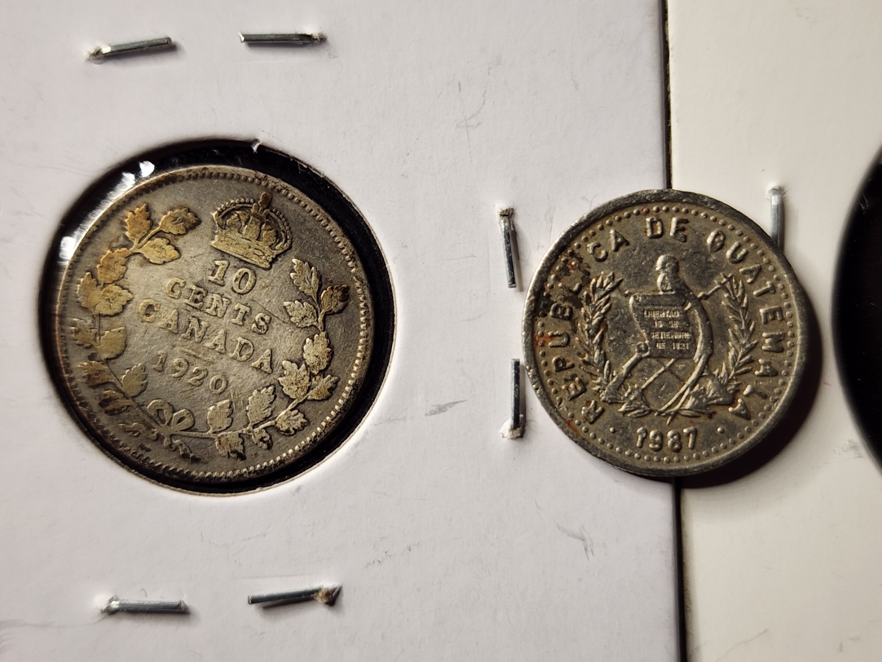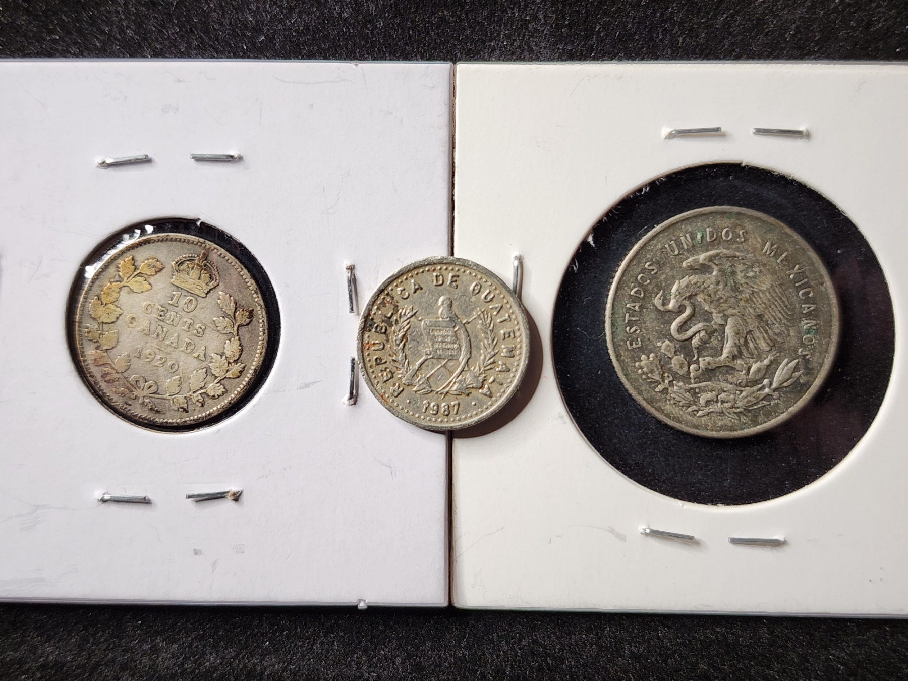 Two Unique Silver World Coins With Added Guatemalan Non Silver - 80% Silver 1920 Canadian Dime, 30% Silver 1952 Estados Unidos & 1987 Guatemalan 5 Centavos Coin
