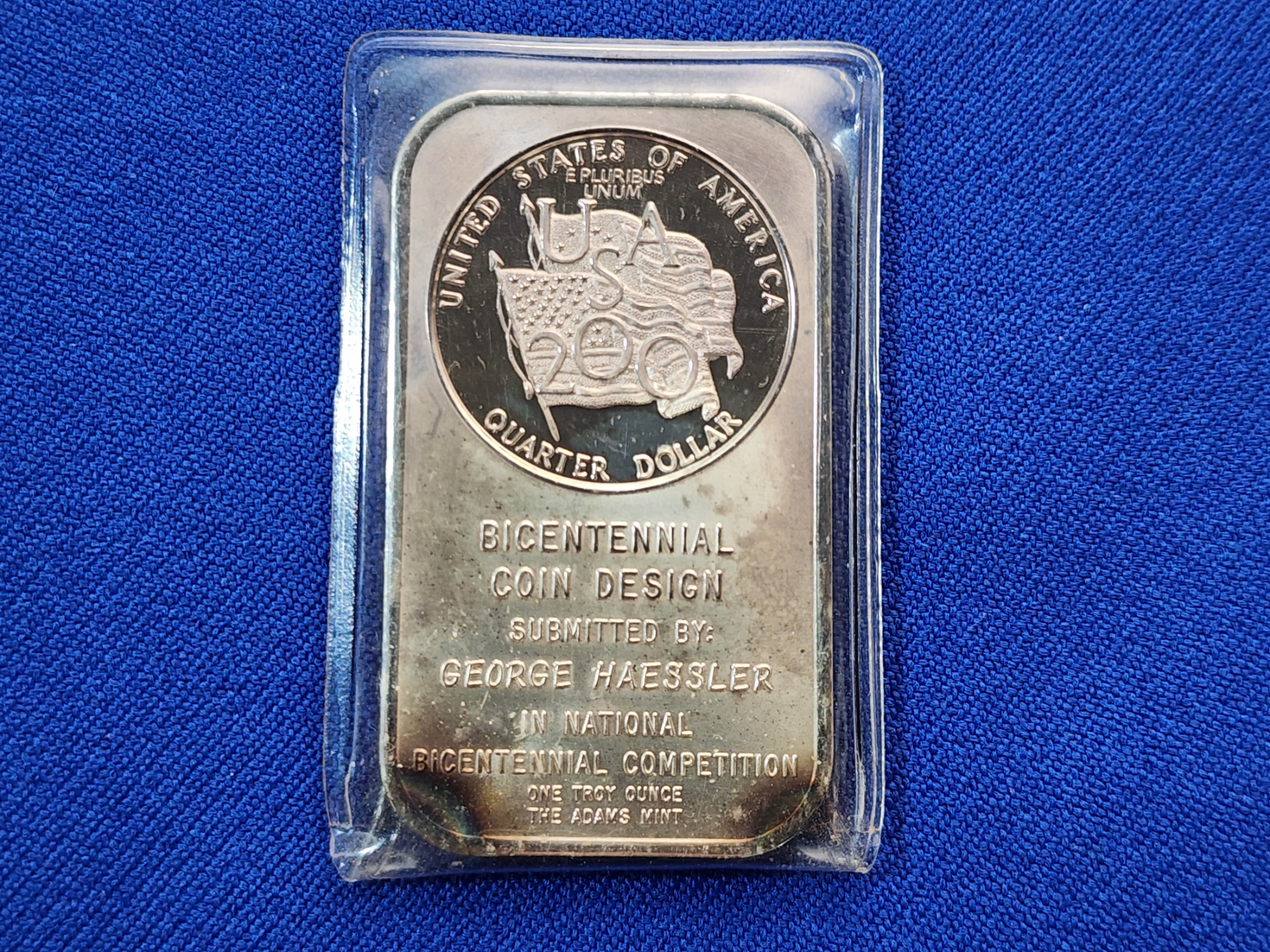 U.S. Bicentennial Coin Design - One Troy Ounce .999 Fine Silver Bar - The Adams Mint