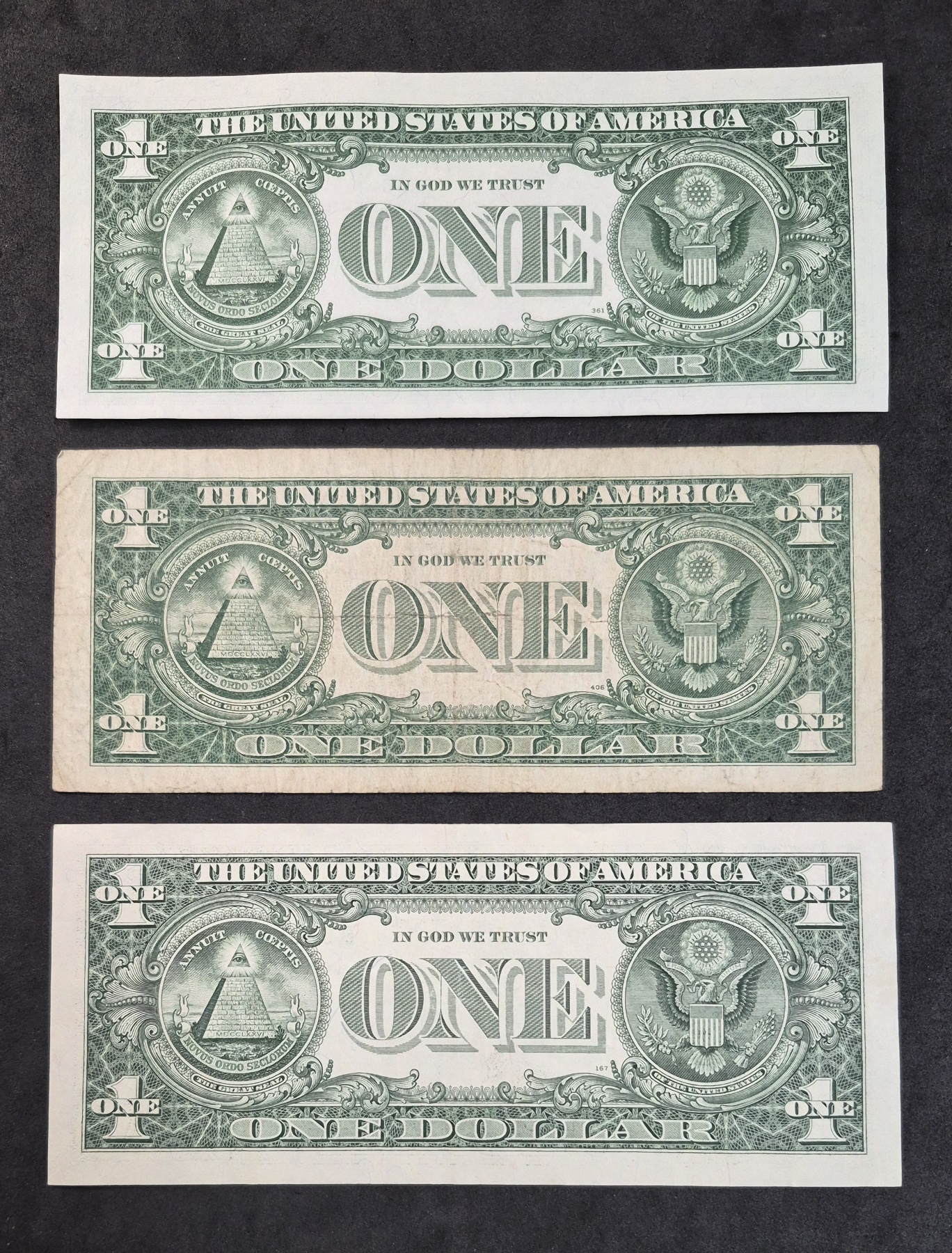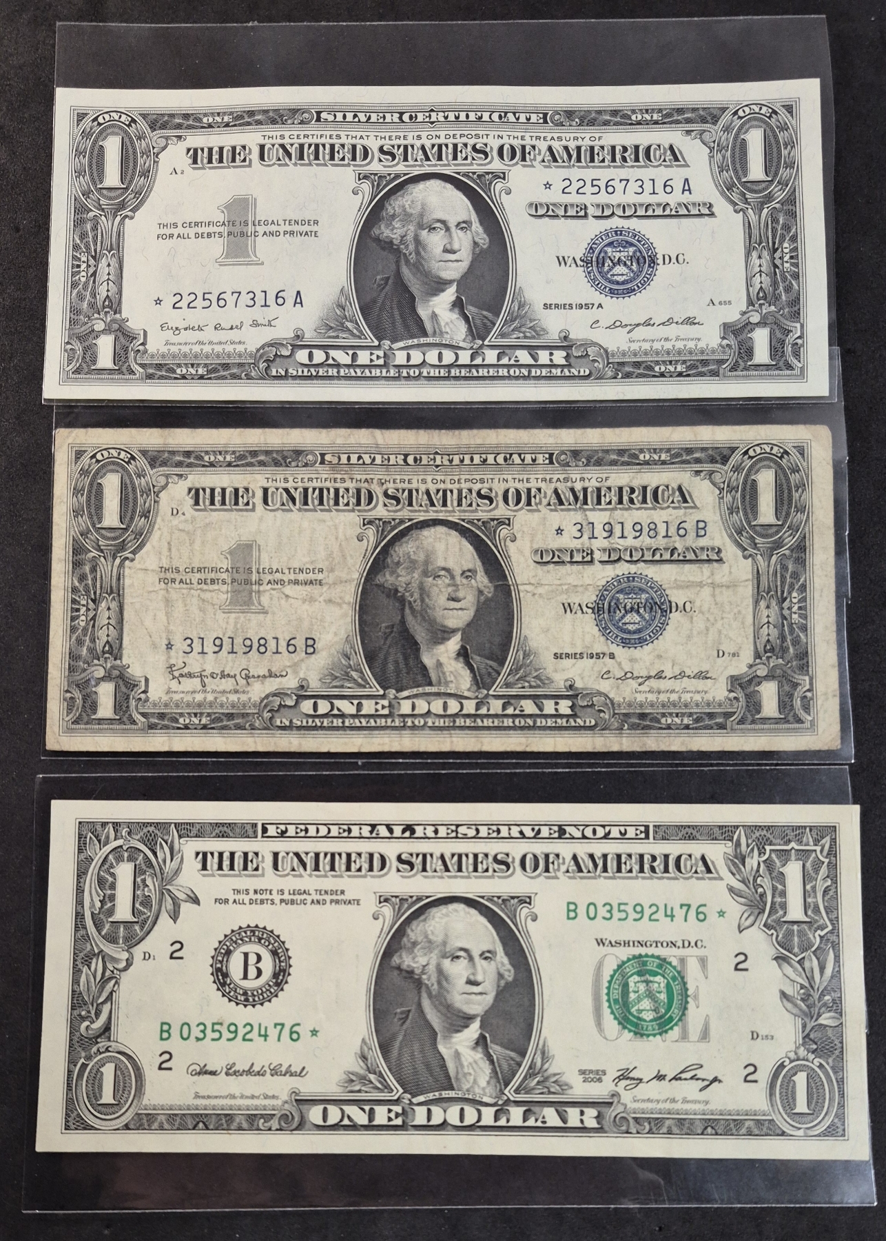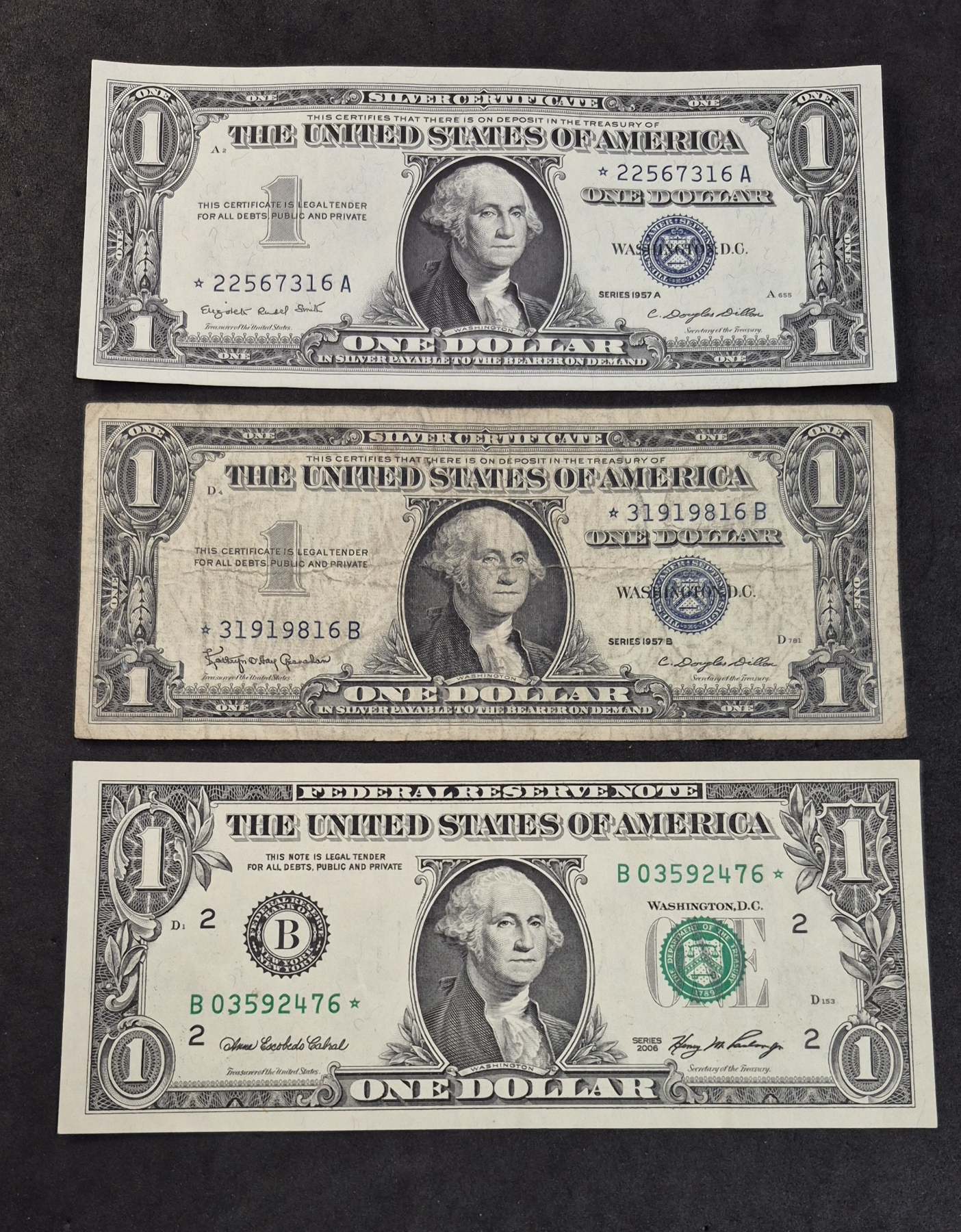 U.S. CURRENCY - RARE STAR NOTES - 2 $1 Silver Certificates (Uncirculated) & 1 Federal Reserve Note - Serious Collectors know the Rarity of Star Notes (Replacement Notes sent to banks for returns of damaged returns) And the condition of two of these in this offering is exceptional uncirculated.