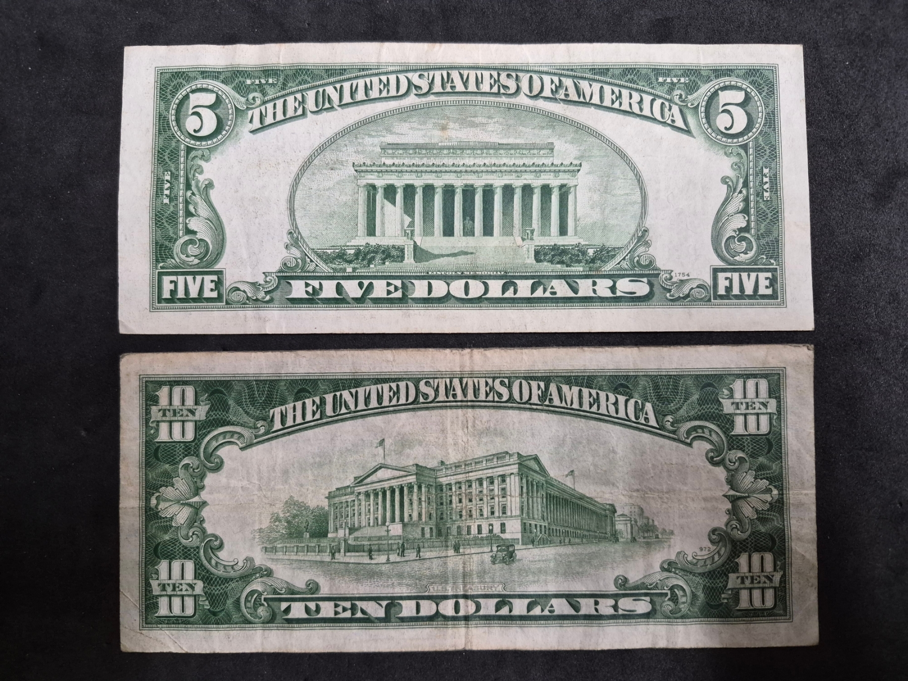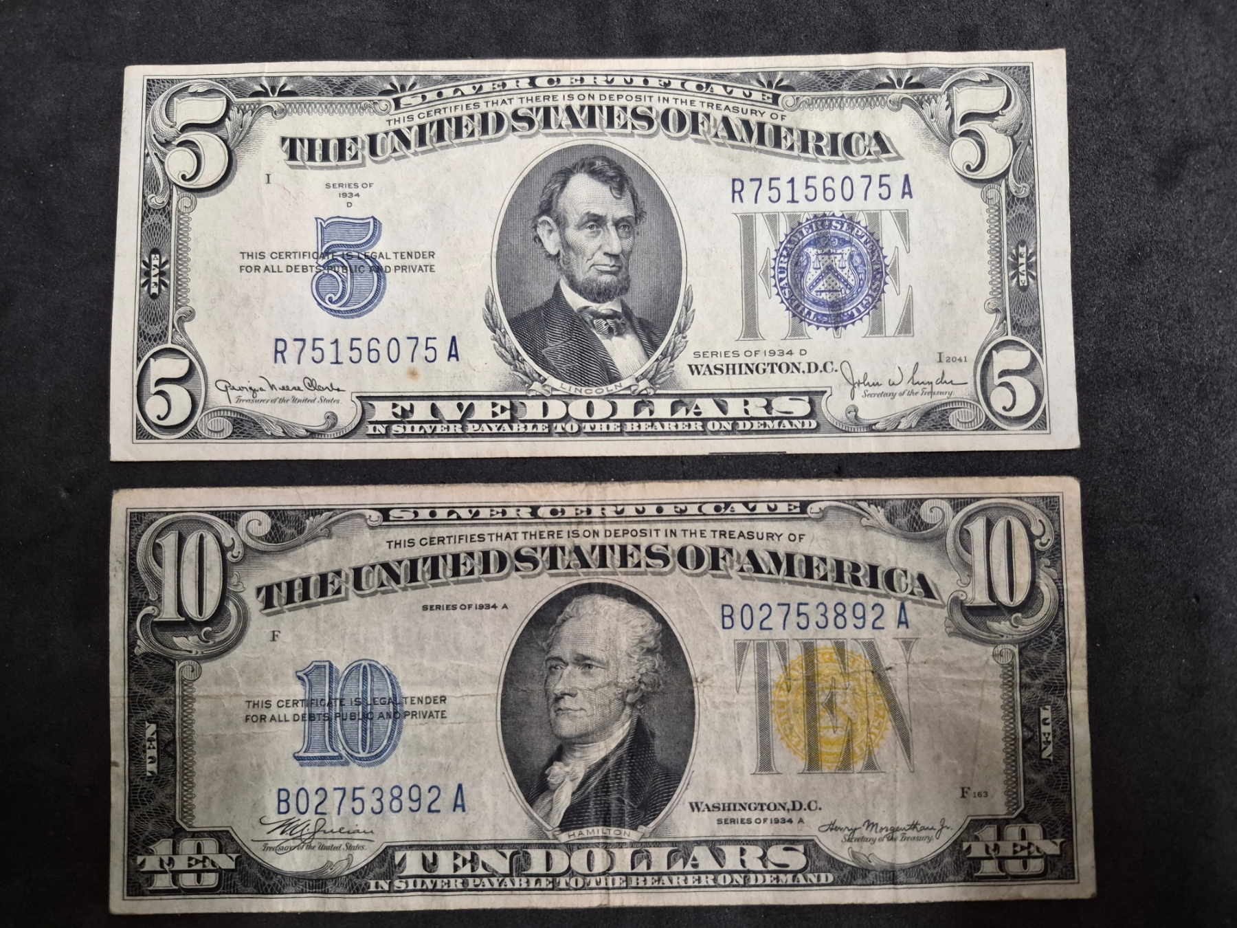 U.S. Silver Certificates - 1934A $10 Yellow Seal & 1934D $5 Blue Seal - Hard To Find Vintage Notes - Circulated Condition