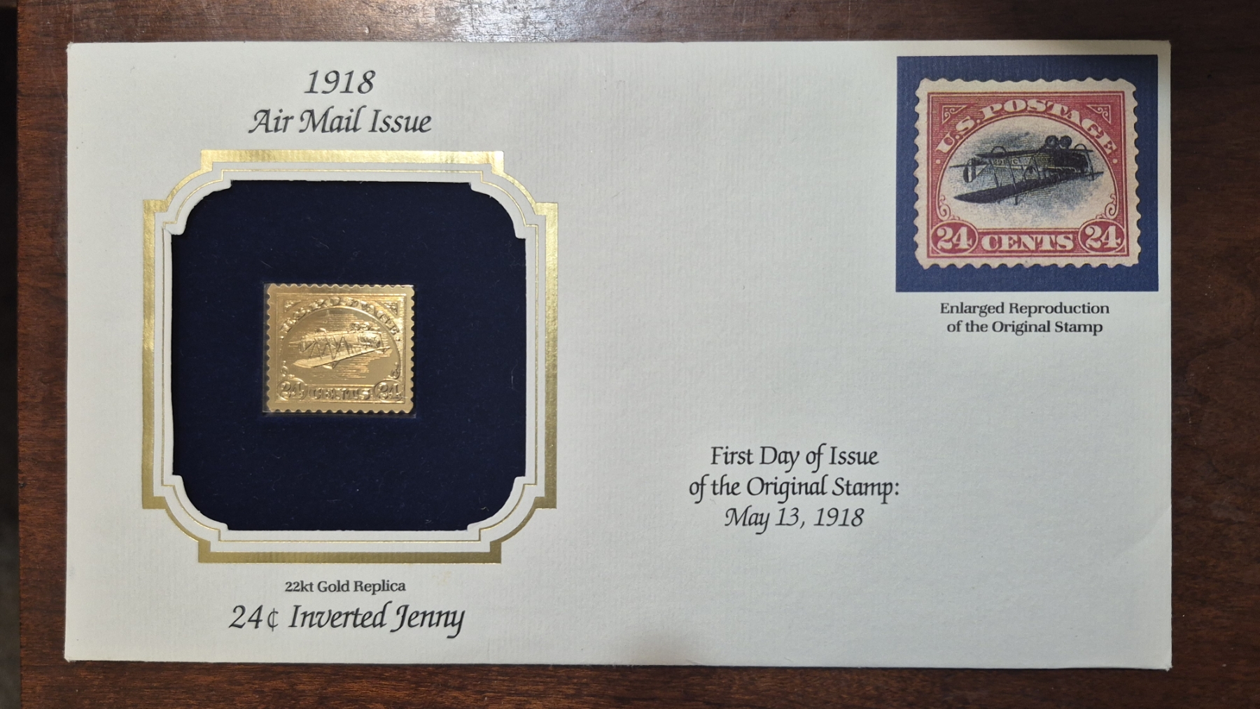 US STAMPS - 24K GOLD 1918 AIR MAIL 24C ERROR STAMP & FIRST DAY OF ISSUE POSTAGE