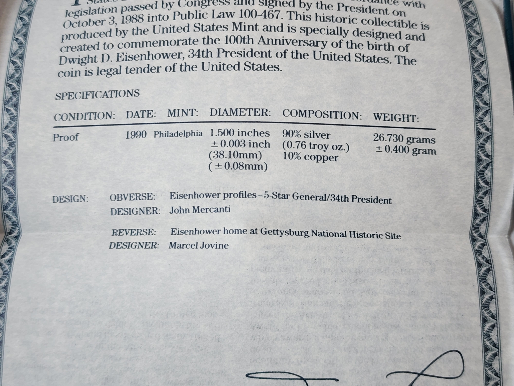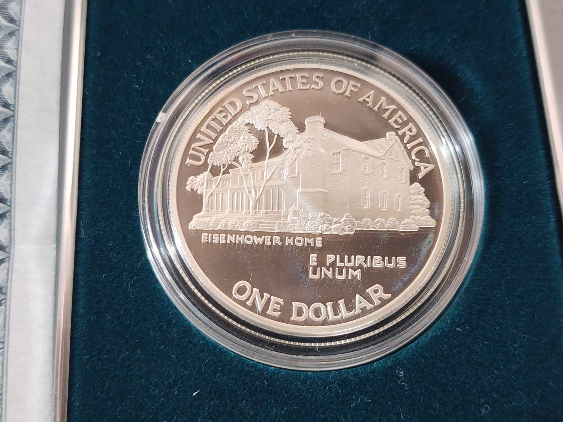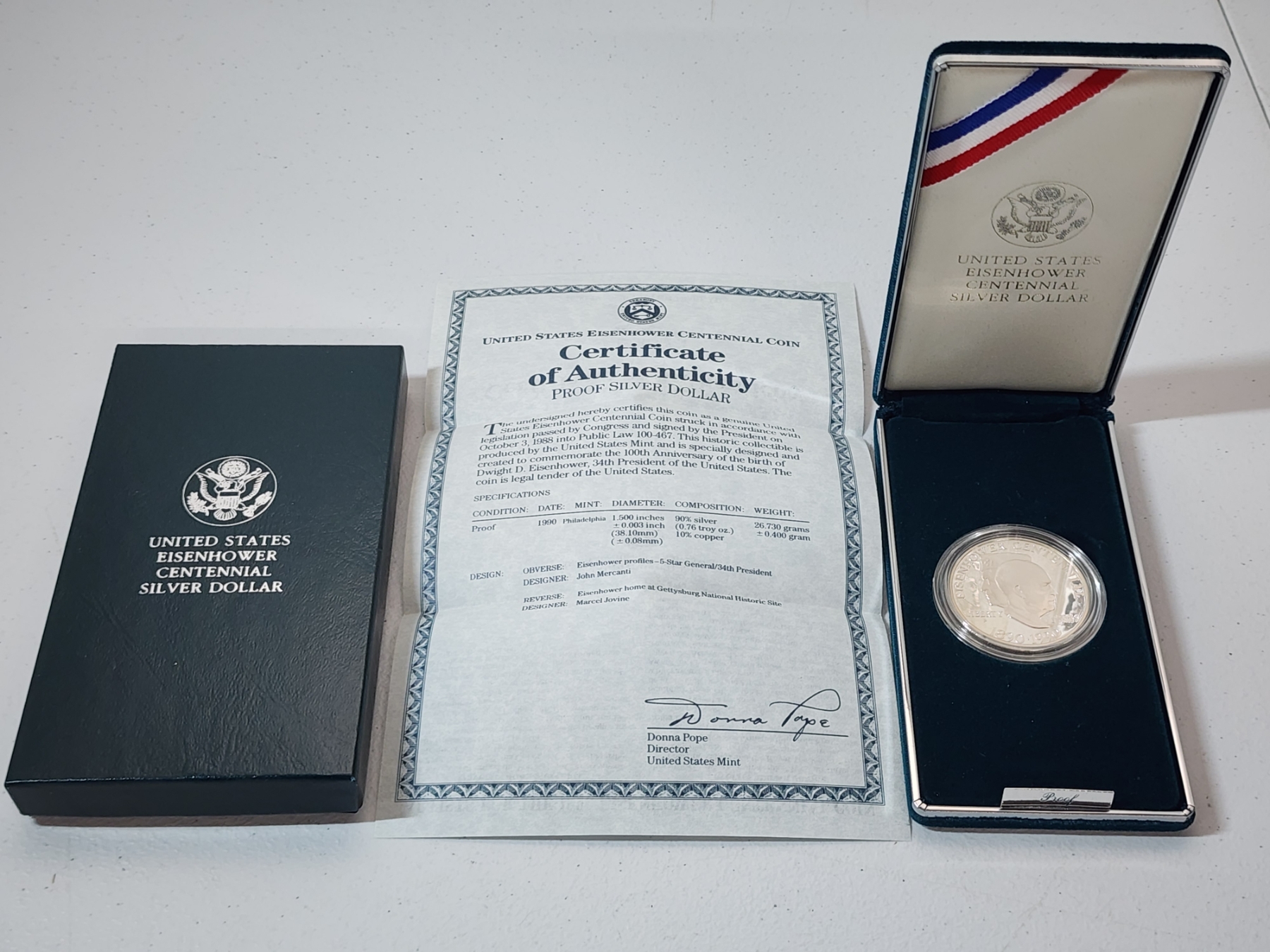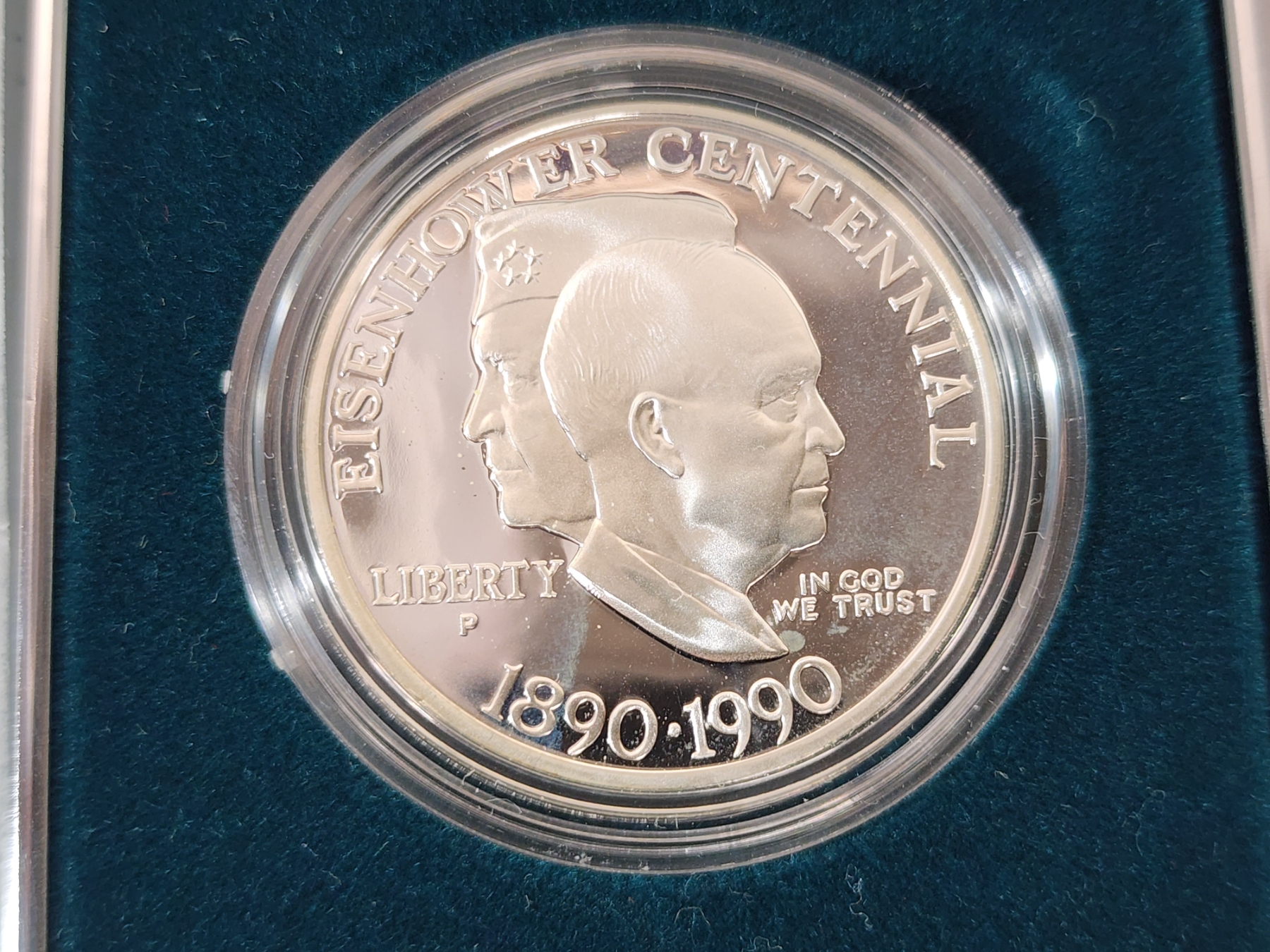 United States 1990 Eisenhower Centennial Coin Proof Silver Dollar - 90% Silver - With Box & CoA