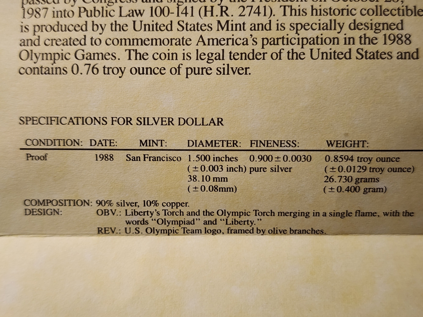 United States Olympic Commemorative 1988 Proof Silver Dollar ~ ASW: 0.8594 Oz ~ In Original Packaging!