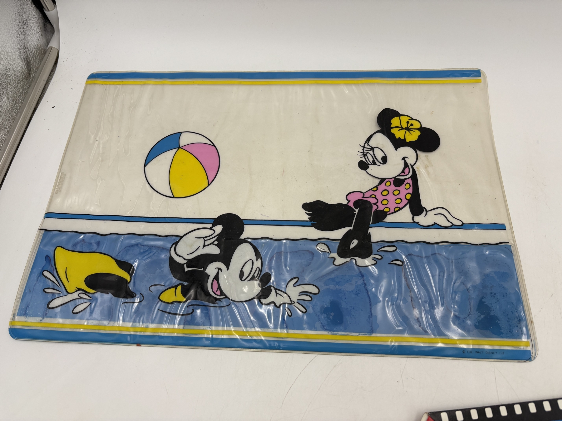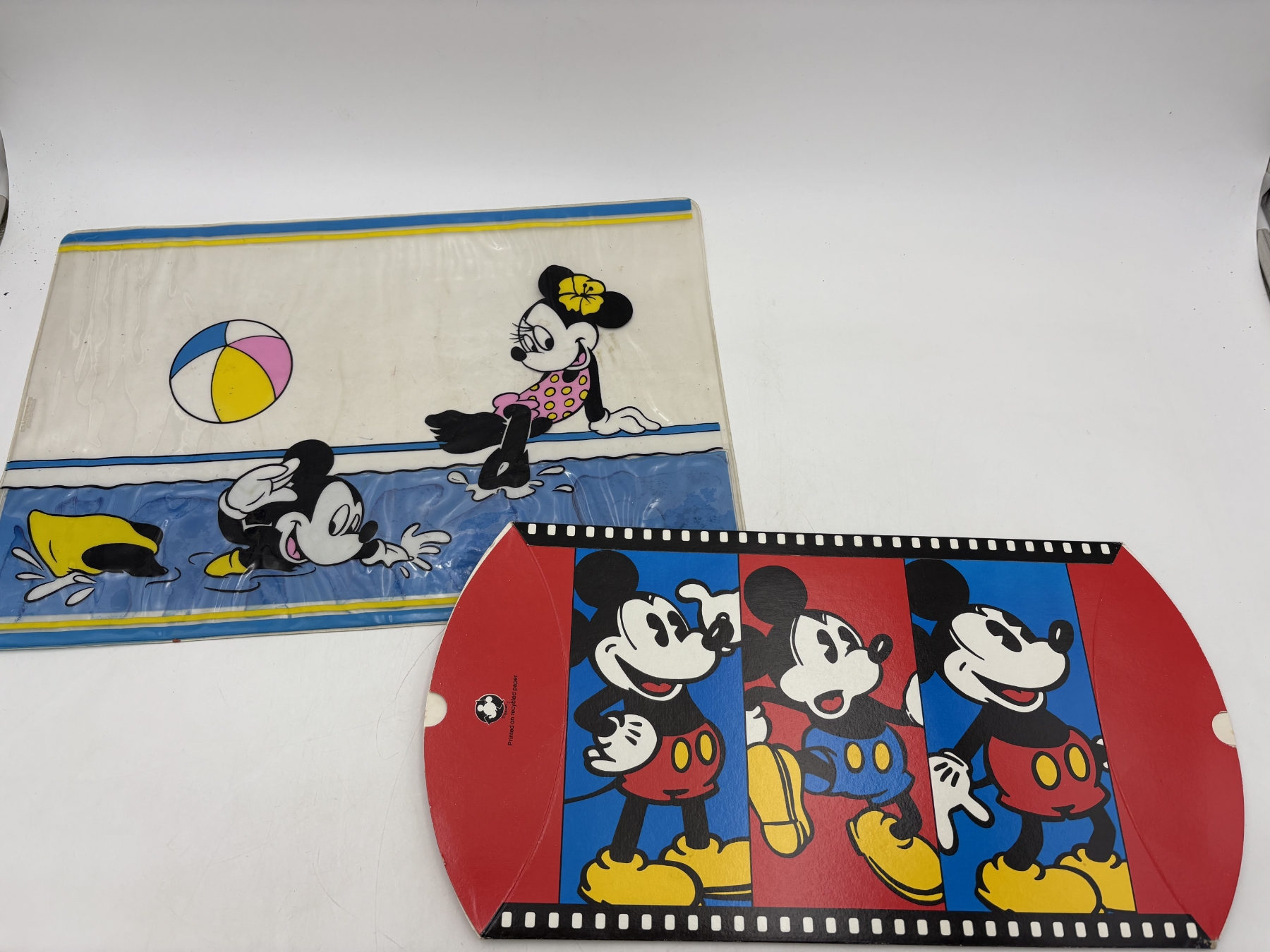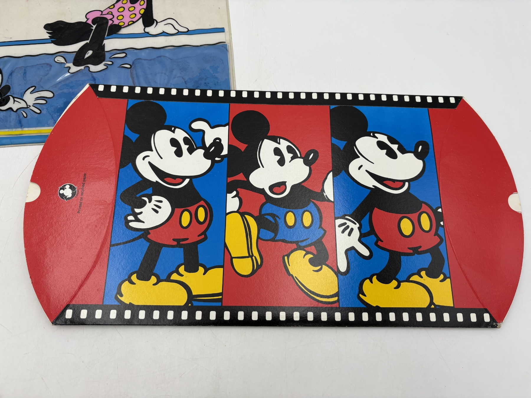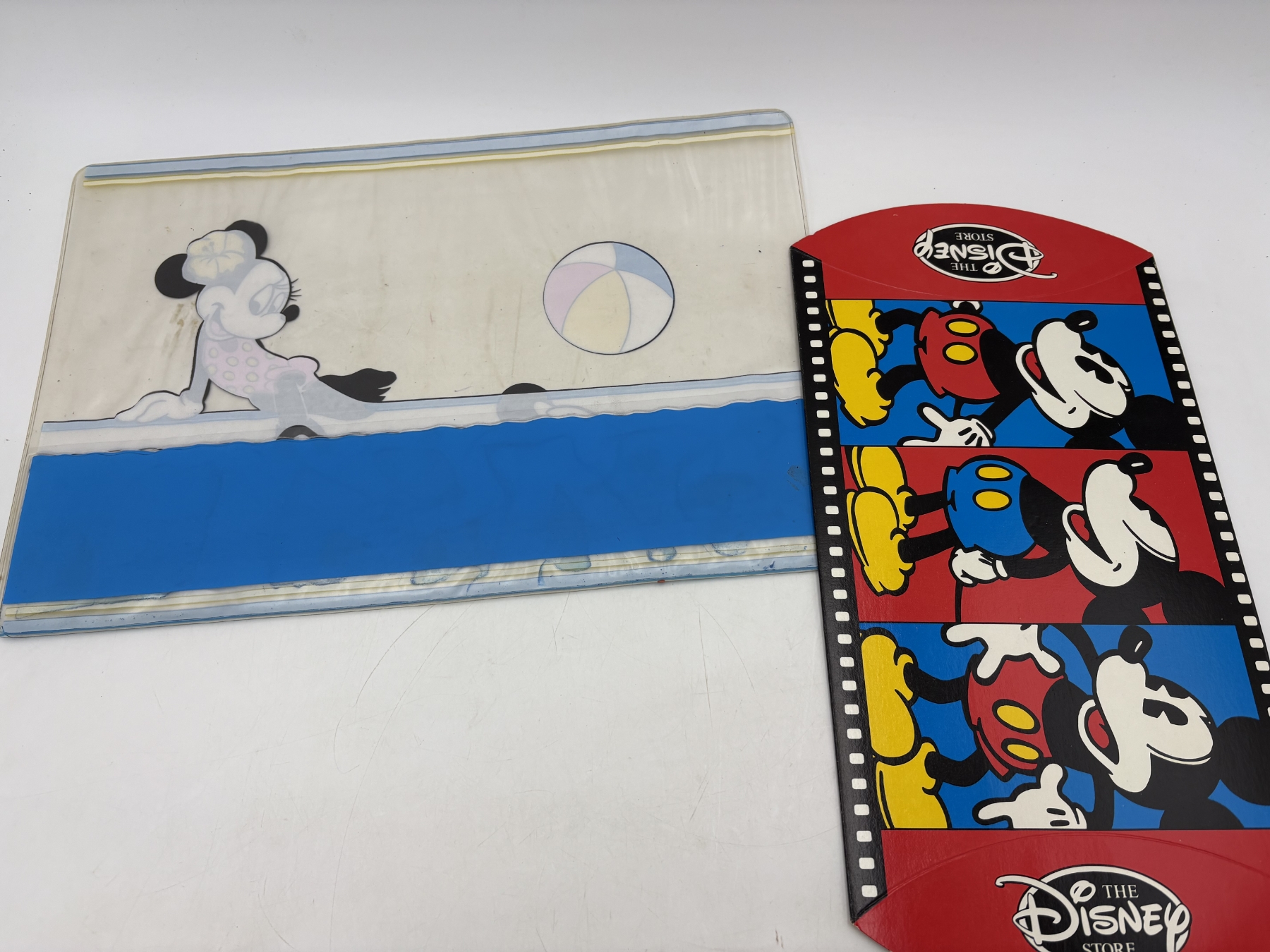 Vintage 1970's H.J Stotter Disney Mickey & Minnie Mouse Art Clear Vinyl 18" Beach Mat & Disney Store Mickey Mouse cardboard gift box from 1990