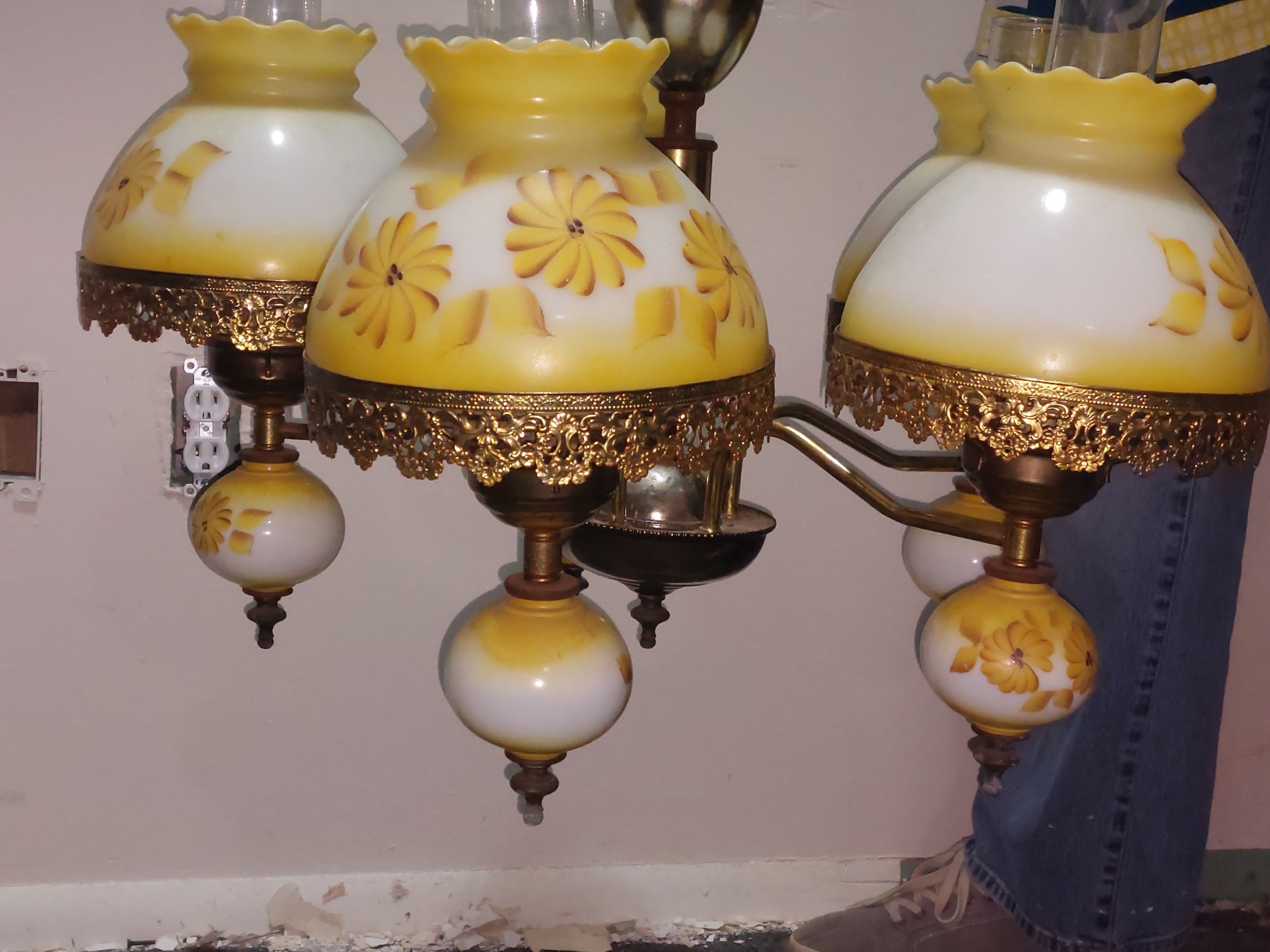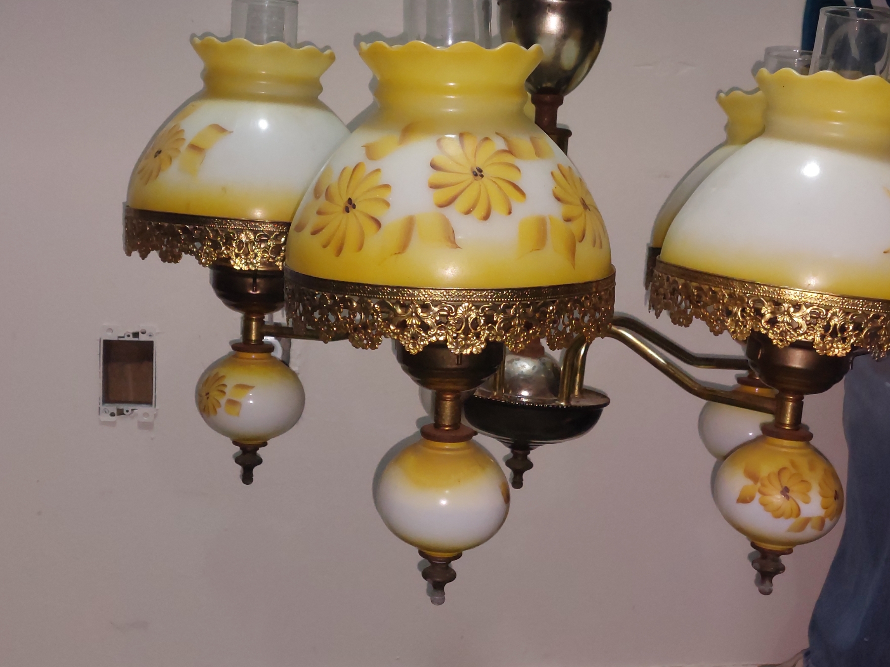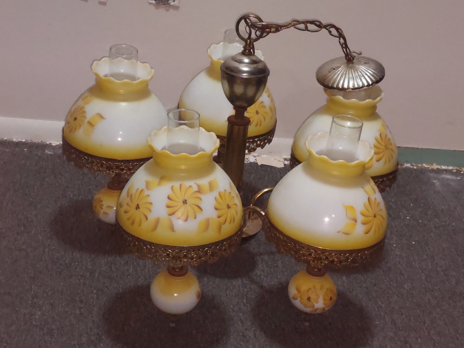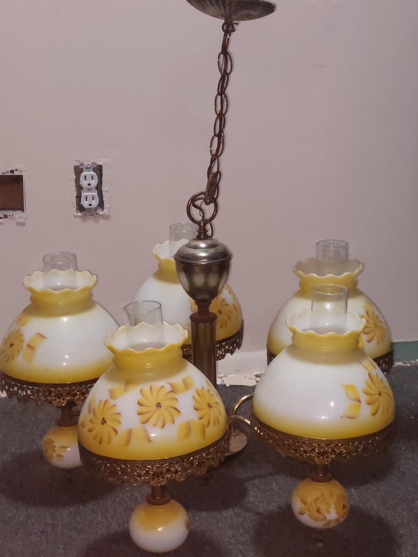 Vintage 5 Globe Yellow Flower Painted Over Milk Glass Shades - Electric - Just Needs Wiring Extention & Chain