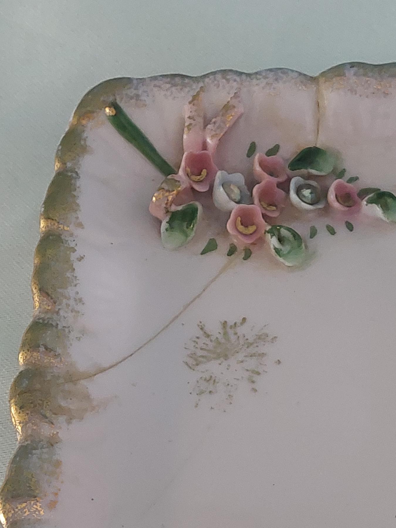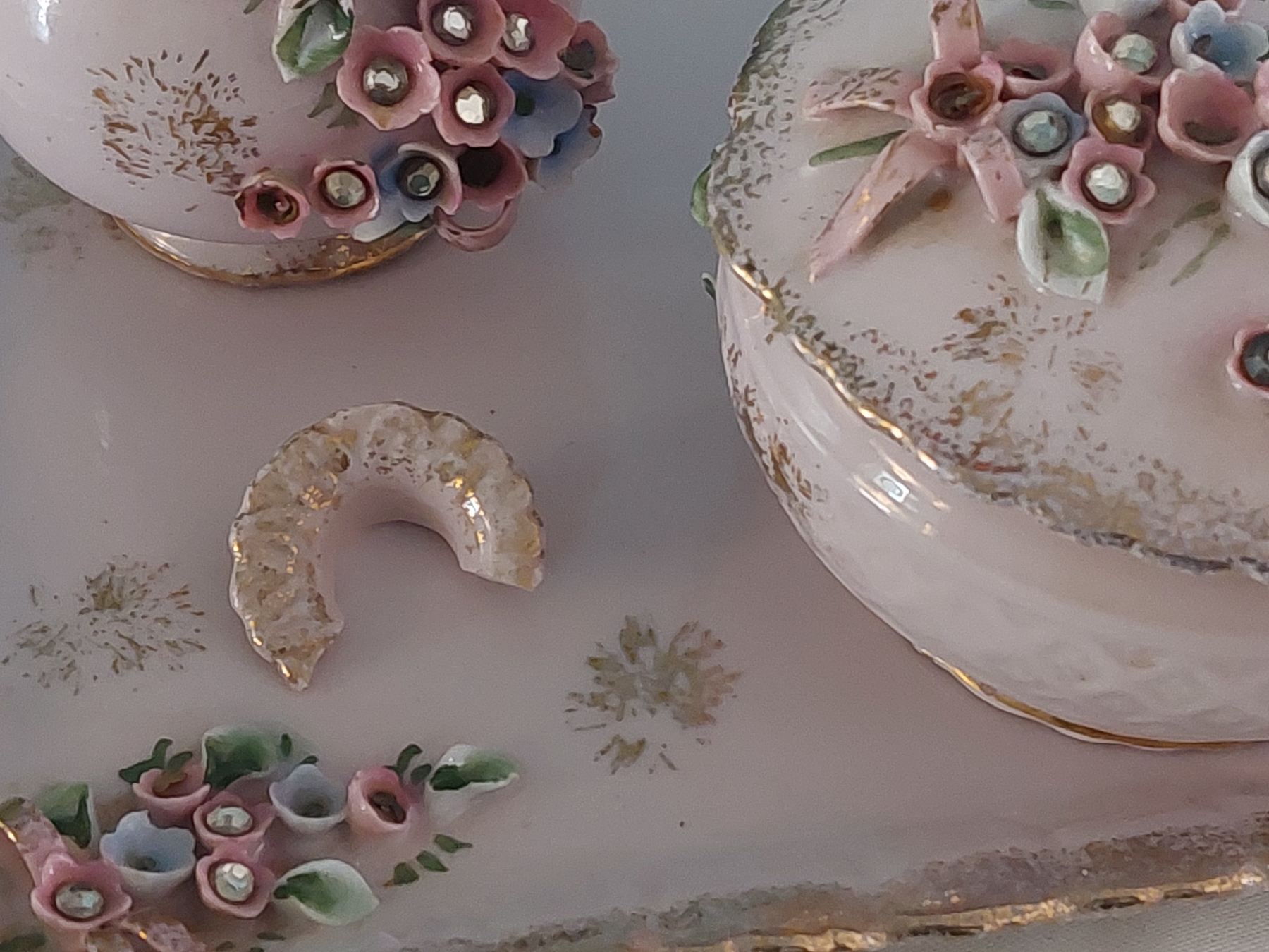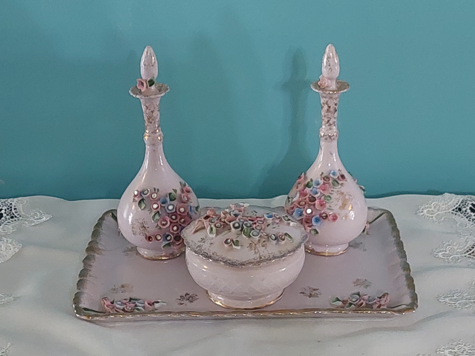 Vintage 5 Pc ladies Dresser Set - Pink Floral Motif - Underplate has been repaired - see pics AS IS