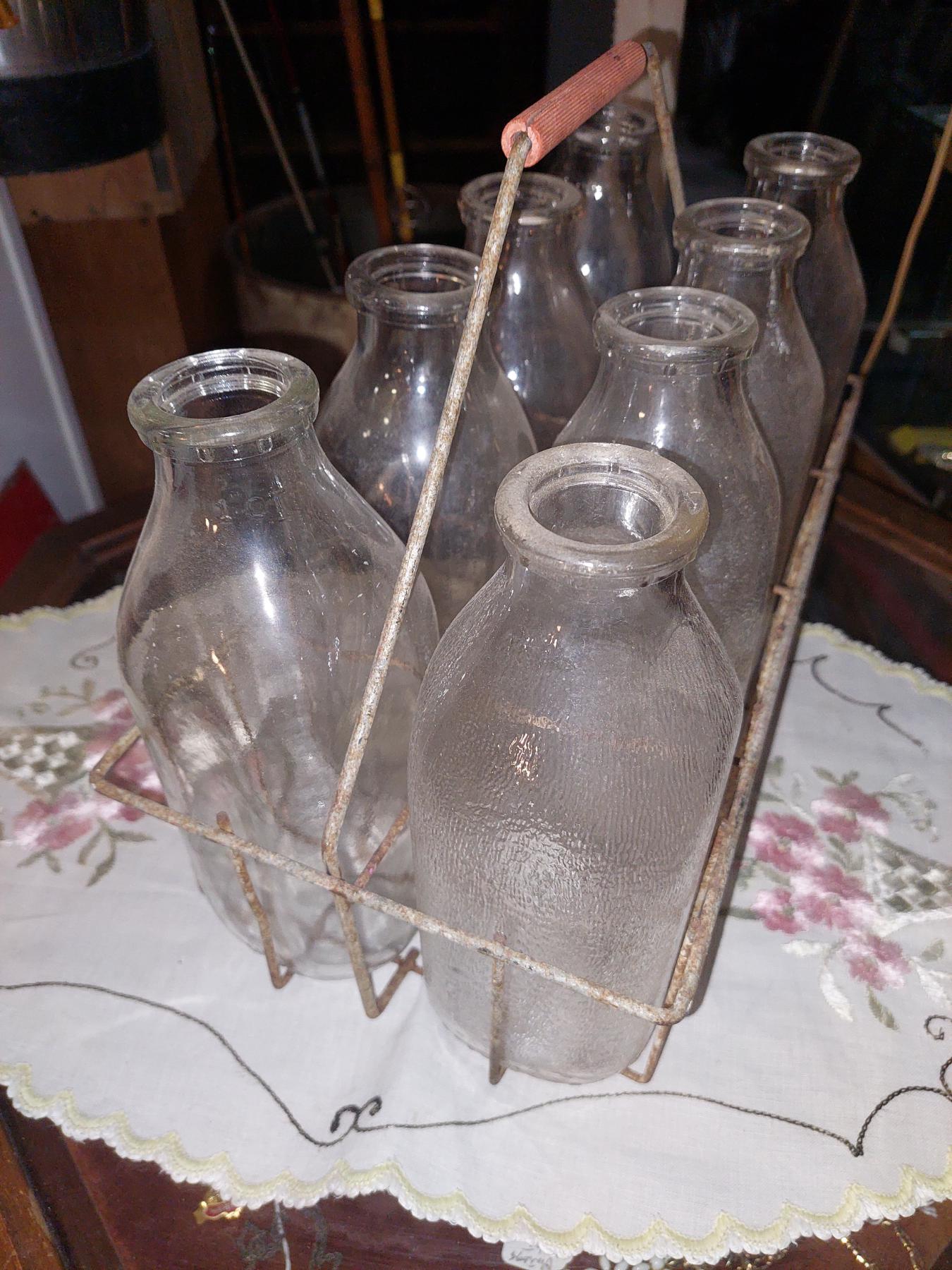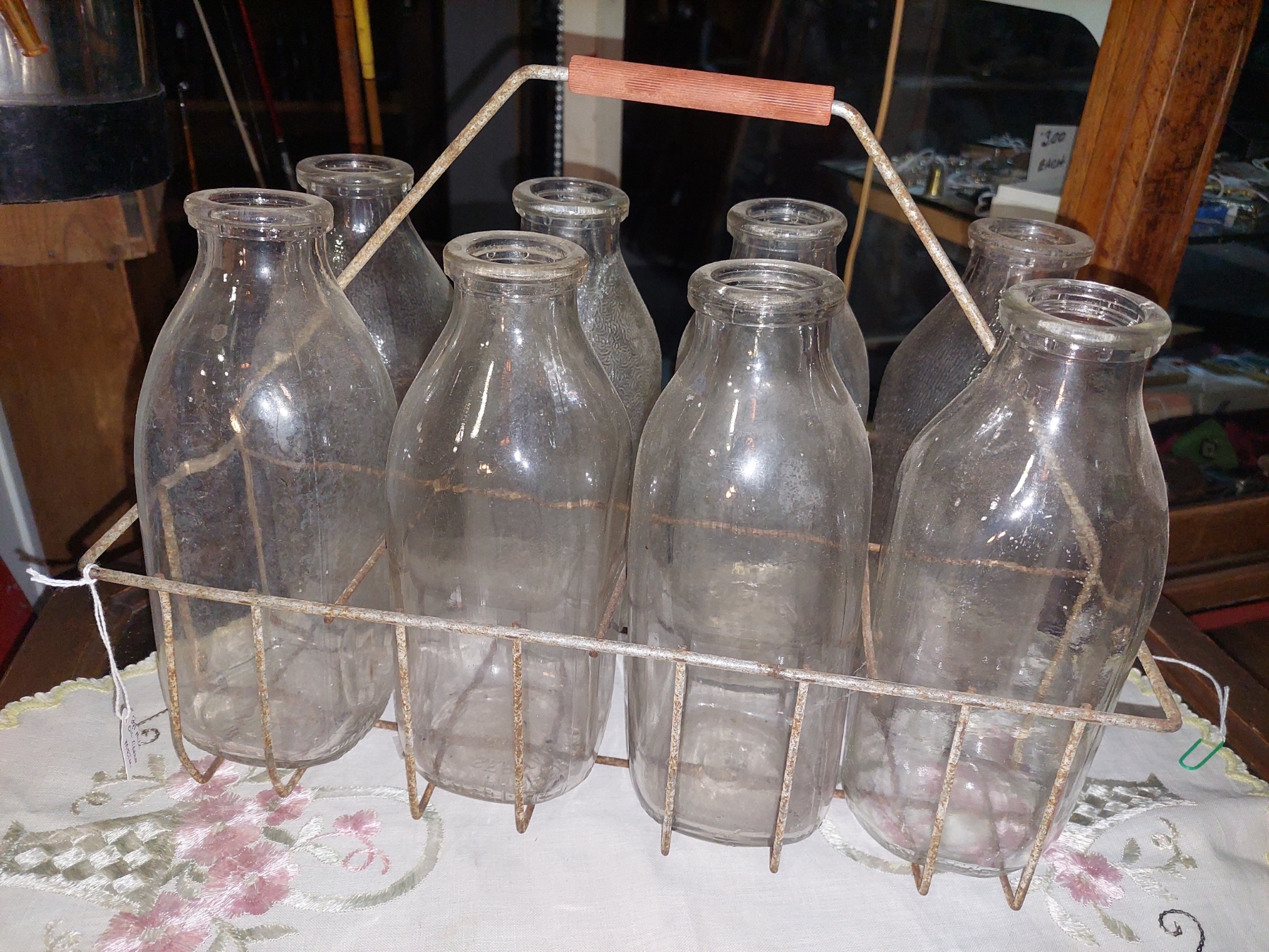 Vintage 8 Milk Bottles & Carry Rack - See Pics