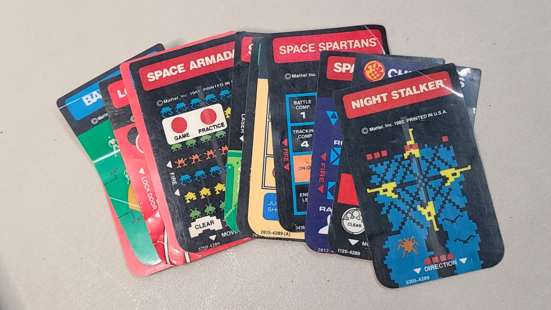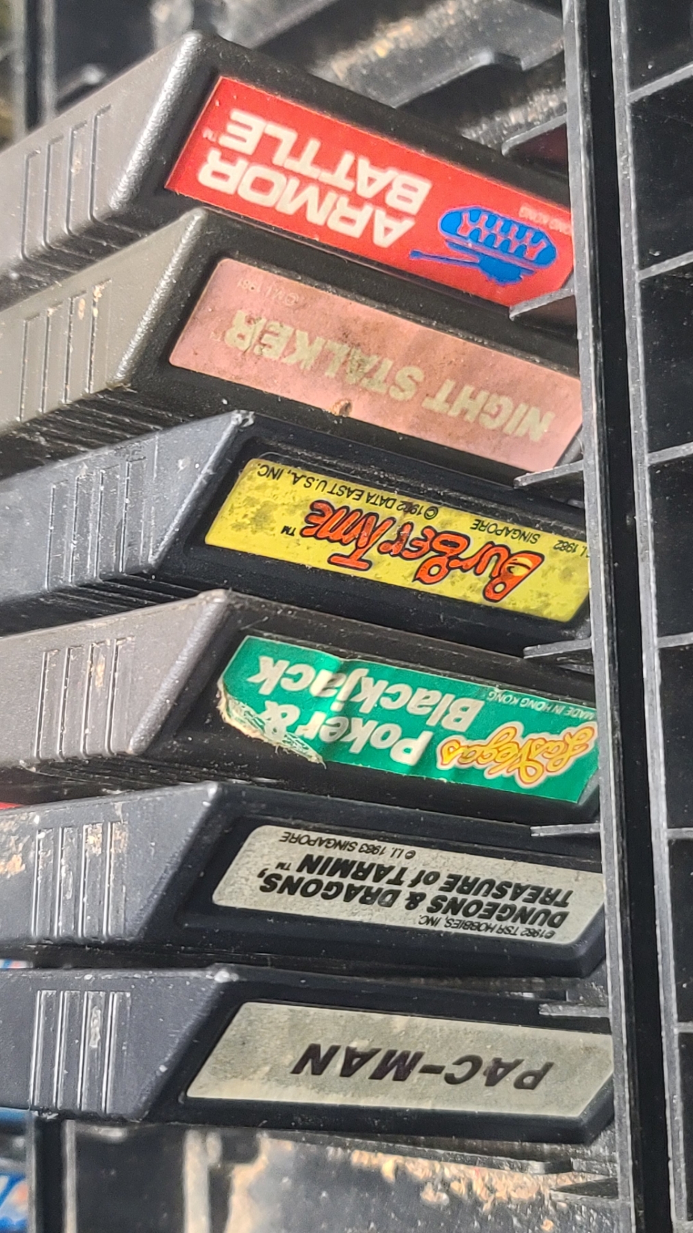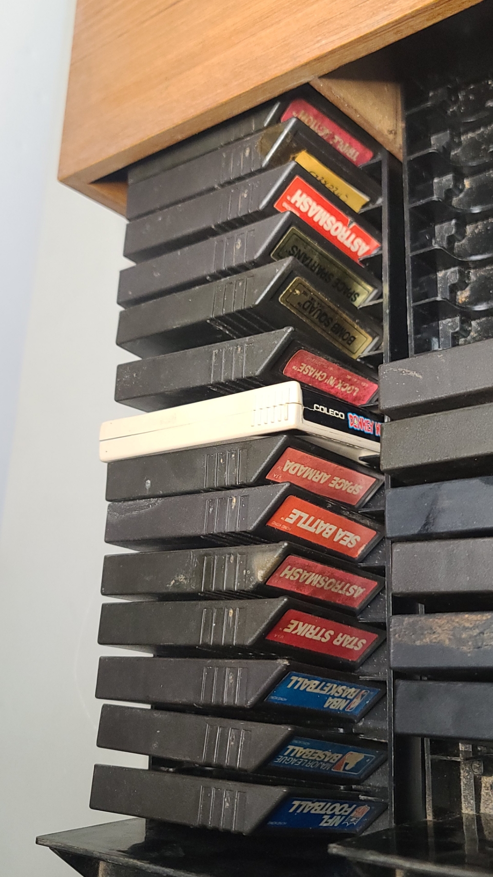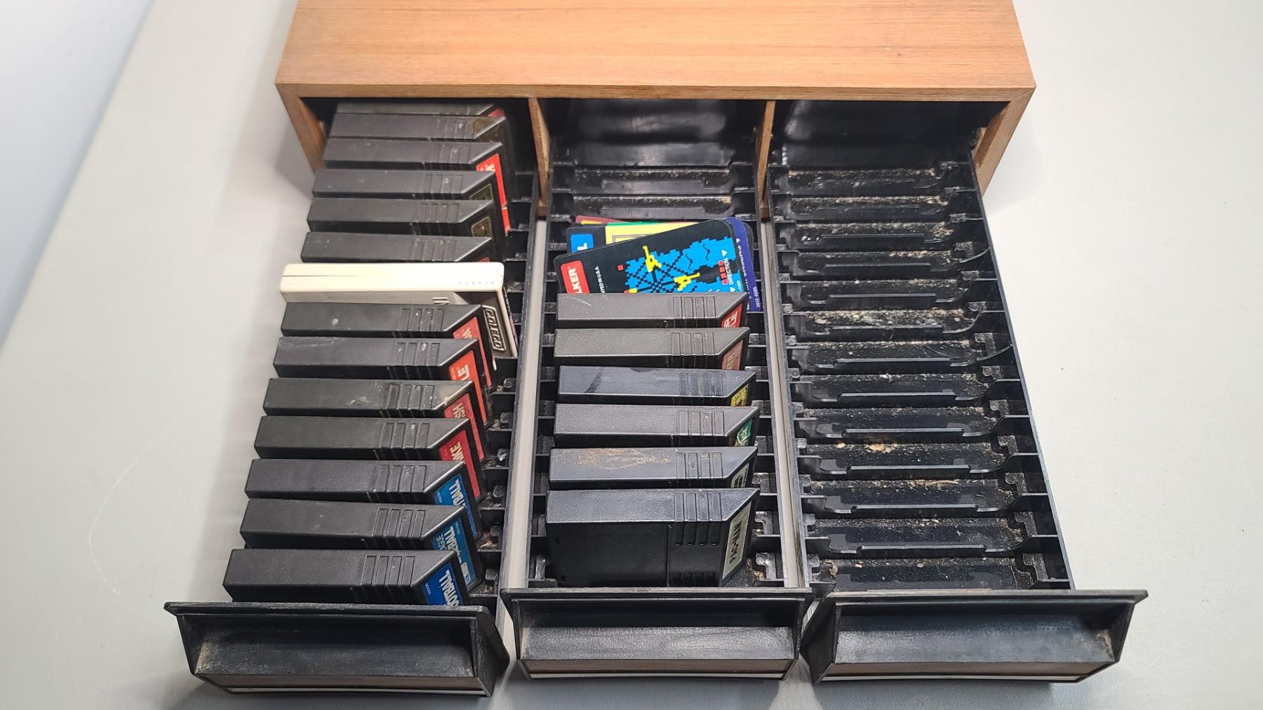 Assorted Vintage Atari 2600 And Intellivision Games & Game Overlays In Cassette Tape Storage Box - Untested