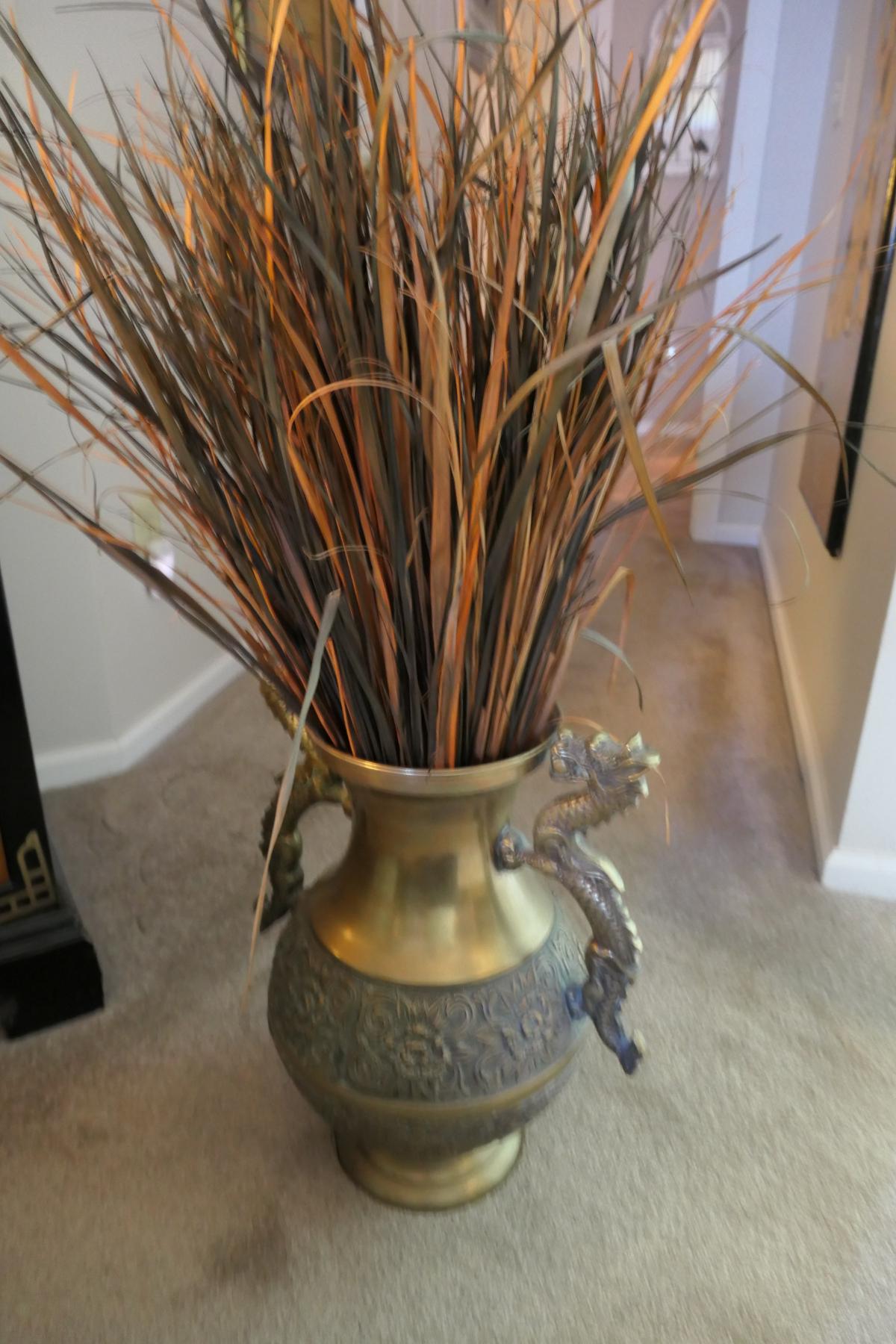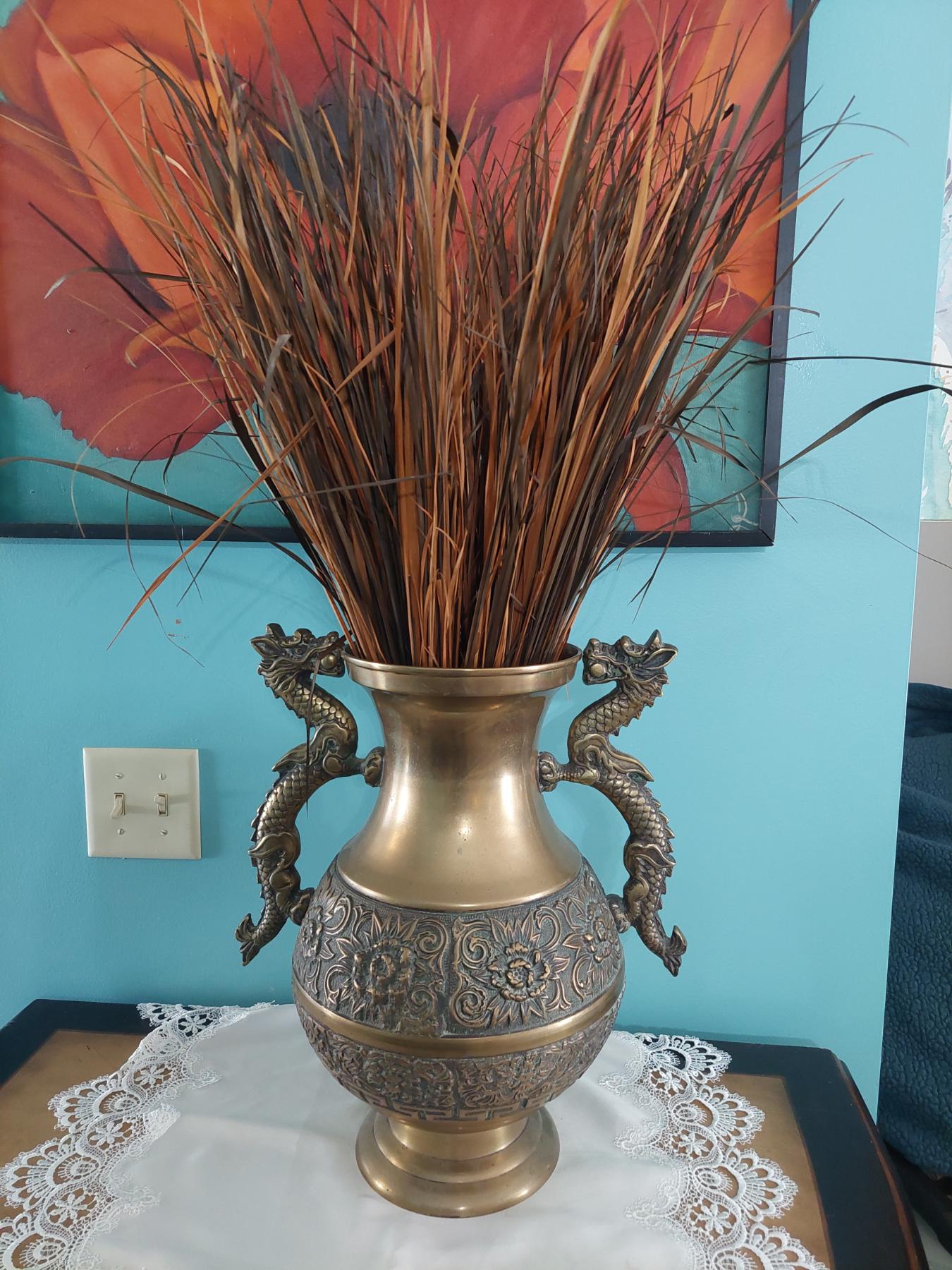 Vintage Brass Vase With Dragon Handles - 17" x 12" With Florals Shown