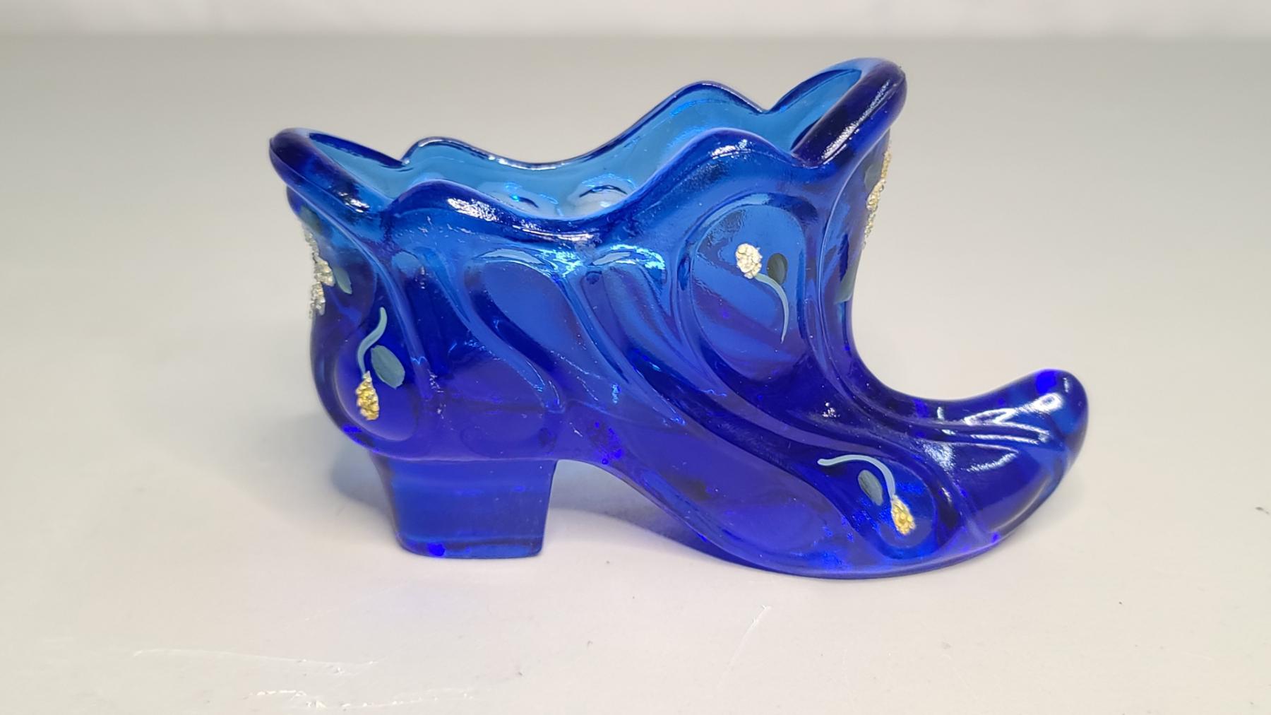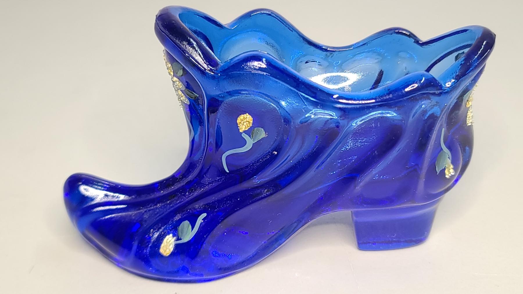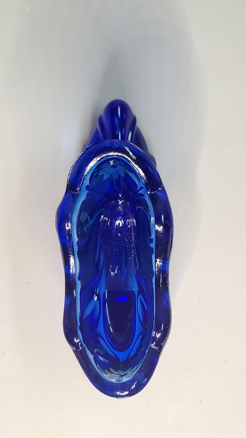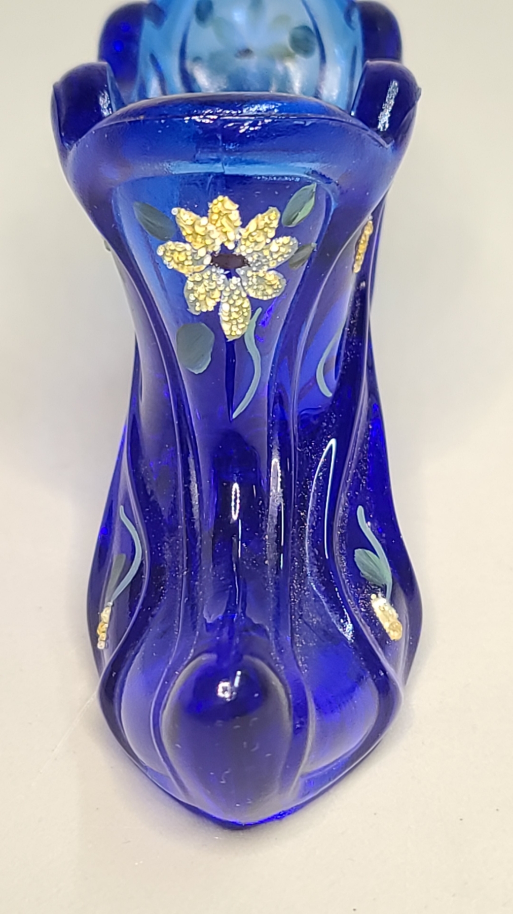 Vintage Fenton Cobalt Blue Hand Painted Artist Signed Glass Shoe