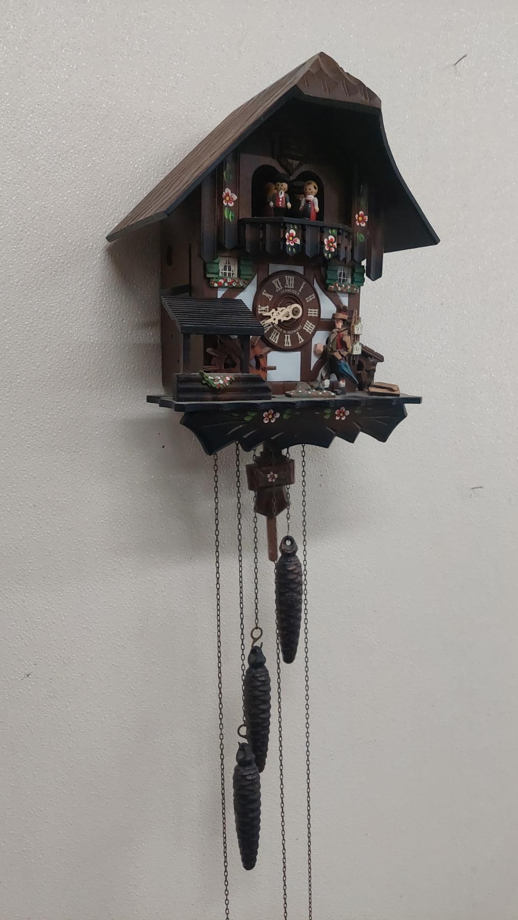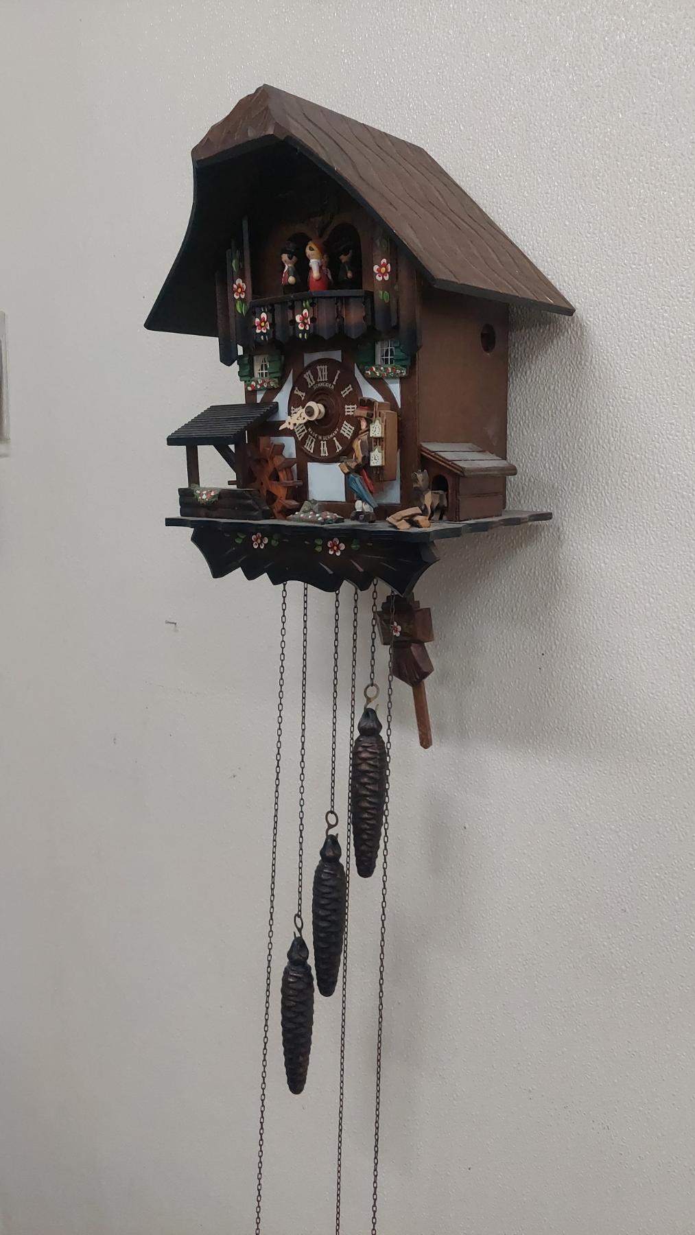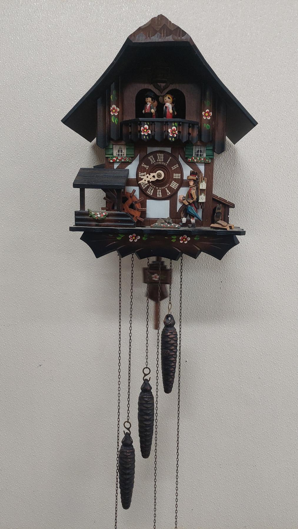 Vintage German Colorful Cuckoo Clock With Multiple Figures On Go Round - This is a very nice and colorful example of the superb craftsmanship Germany Is Proud Of in making these clocks. Intricate in detail and hand painted. Fully Intact and complete, but not tested for running condition.