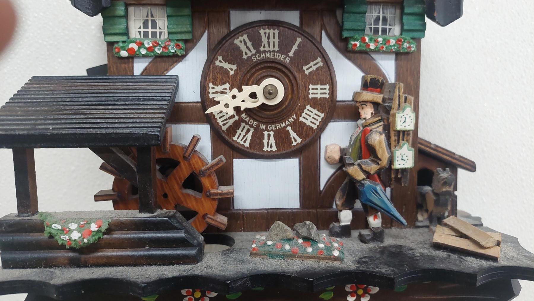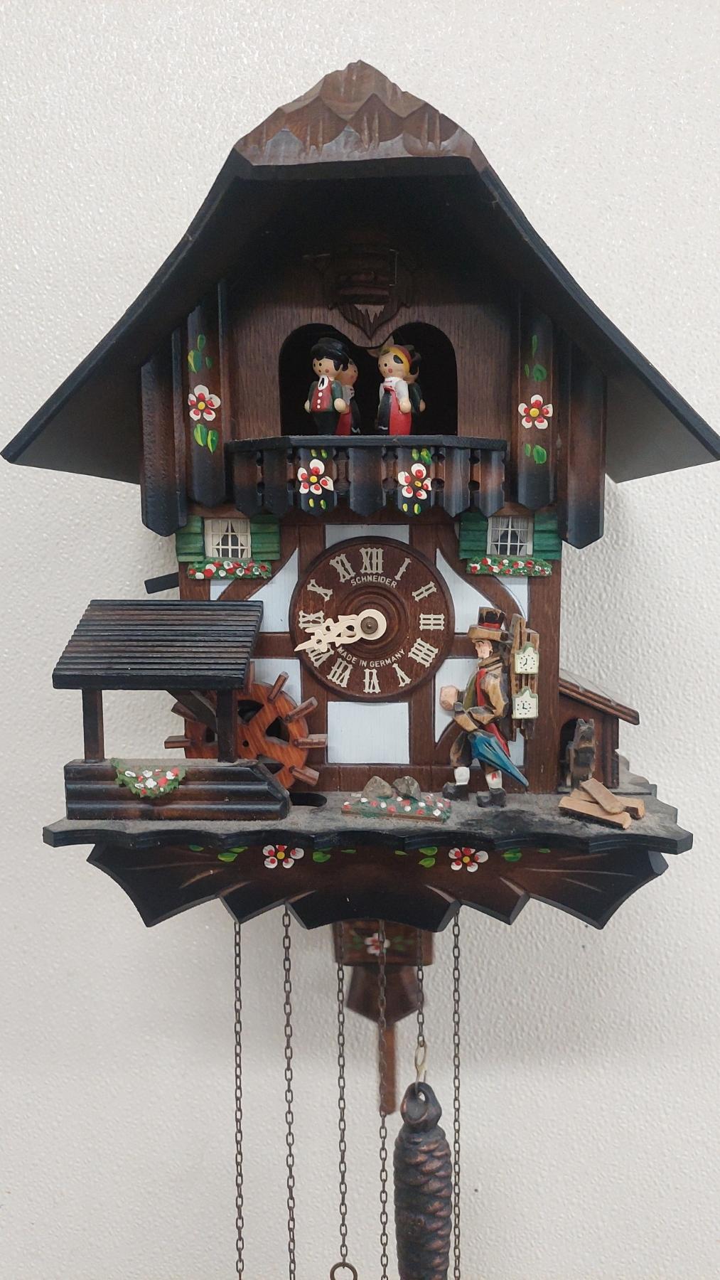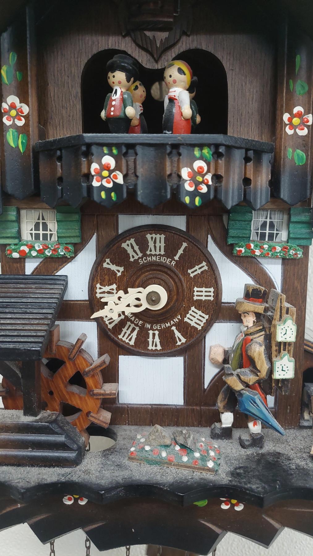 Vintage German Colorful Cuckoo Clock With Multiple Figures On Go Round - This is a very nice and colorful example of the superb craftsmanship Germany Is Proud Of in making these clocks. Intricate in detail and hand painted. Fully Intact and complete, but not tested for running condition.
