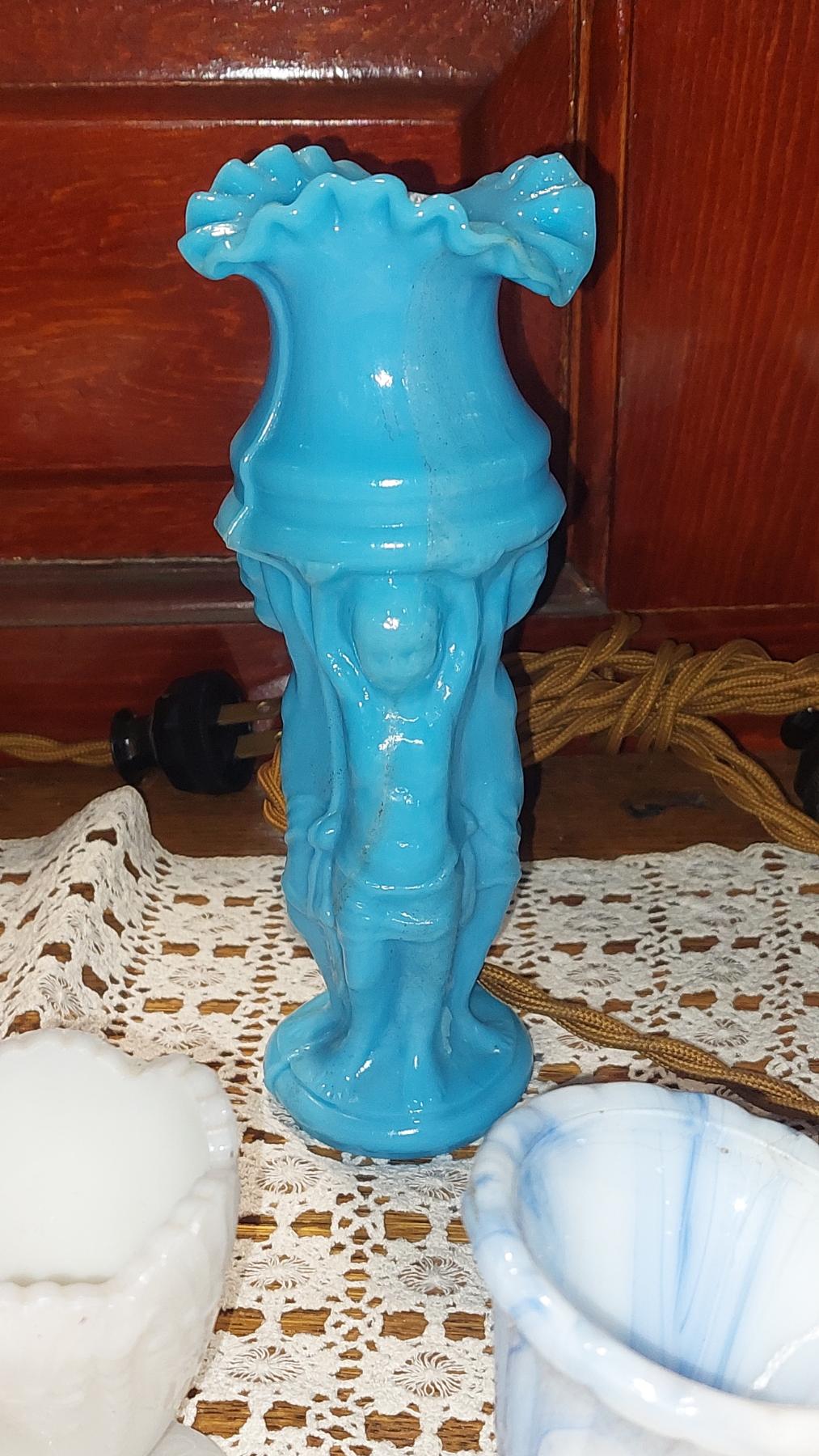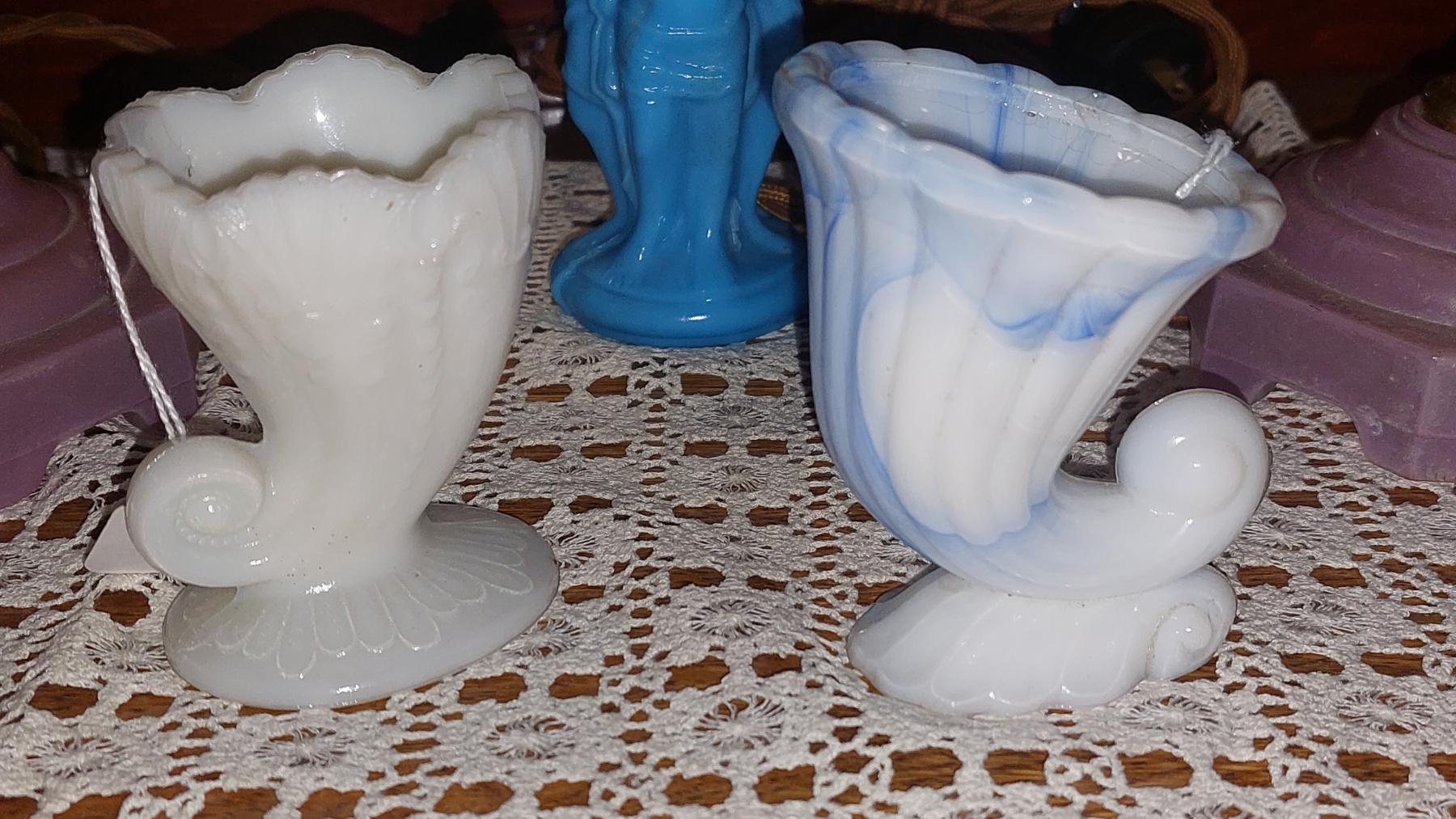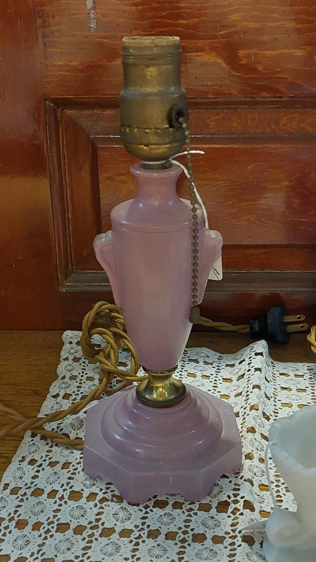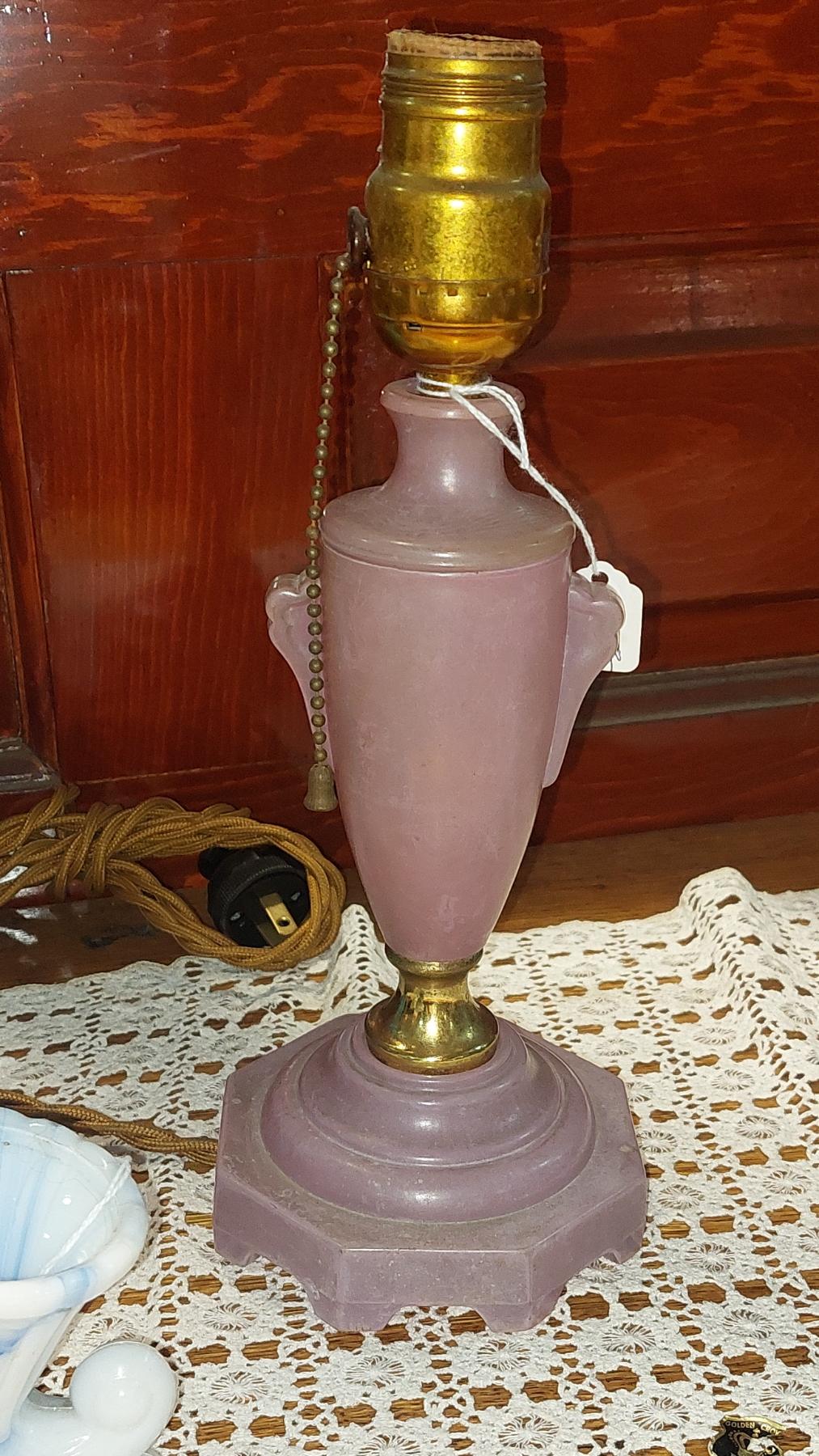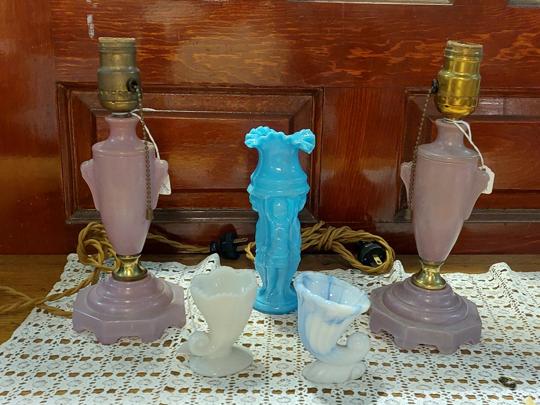 Vintage Group Lavender Glass Boudoir Lamps, Blue Art Nouveau Vase & Mini Cornucopea's - See Pics