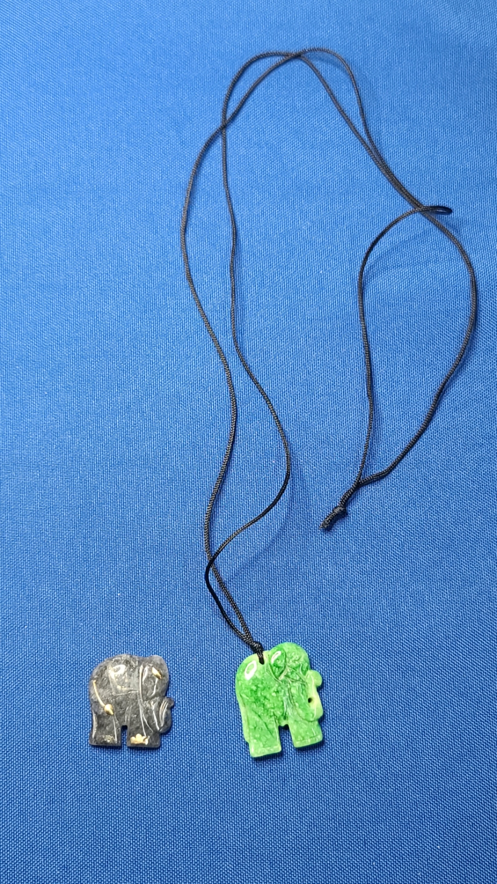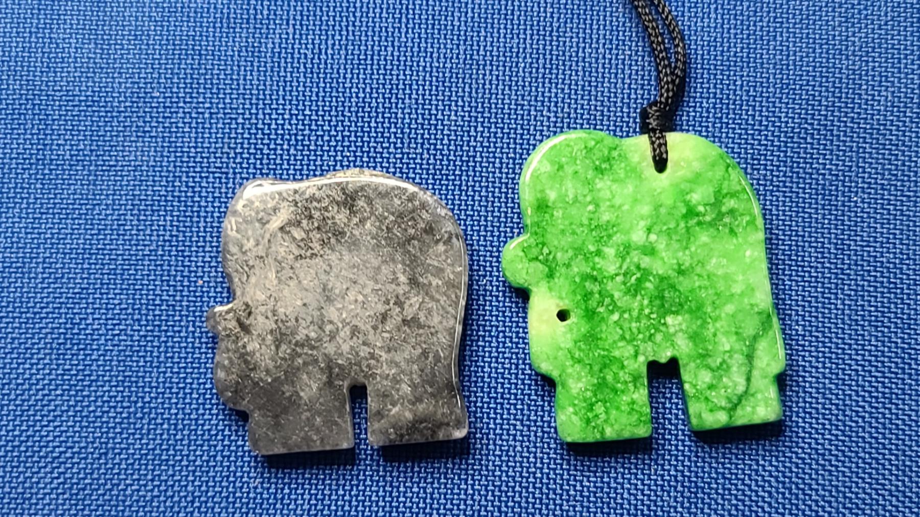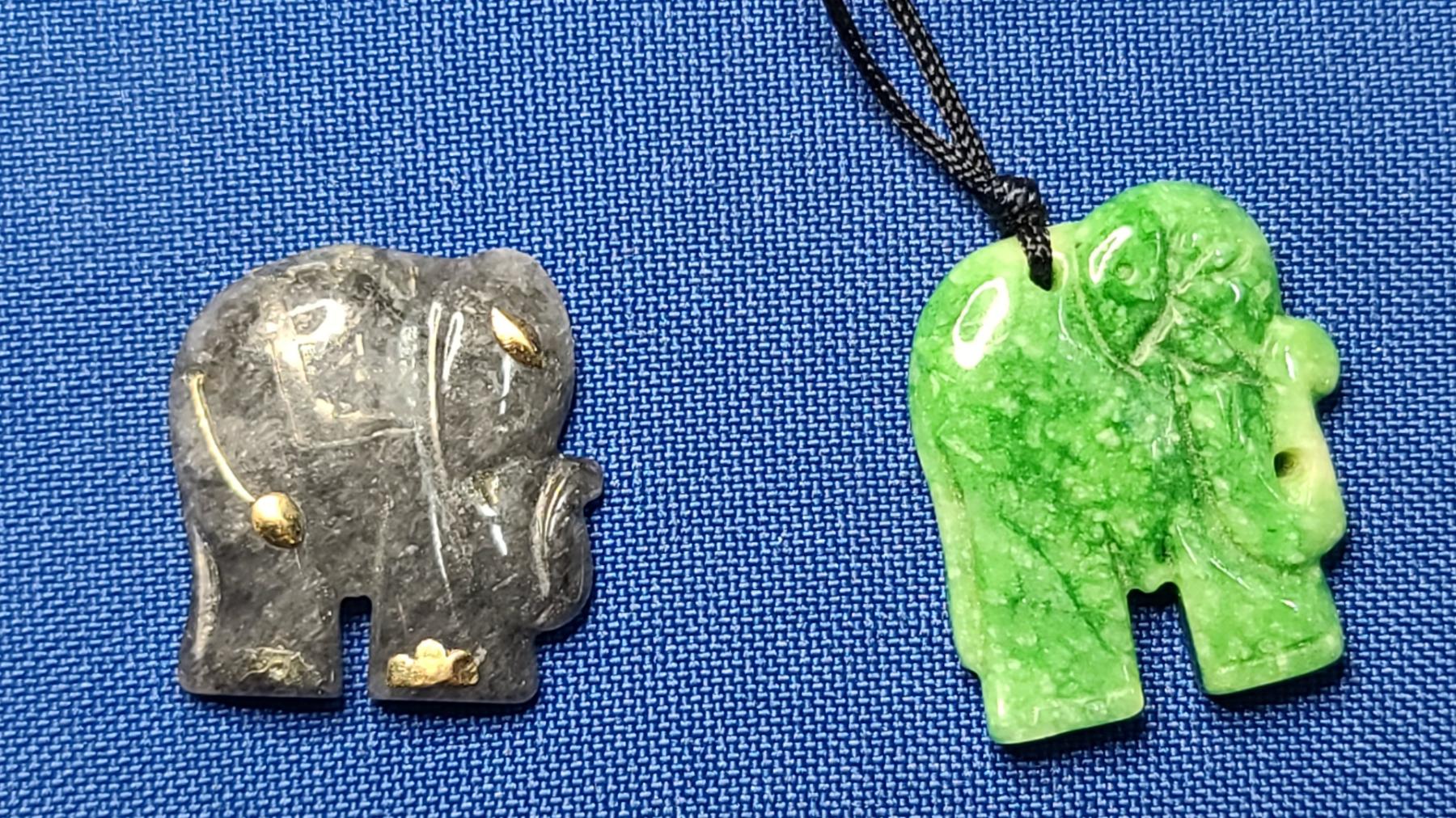 Vintage Hand Carved Green Chinese Jadeite Jade Elephant Pendant & Black Jadeite Carved Elephant