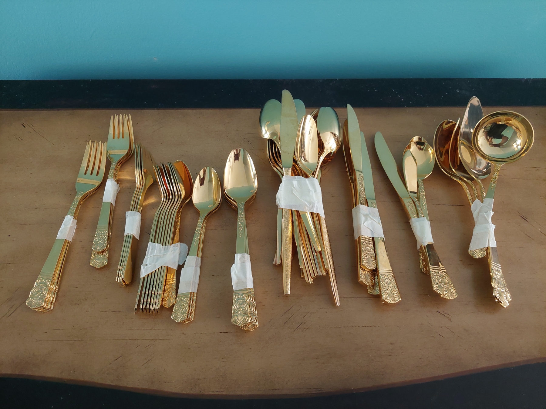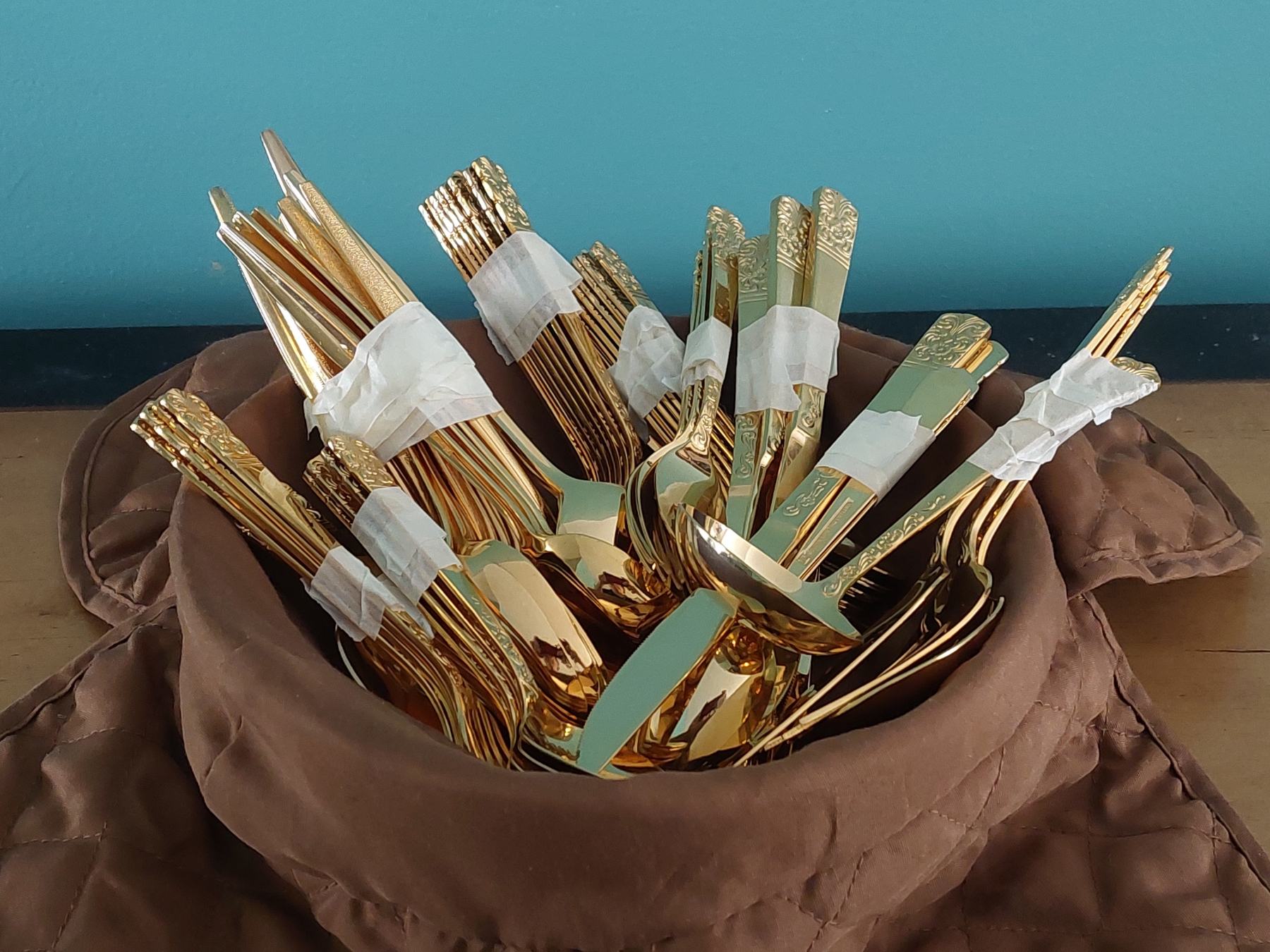 Vintage Set Of "Golden Lifetime Cutlery" In Unused Condition - 6 Dinner Forks - 6 Salad Forks - 12 Tea Spoons - 12 Dinner Spoons - 12 Soup Spoons - 7 Knives - 5 Serving Pcs - Includes Bucket Shown