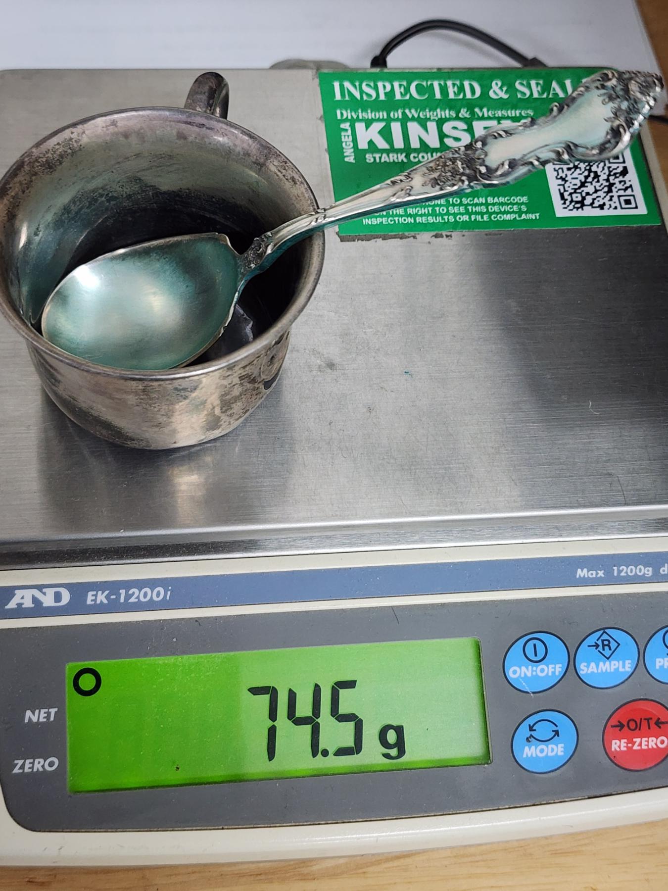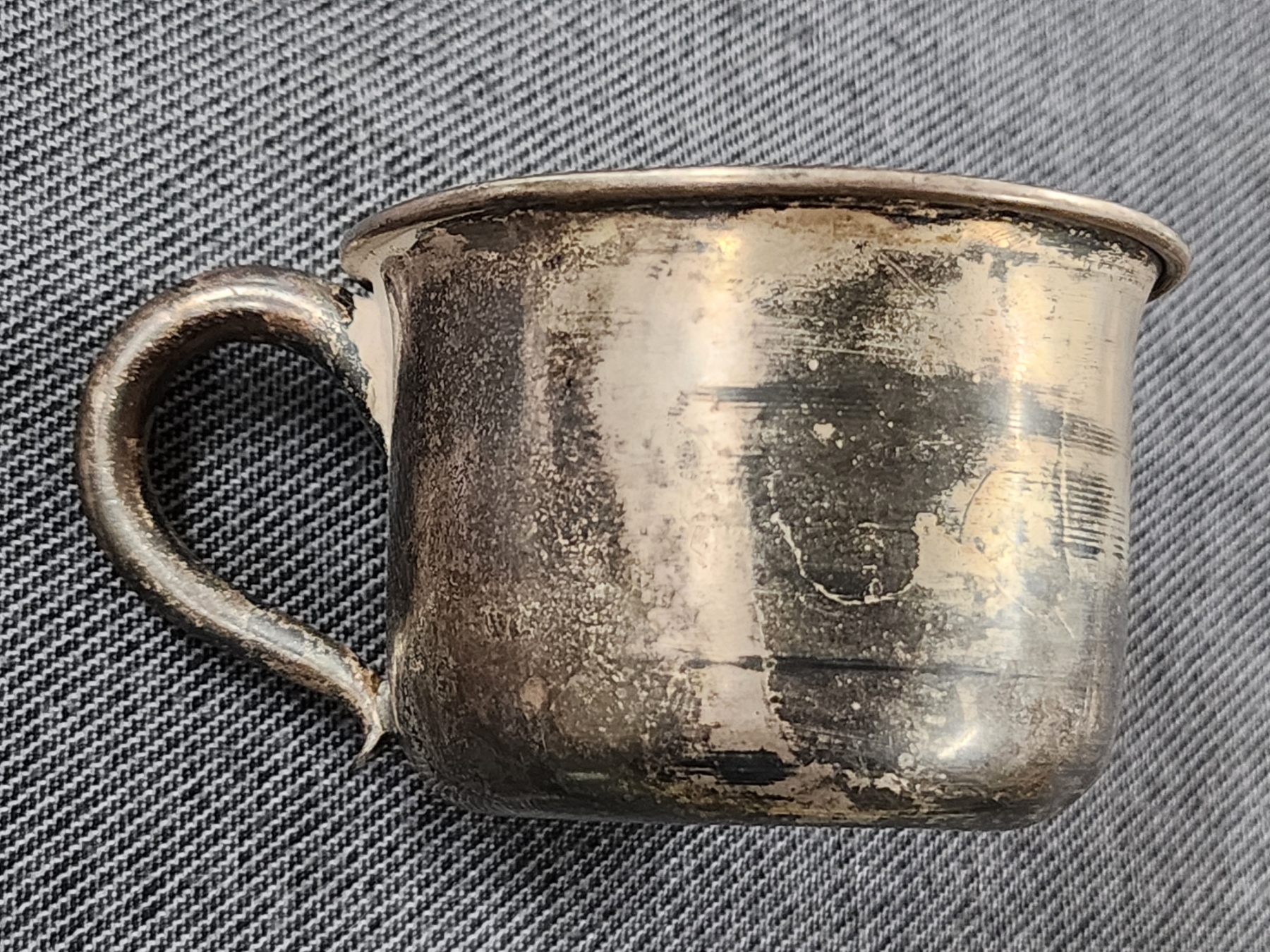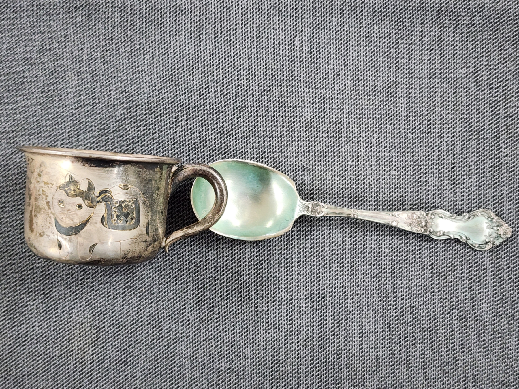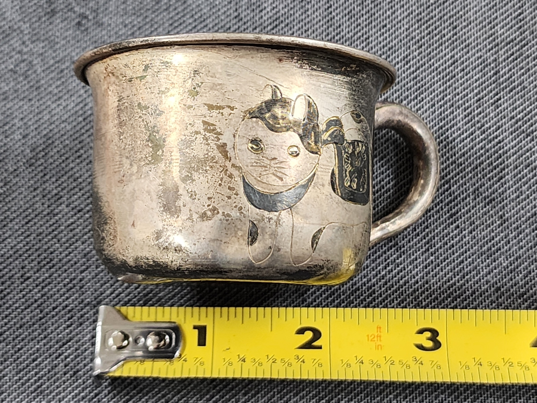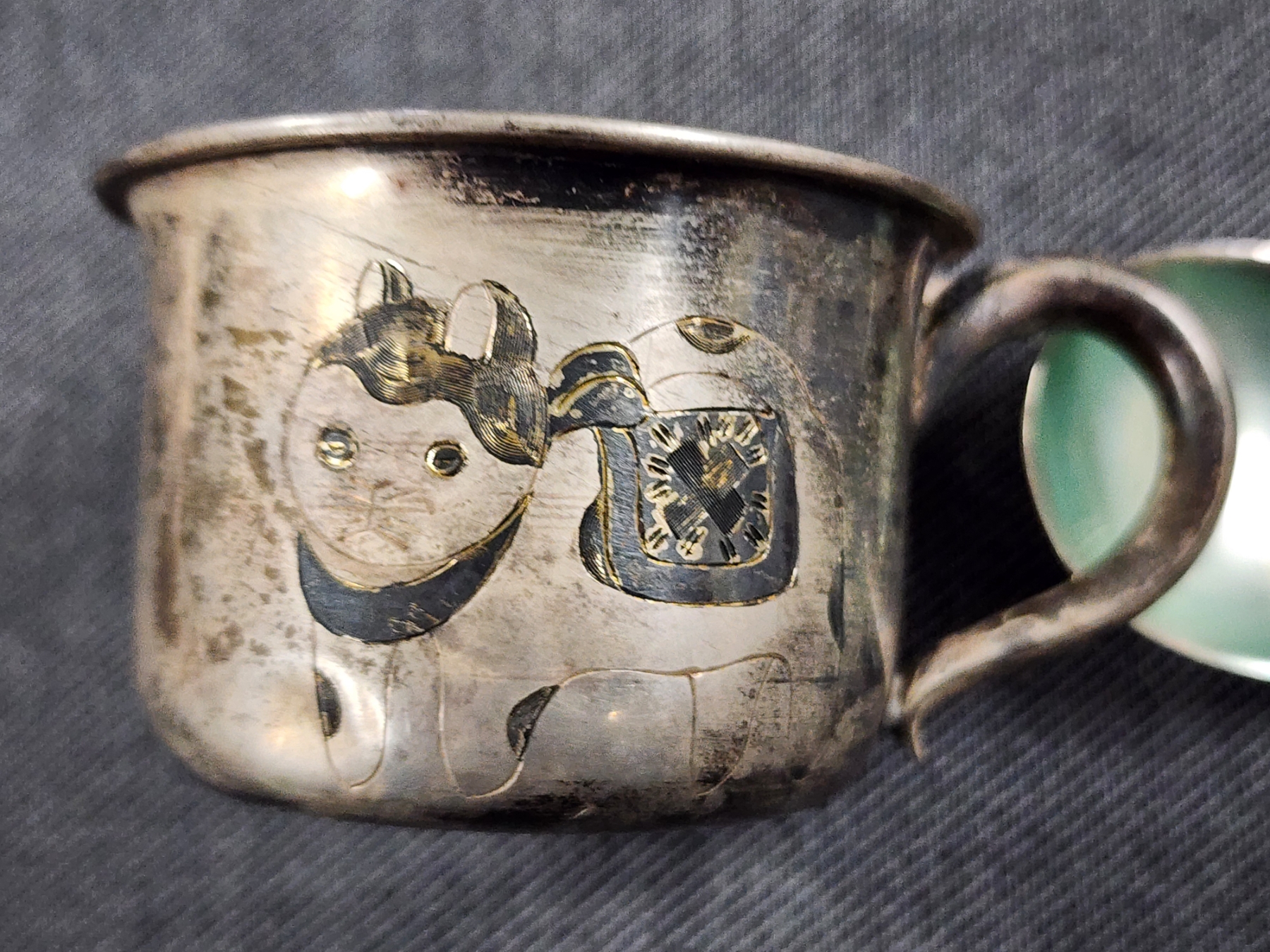 Vintage Sterling Silver Spoon & Small Cup Ft. Engraved Cat Picture Weighing 74.5 Grams