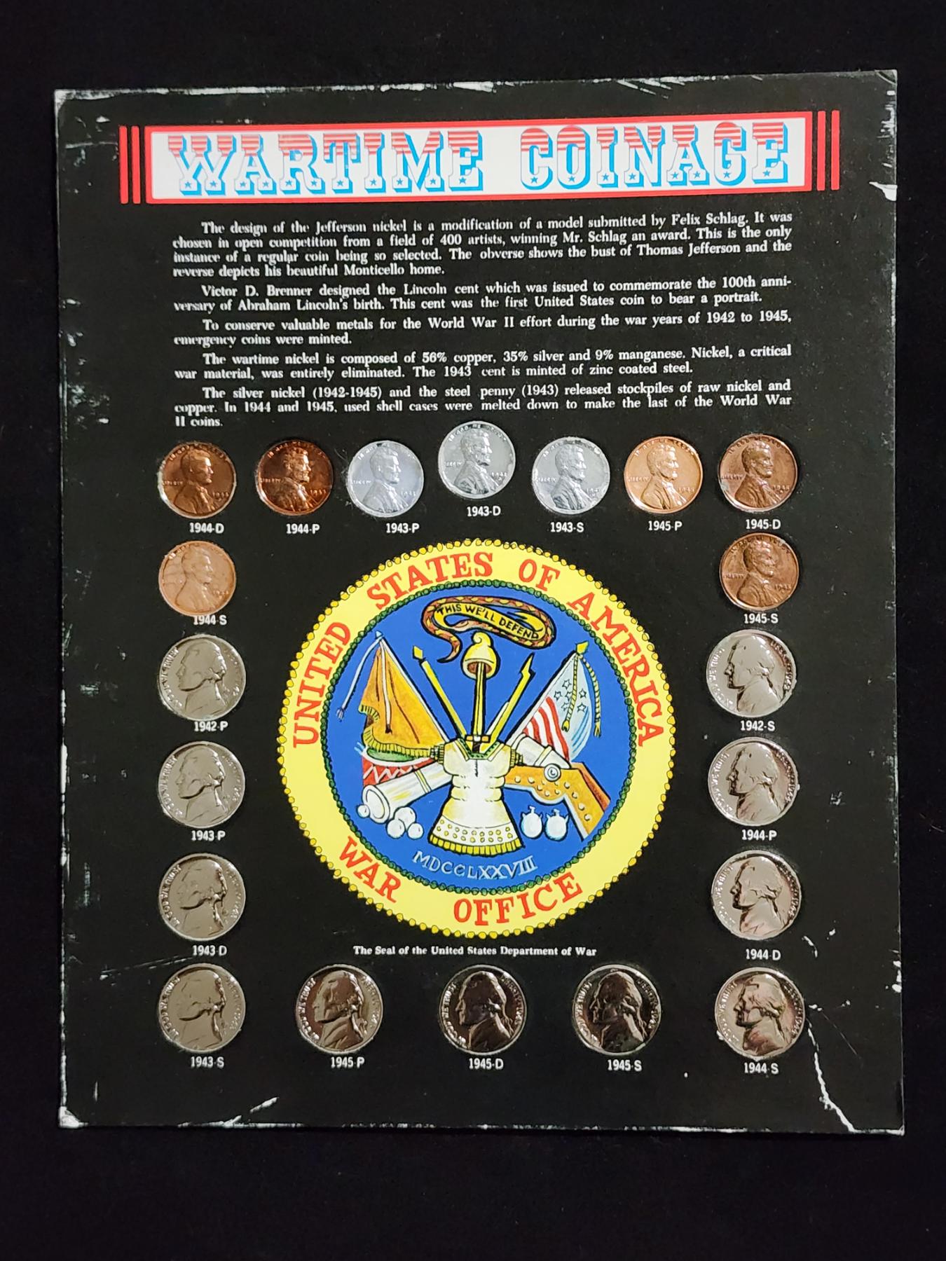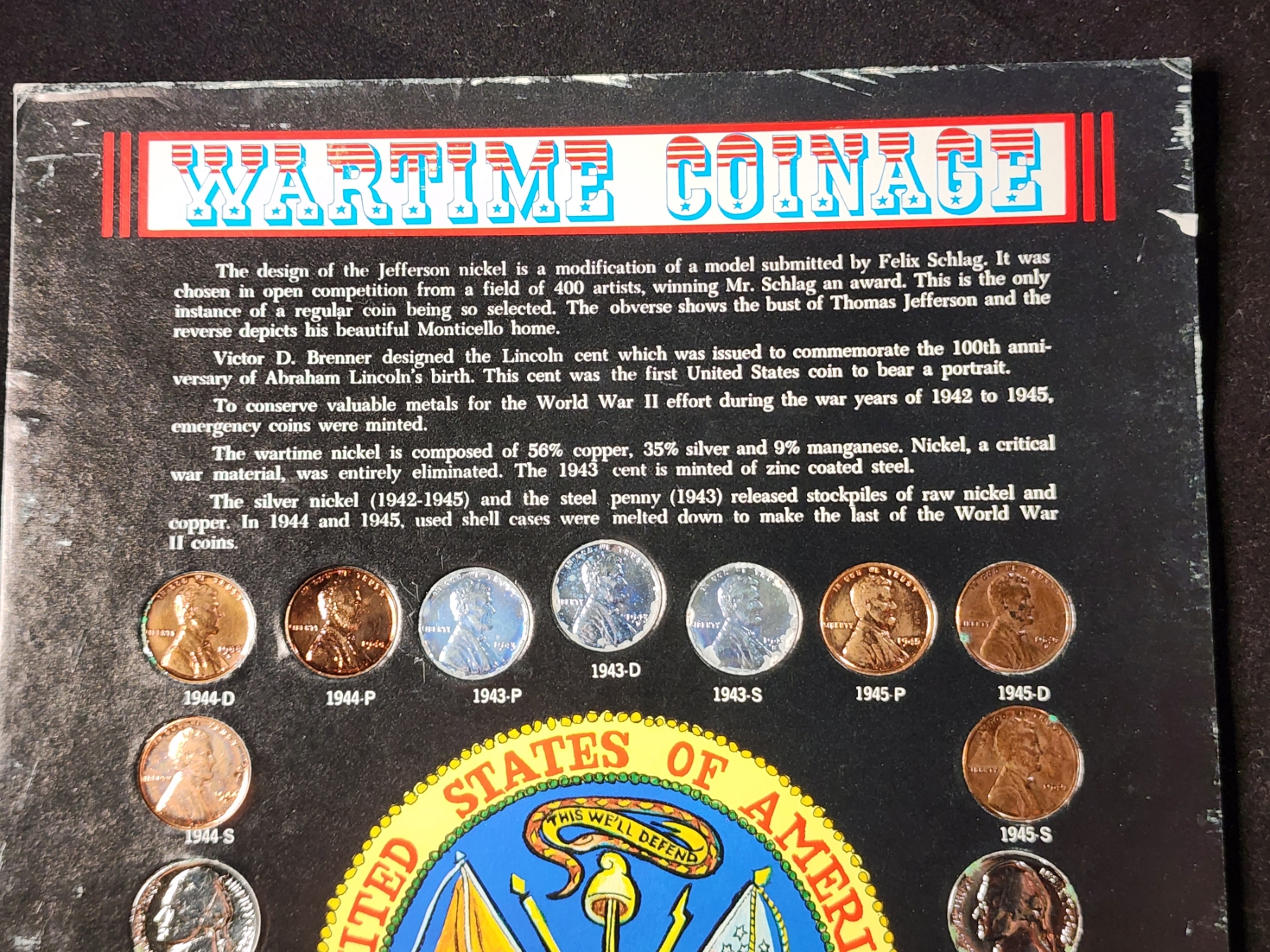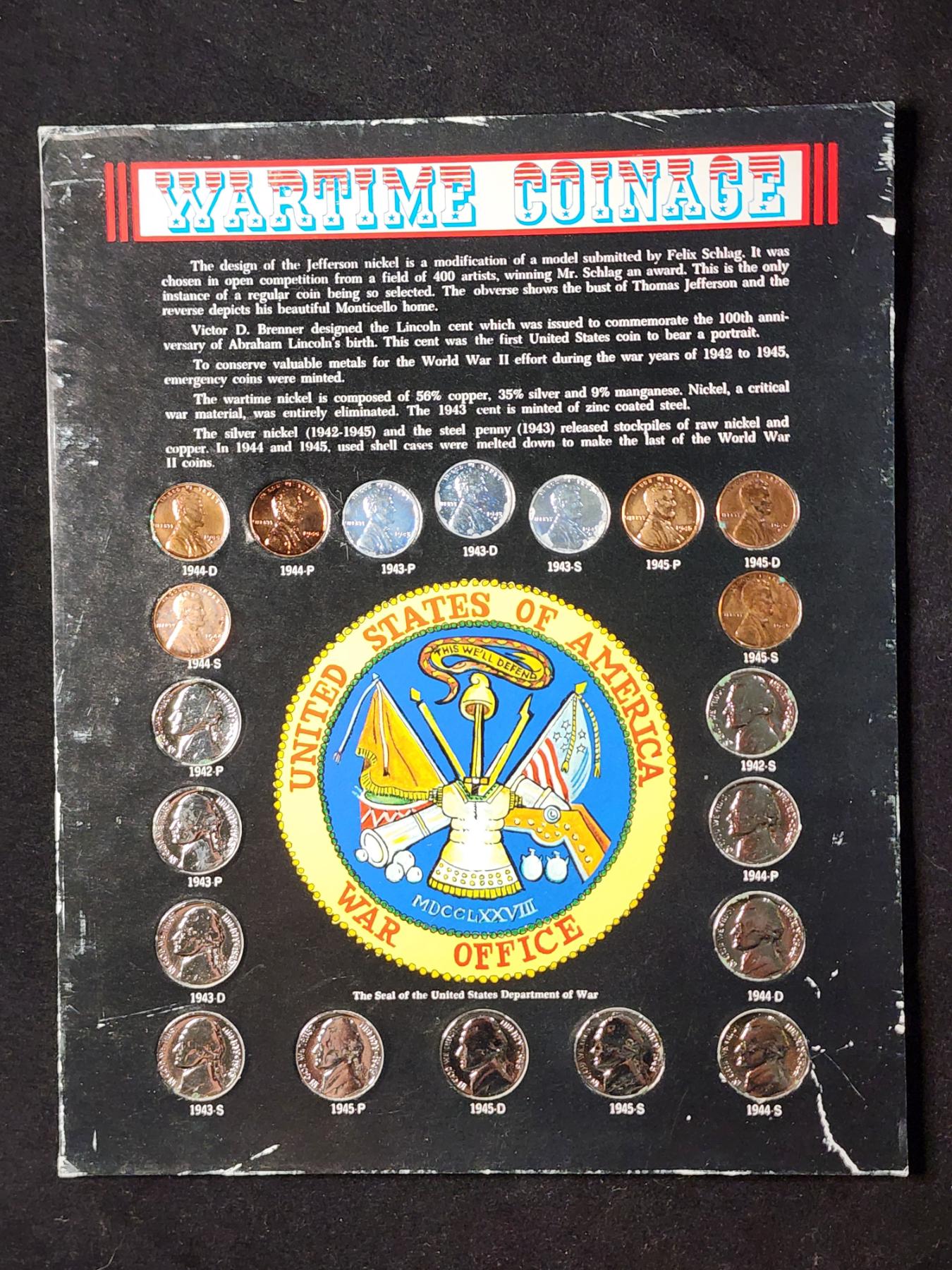 Wartime Coinage Display Ft. Wheat & Steel Pennies Along With Silver Wartime Nickels - Total Face Value = $0.64