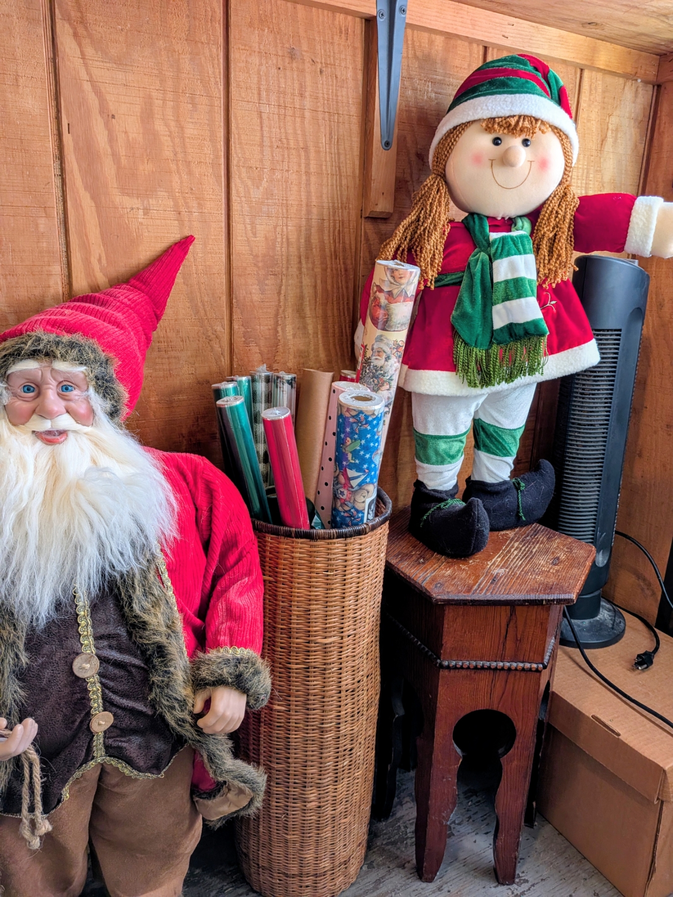 Wood Stool, 34" Santa, 26" Elf, Tall Basket With Wrapping Paper