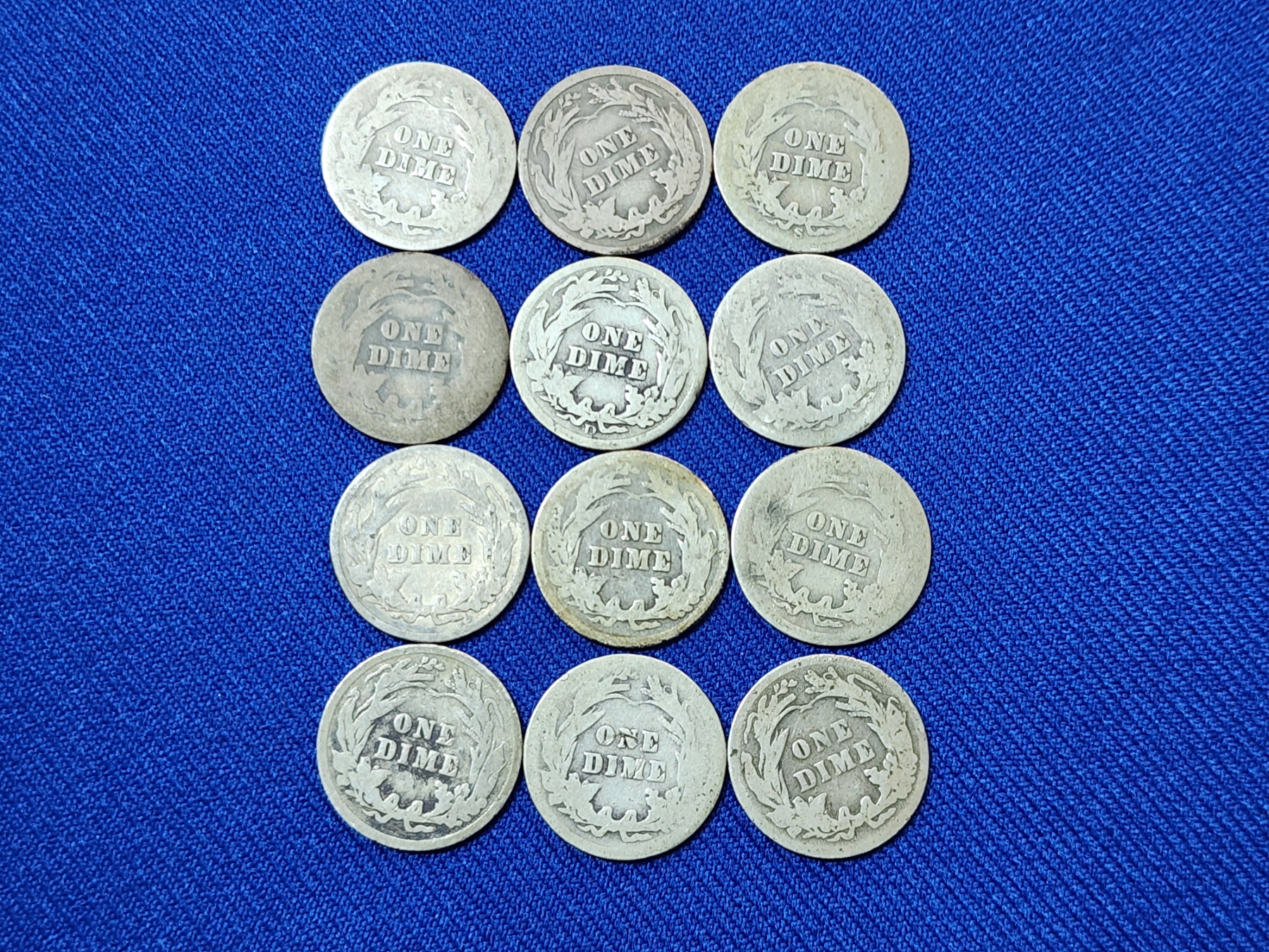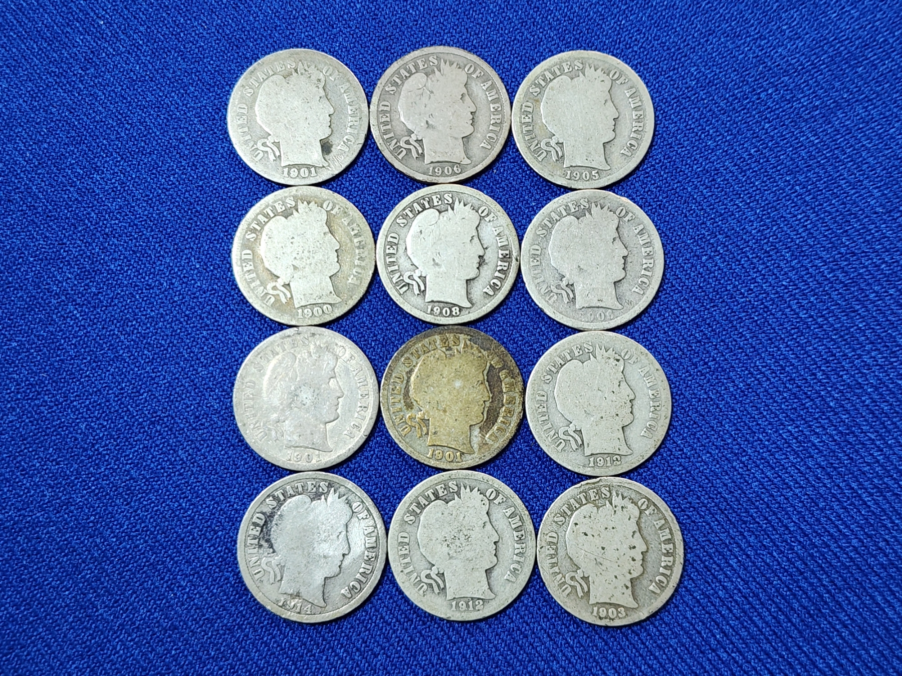 x12 Assorted Years 90% Silver Barber Dimes FV: $1.20