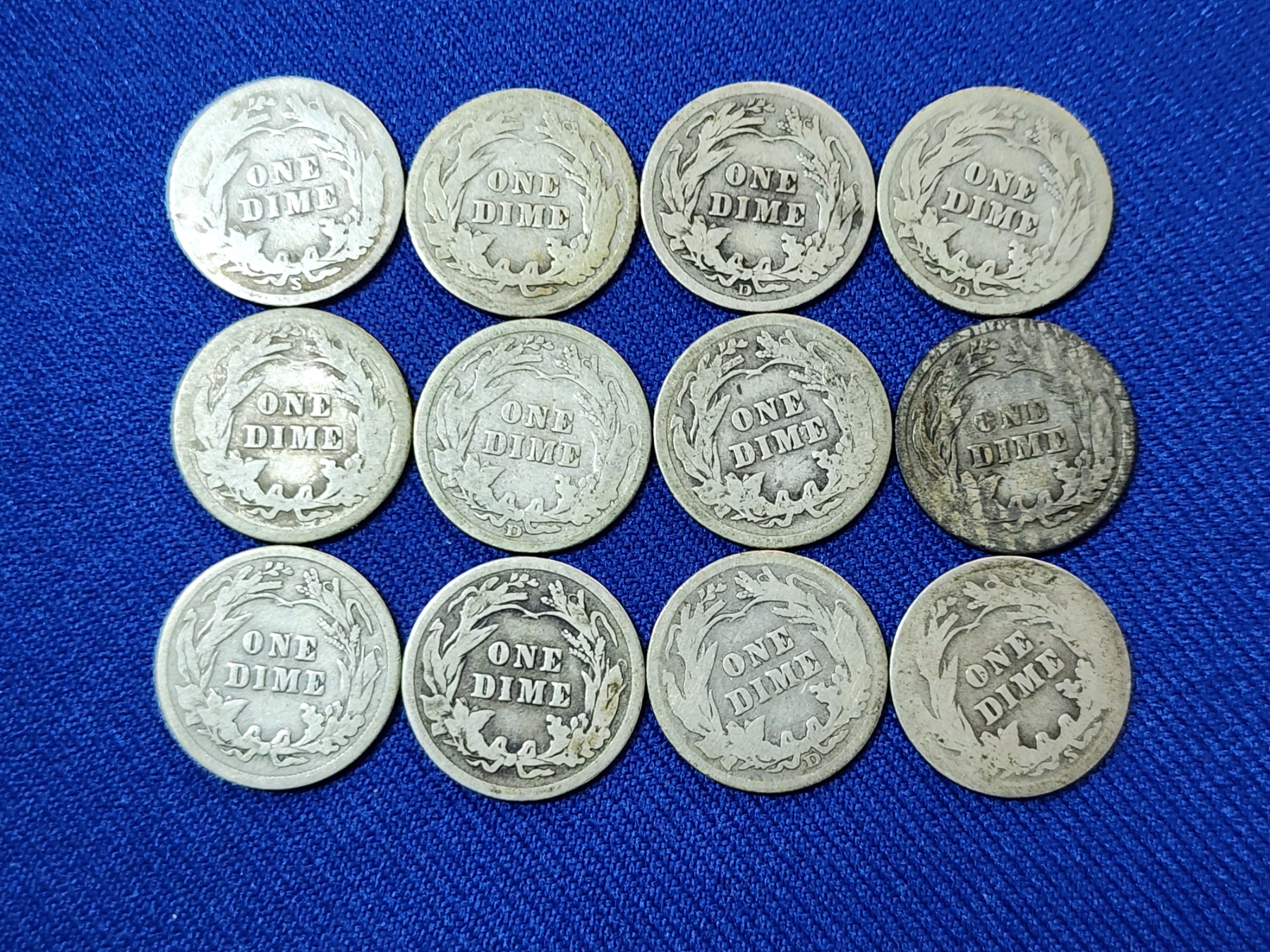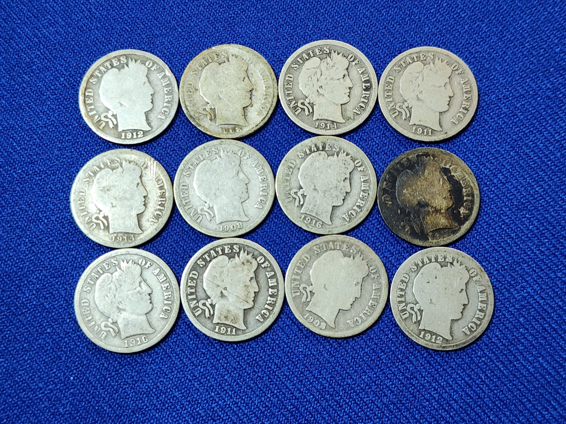 x12 Assorted Years 90% Silver Barber Dimes FV: $1.20